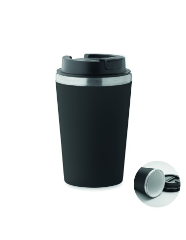 Bicchiere a doppio strato in PP con parete interna in acciaio inox riciclato (90% acciaio inox riciclato e 10% acciaio inox) e rivestimento interno in ceramica. Senza perdite. Capacità: 350 ml.