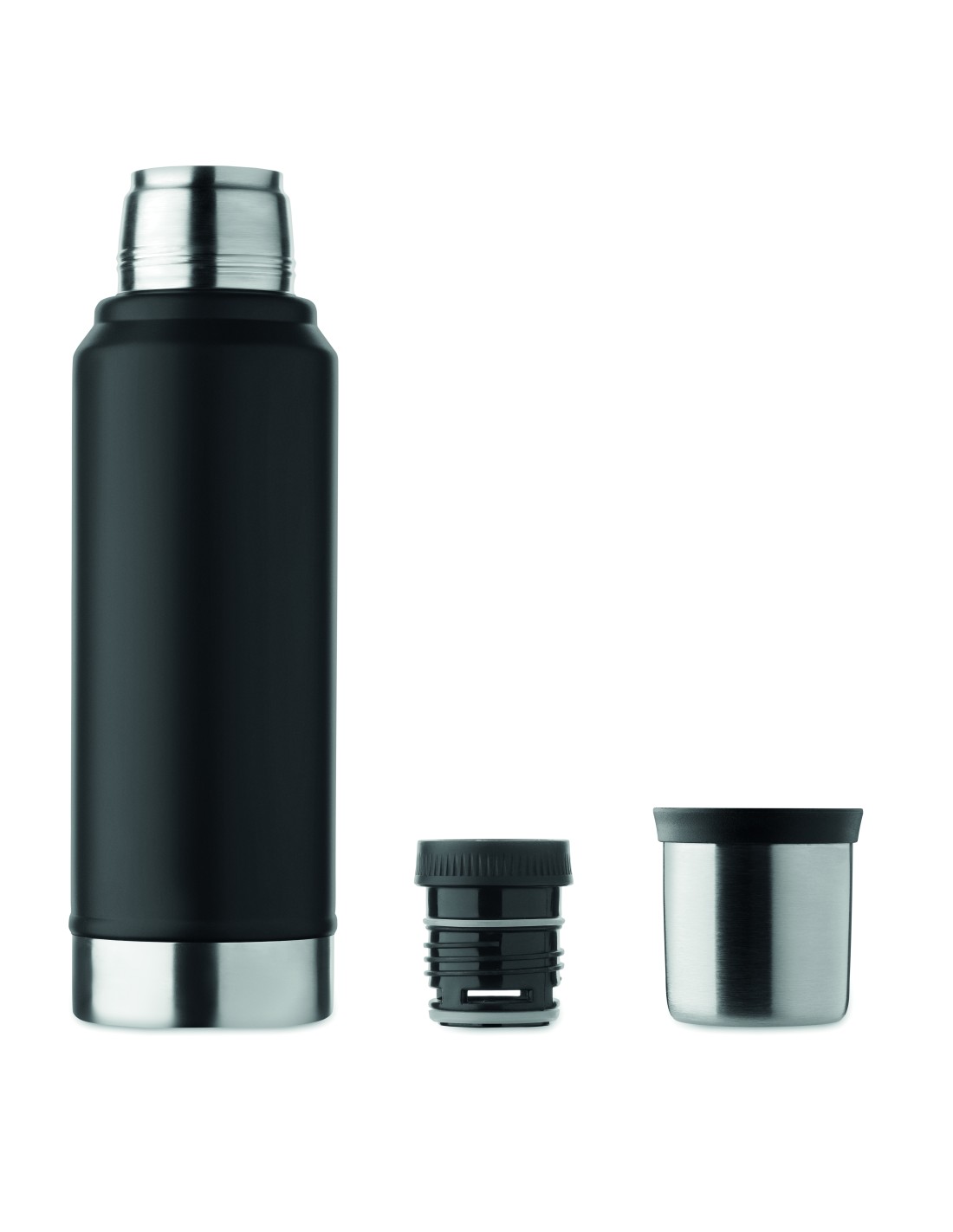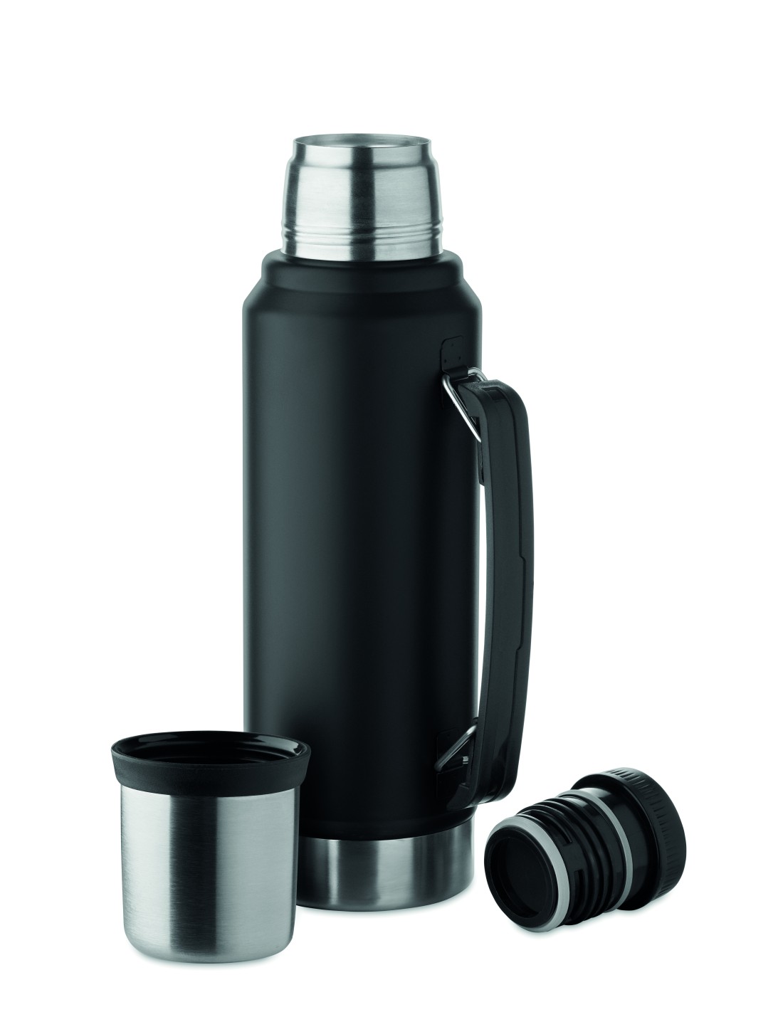 Bottiglia isolante a doppio strato in acciaio inox riciclato (90% acciaio inox riciclato e 10% acciaio inox) con manico laterale. Con coperchio in PP e tazza in acciaio inox riciclato. Senza perdite. Capacità: 1L.