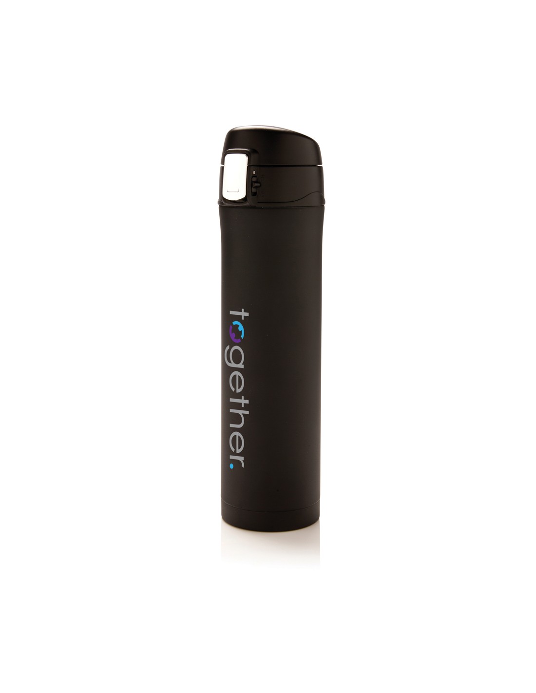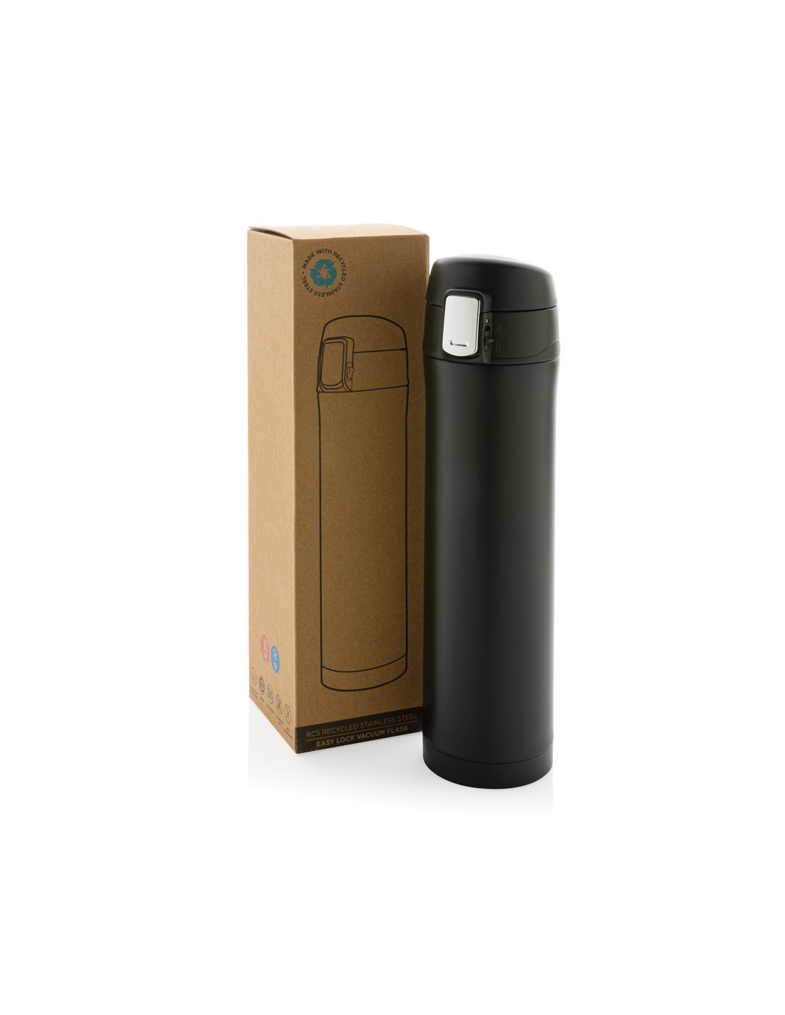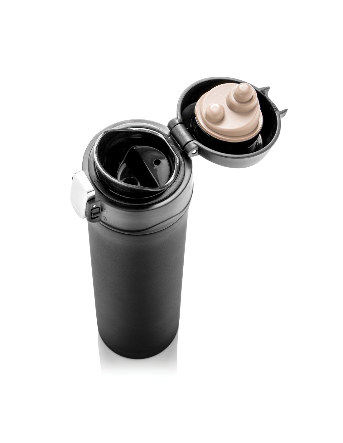 Borraccia a doppio strato in acciaio inox riciclato (90% acciaio inox riciclato e 10% acciaio inox) con chiusura di sicurezza sul coperchio e possibilità di apertura a pressione. Senza perdite. Capacità: 300 ml.