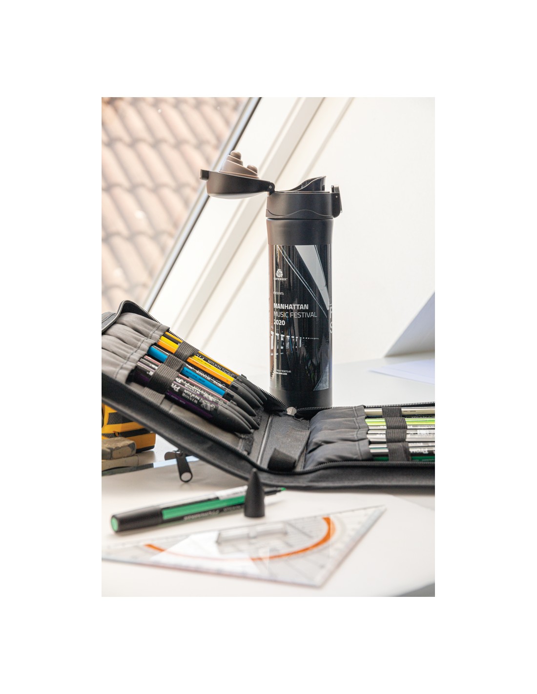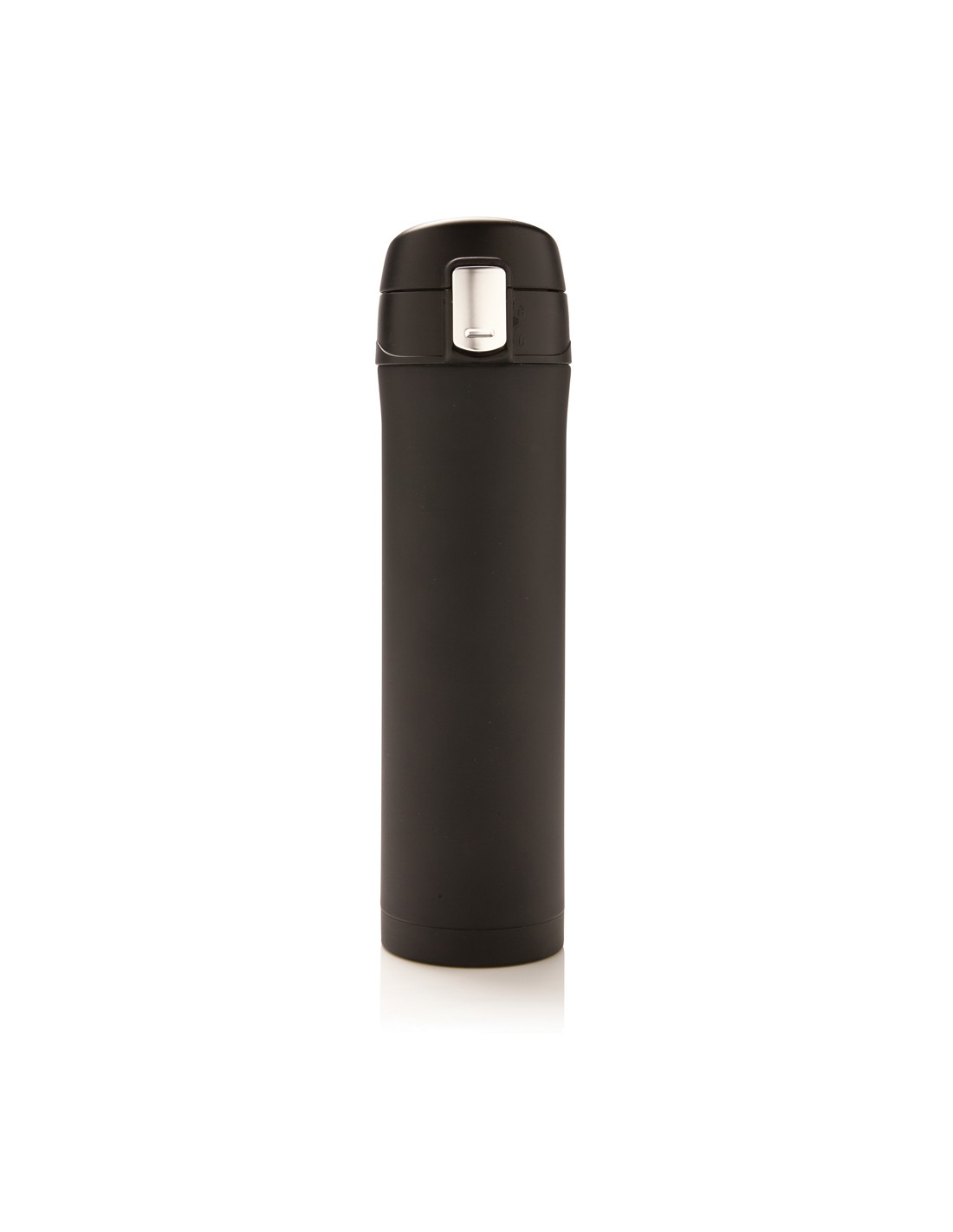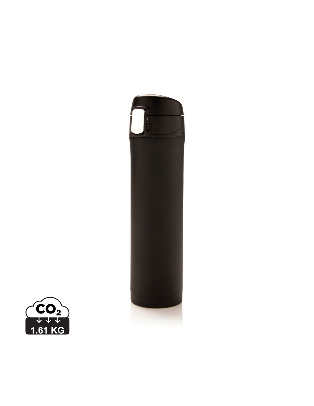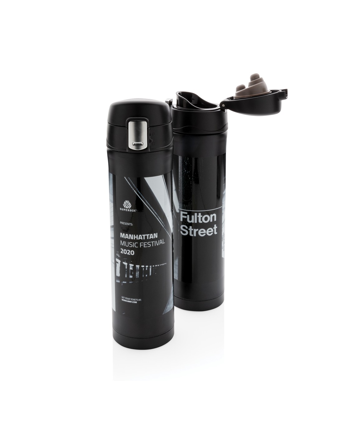 Borraccia a doppio strato in acciaio inox riciclato (90% acciaio inox riciclato e 10% acciaio inox) con chiusura di sicurezza sul coperchio e possibilità di apertura a pressione. Senza perdite. Capacità: 300 ml.