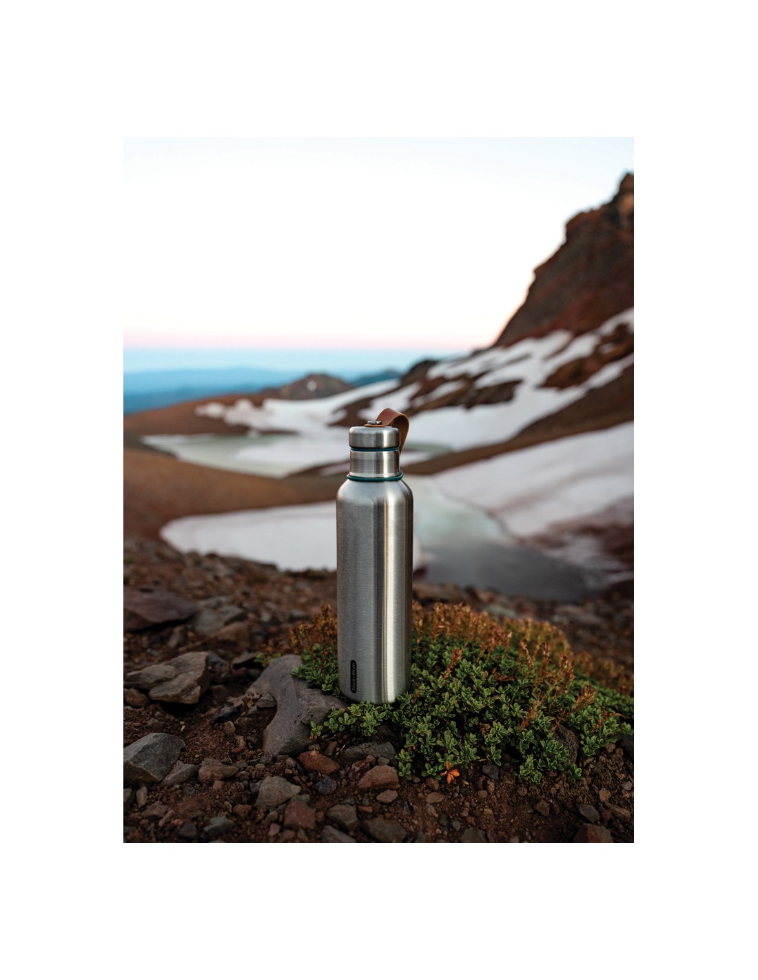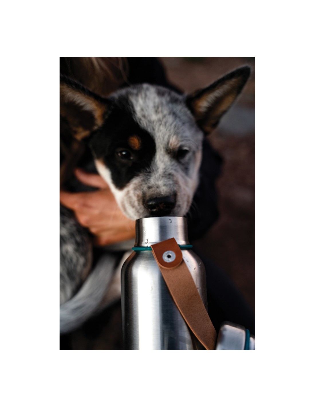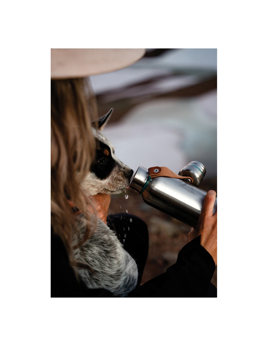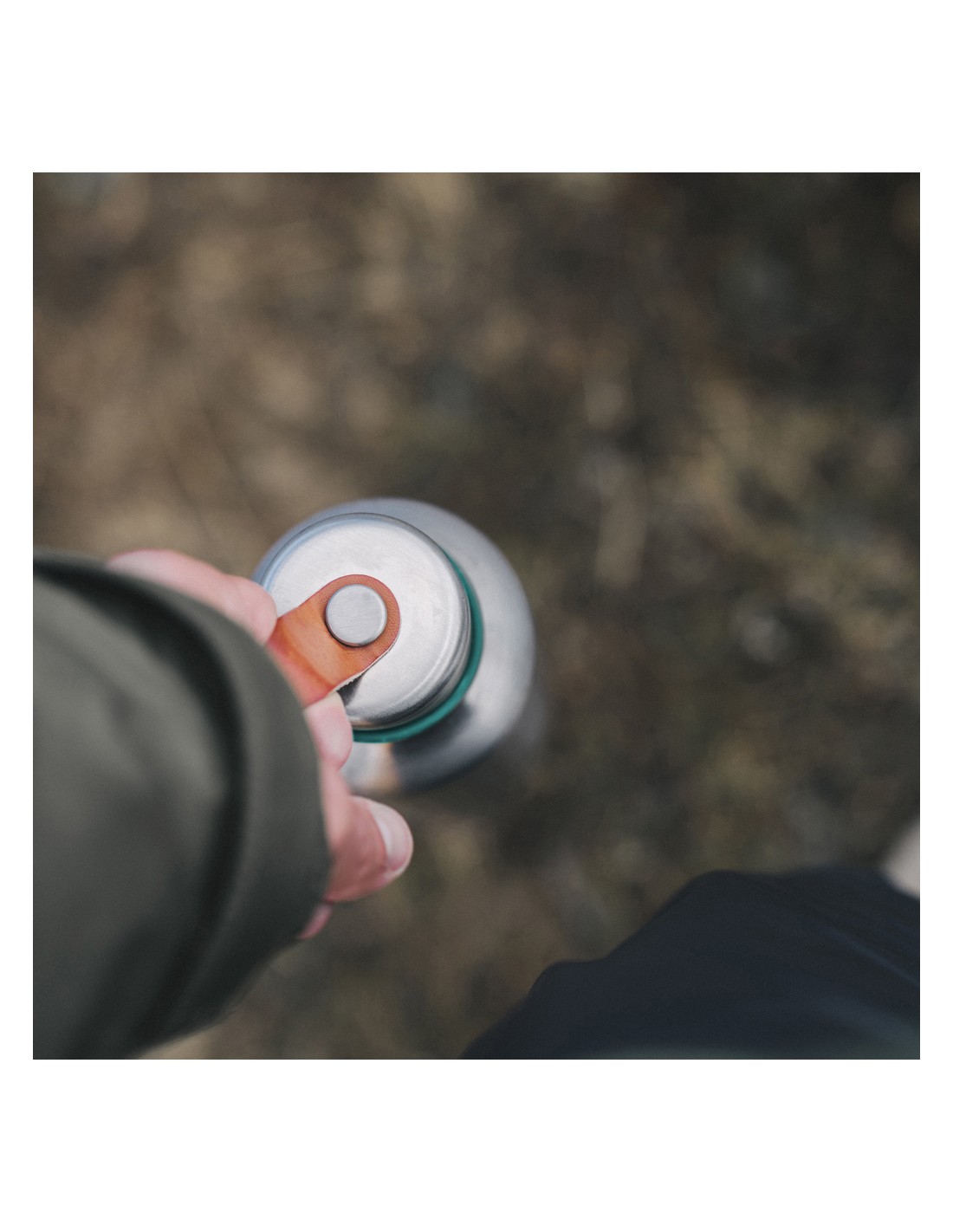 Bottiglia termica in acciaio inossidabile sigillata sottovuoto che mantiene le bevande fredde per 24 ore o calde per 12 ore. Anche il tappo è completamente in acciaio inossidabile, il che significa che l'acqua non entra in contatto con la plastica. Il laccio in finta pelle funge da passante per il trasporto e da dettaglio di design. Lavaggio solo a mano.