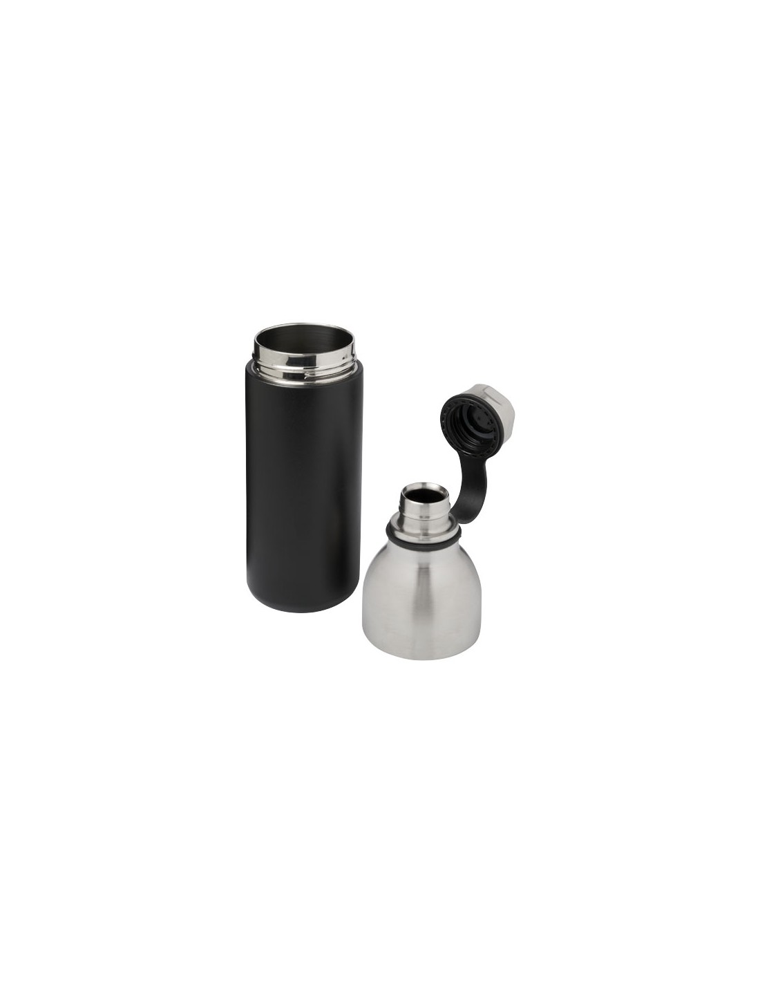 Borraccia termica in rame a doppia parete in acciaio inossidabile con certificazione RCS dotata di tazza rimovibile, anc'essa con isolamento a doppia parete. Questa borraccia multiuso è progettata per essere inserita nella tasca laterale di uno zaino ed è dotata di un comodo manico per il...