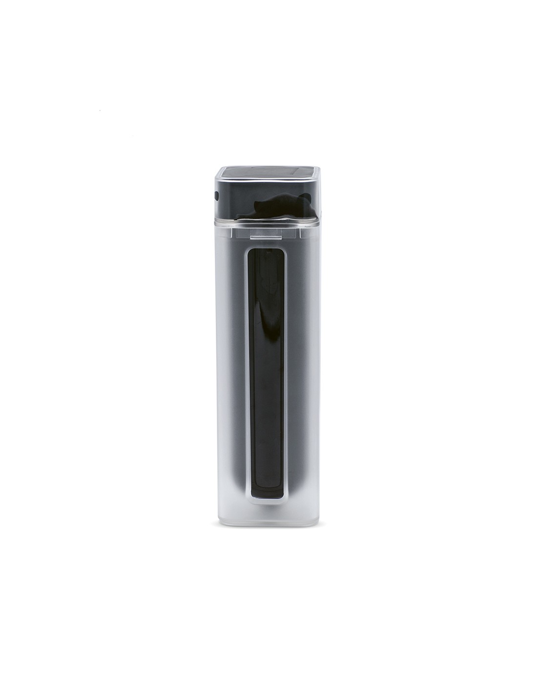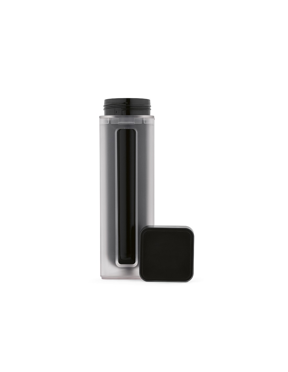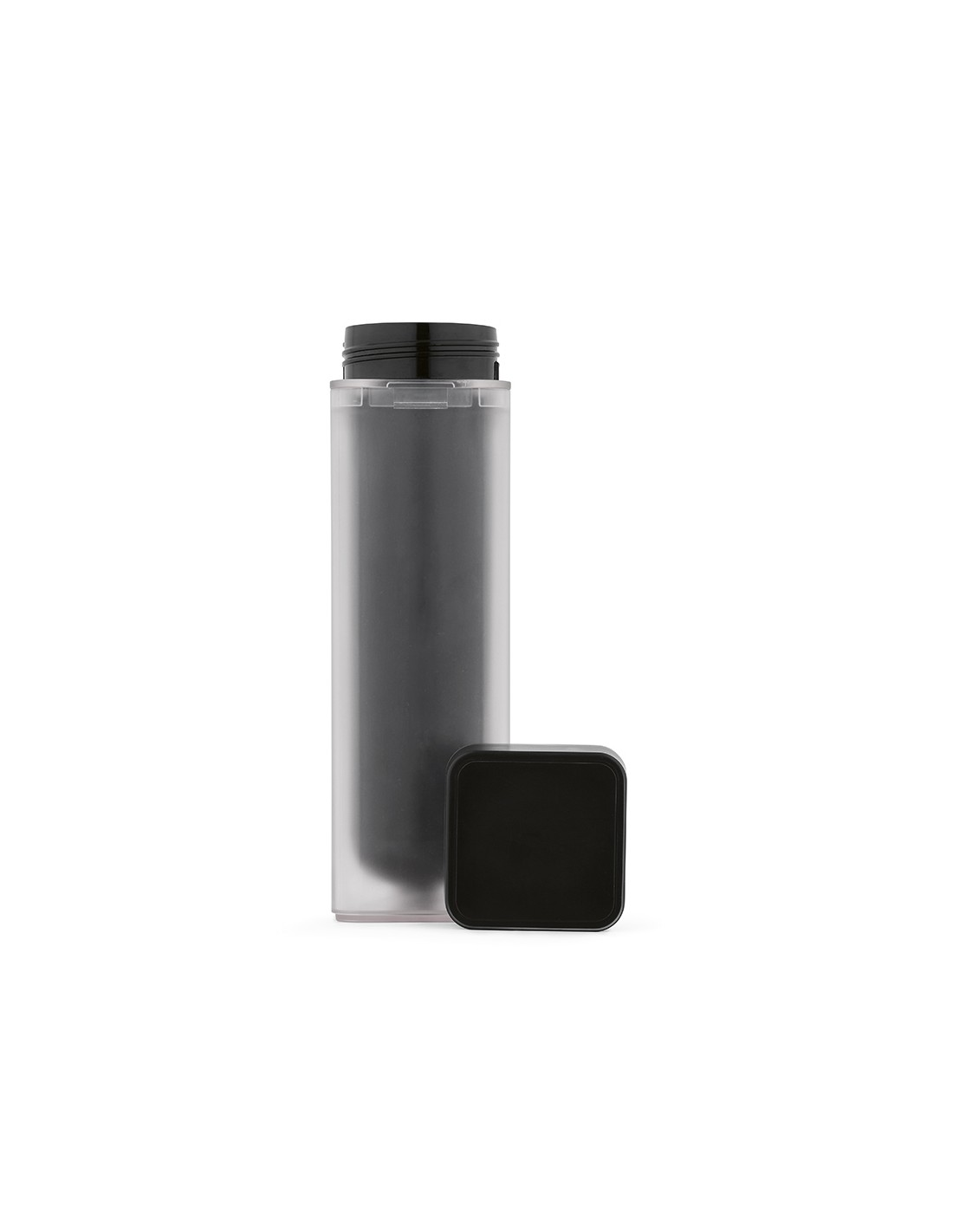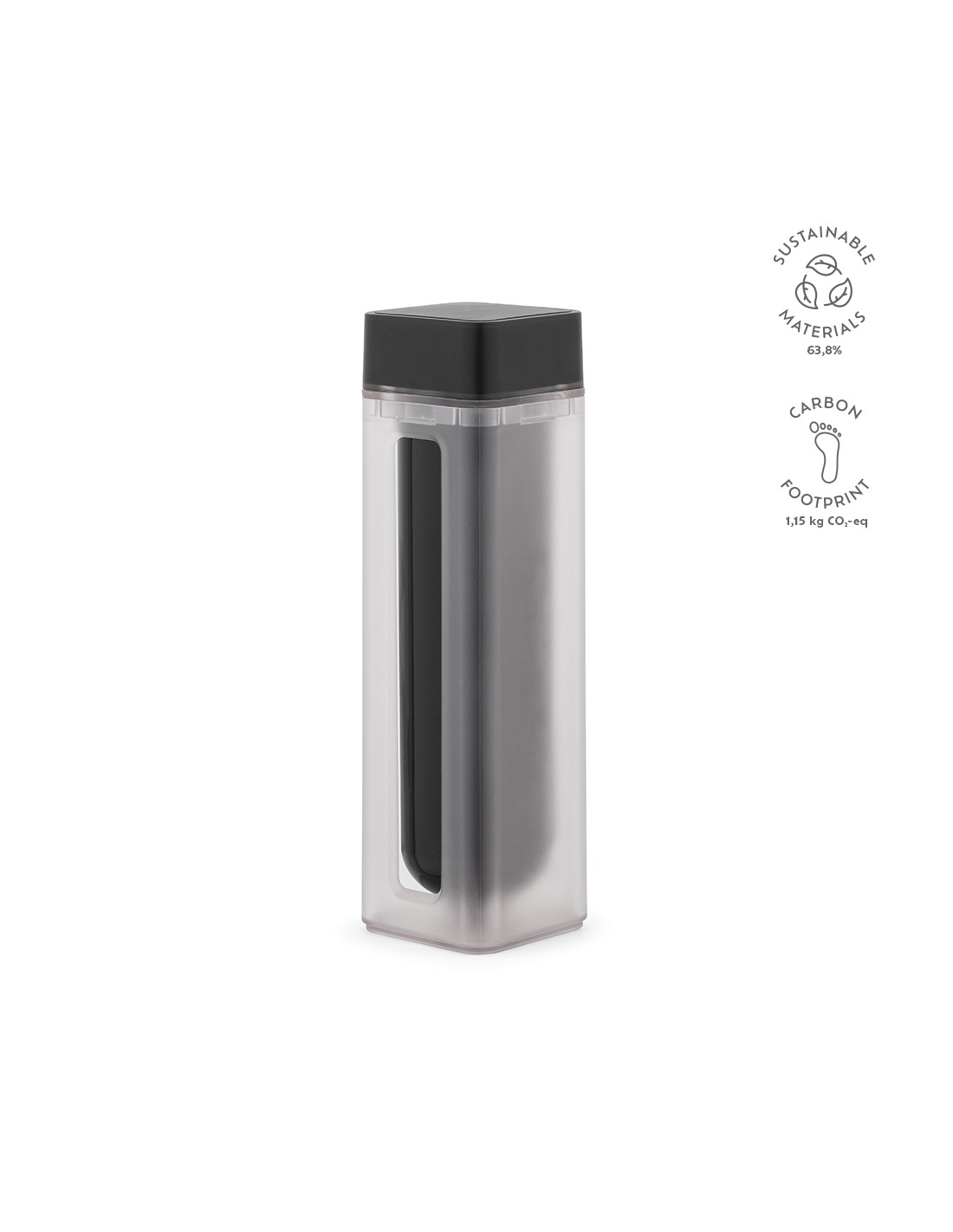 Borraccia Lucen 540 ml (500 ml netti) in plastica riciclata ABS e PBT con doppio stampaggio a iniezione. Design unico twist-and-lock. La bottiglia interna può essere stampata a colori pieni 360º con tecnologia digitale UV, rendendo il logo particolarmente evidente. Tutto confezionato in una scatola kraft individuale.