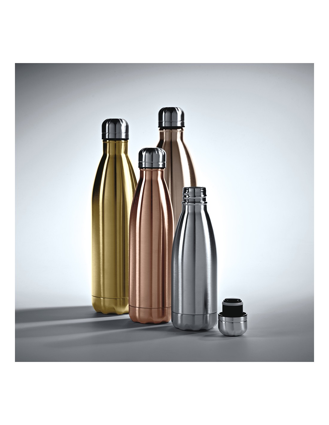 Borraccia Mississippi 800P, capacità 810ml (770ml netti), realizzata in acciaio inossidabile riciclato con una lussuosa finitura metallica lucida. L’isolamento a doppia parete mantiene le bevande calde per 14 ore e fredde per 48 ore. A tenuta stagna e lavabile in lavastoviglie. Un accessorio elegante per mantenerti idratato. Disponibile in 4 colori metallici: Gold, Rose Gold, Silver e Bronze e in 4 diverse capacità. Confezionata singolarmente in una scatola kraft ecologica.