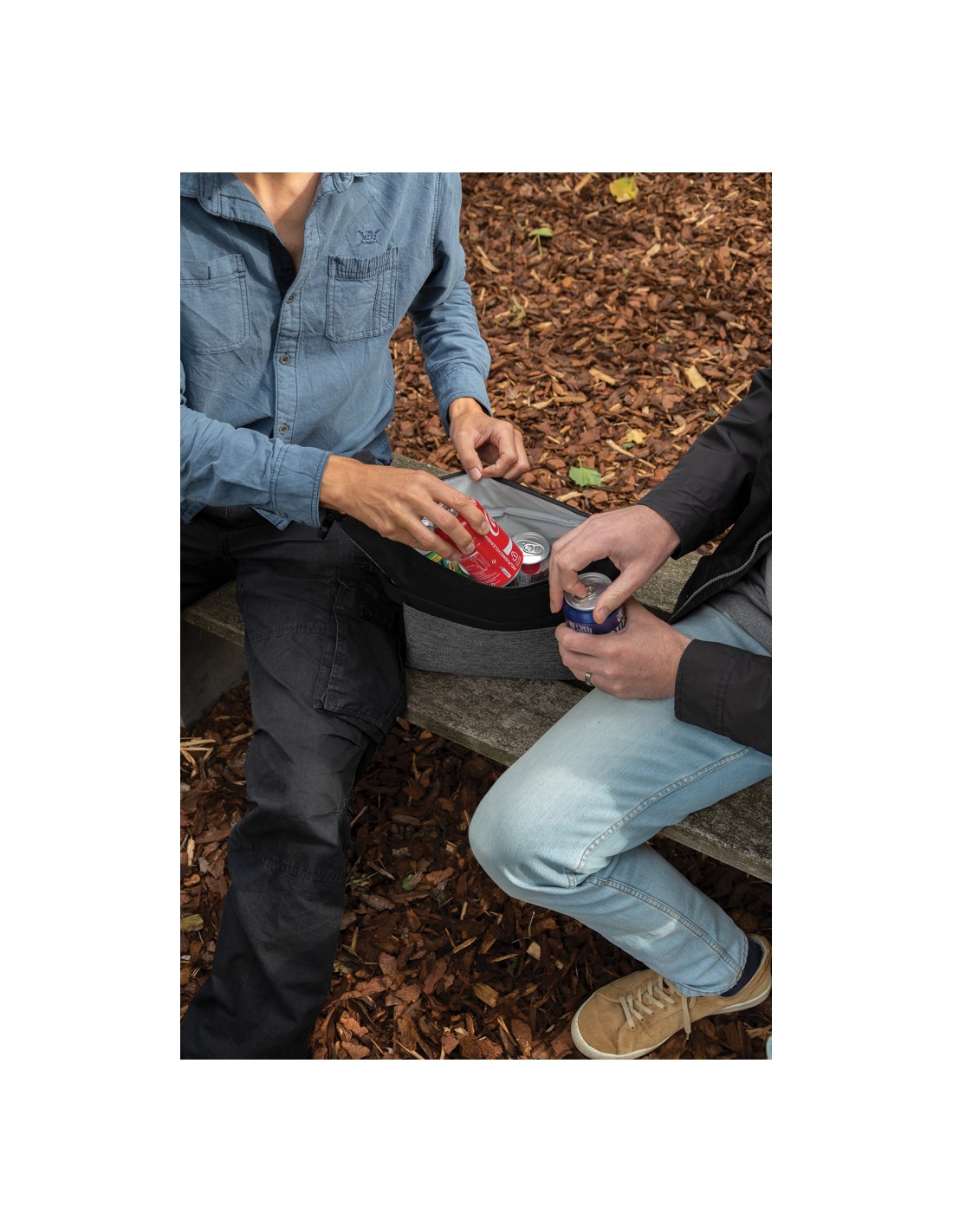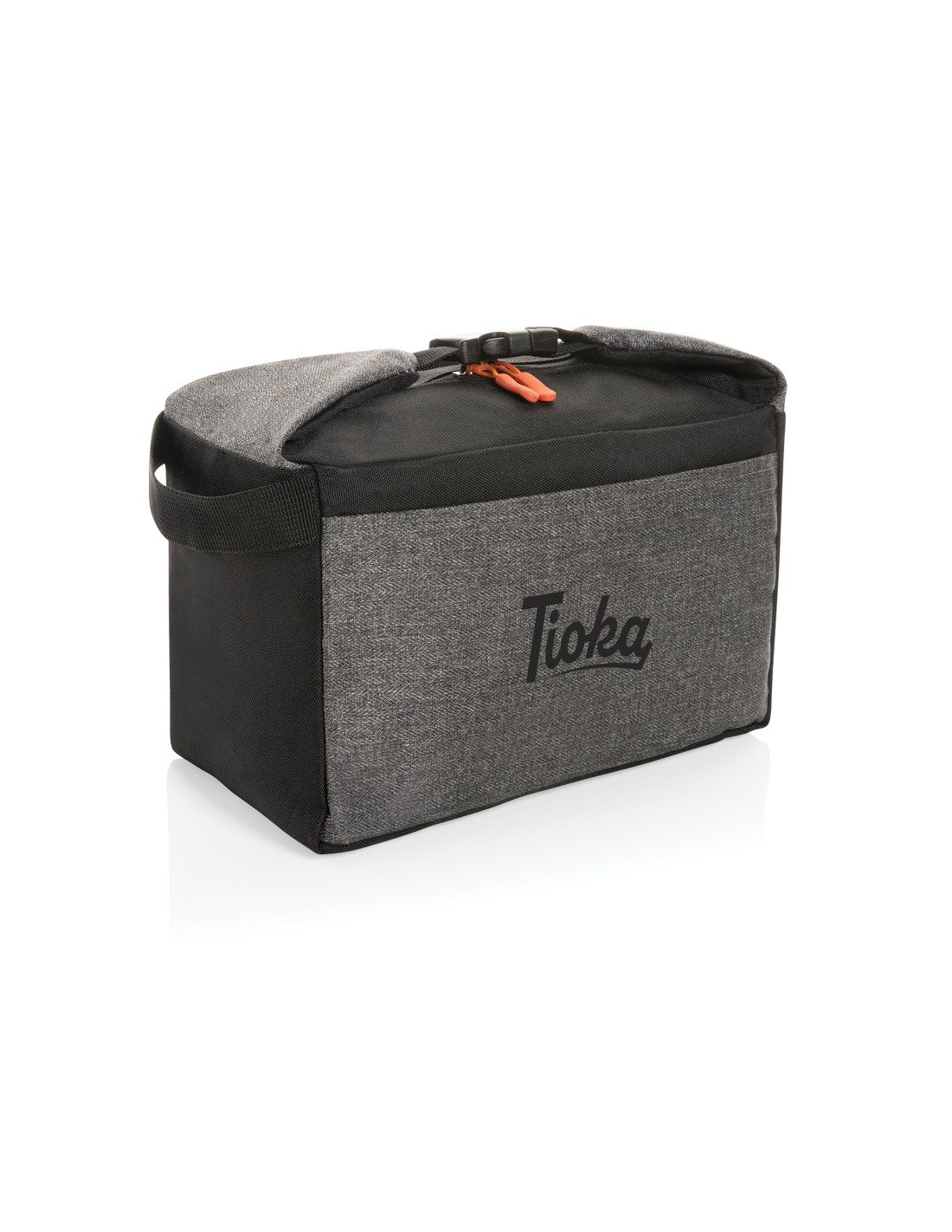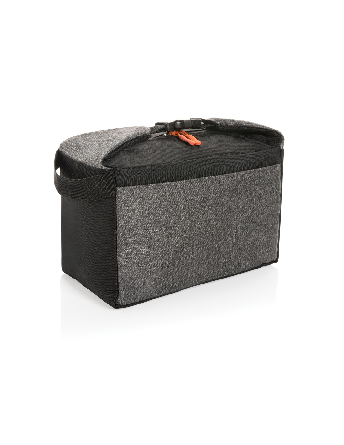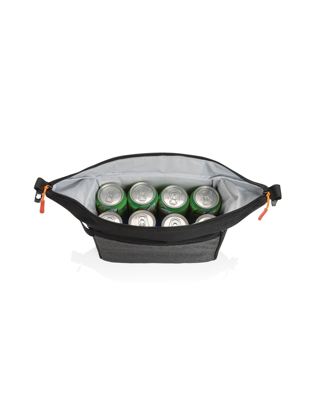 Porta lattine in carta riciclata, con manico e tasca frontale. Per 6 lattine. Materiale isolante: schiuma laminata con foglio di alluminio. Capacità 3L.