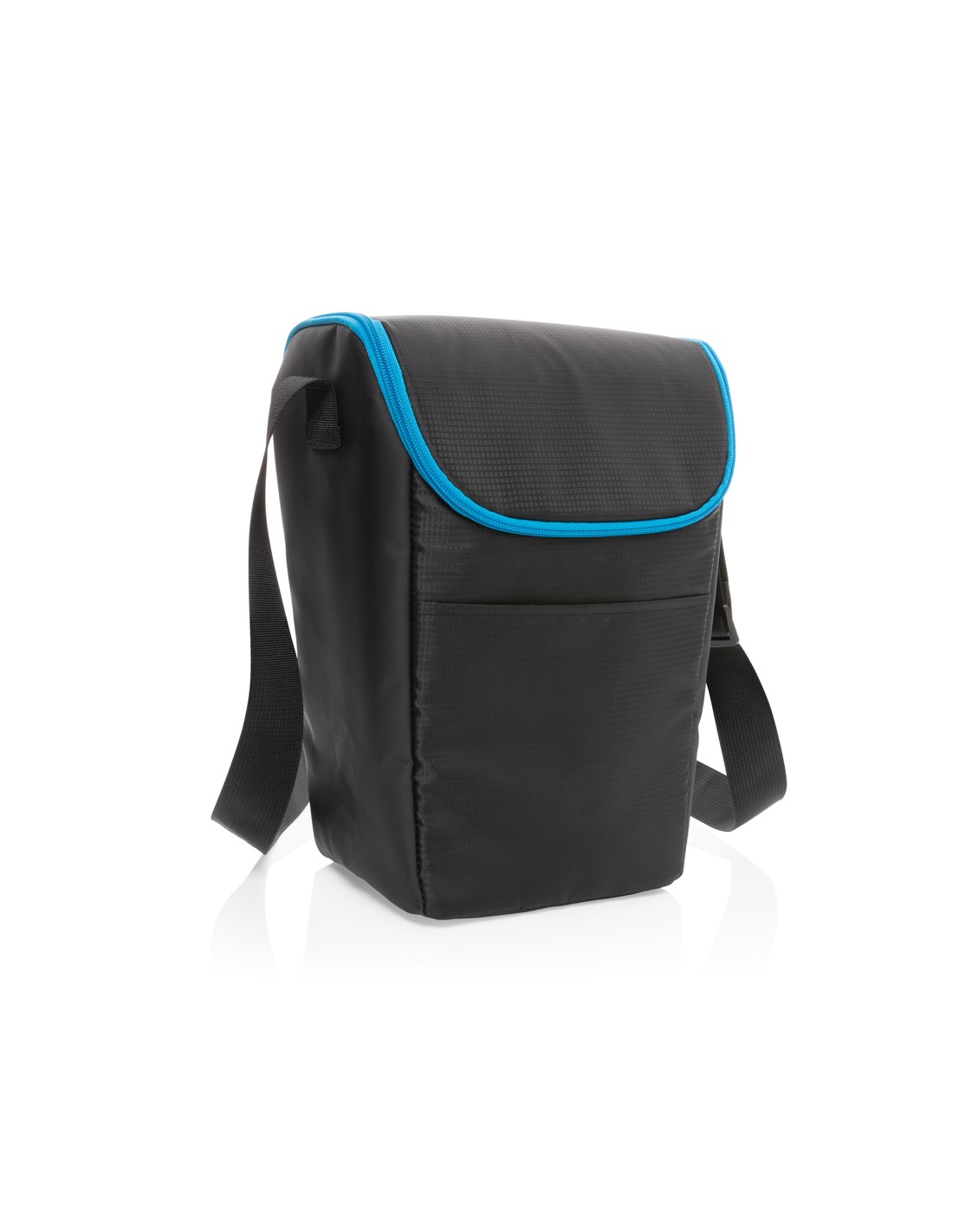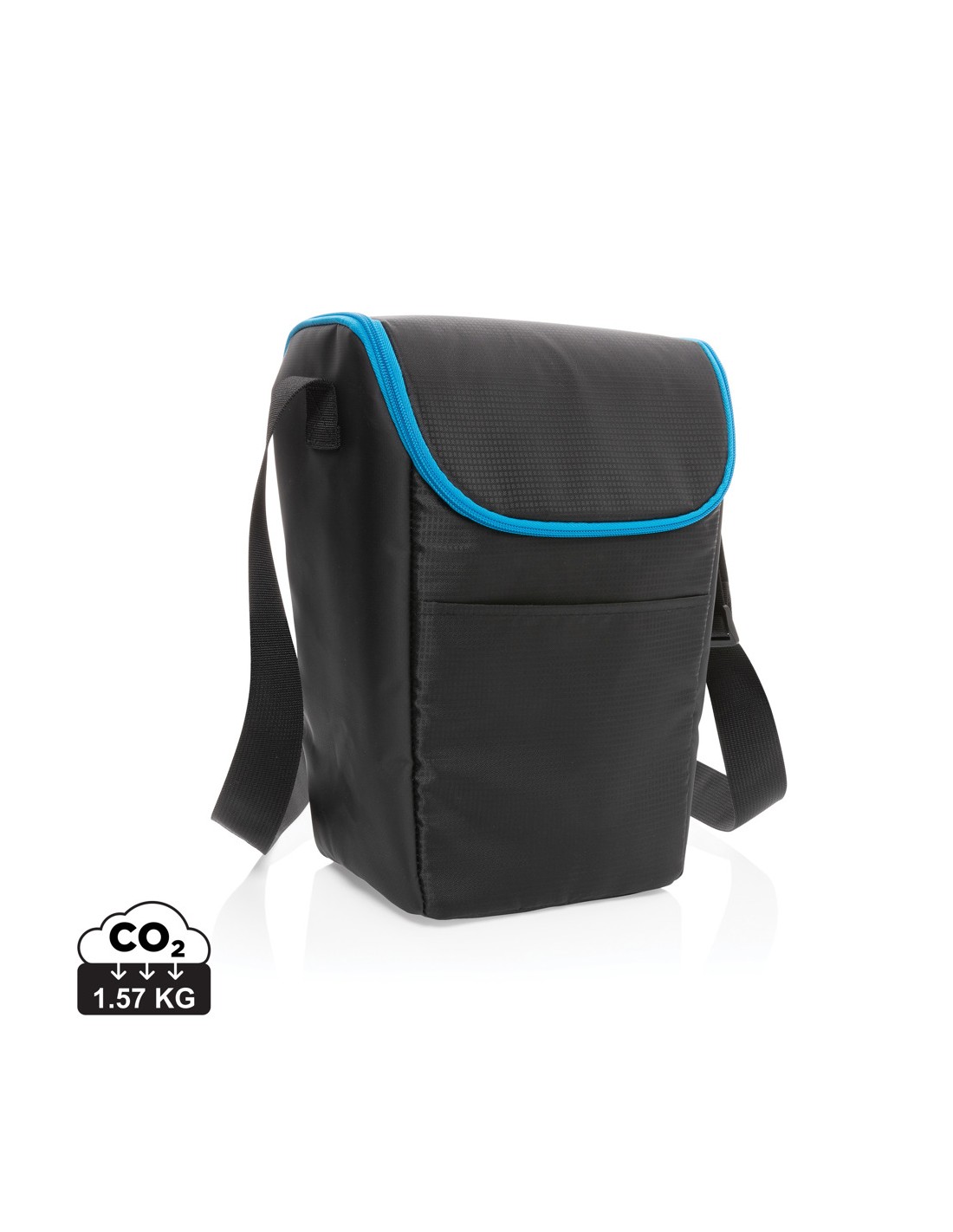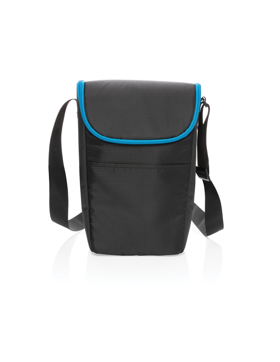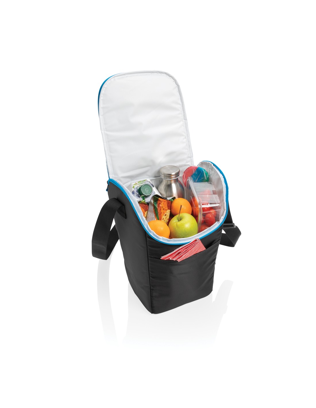 Borsa frigo in telone 50C e parte superiore/fondo in PEVA rigido e apribottiglie laterale. Include 1 tasca frontale e 1 tasca interna in rete. Materiale isolante: Strato di schiuma PE. Include 2 maniglie e 1 cinghia regolabile e staccabile. Capacità 16L.