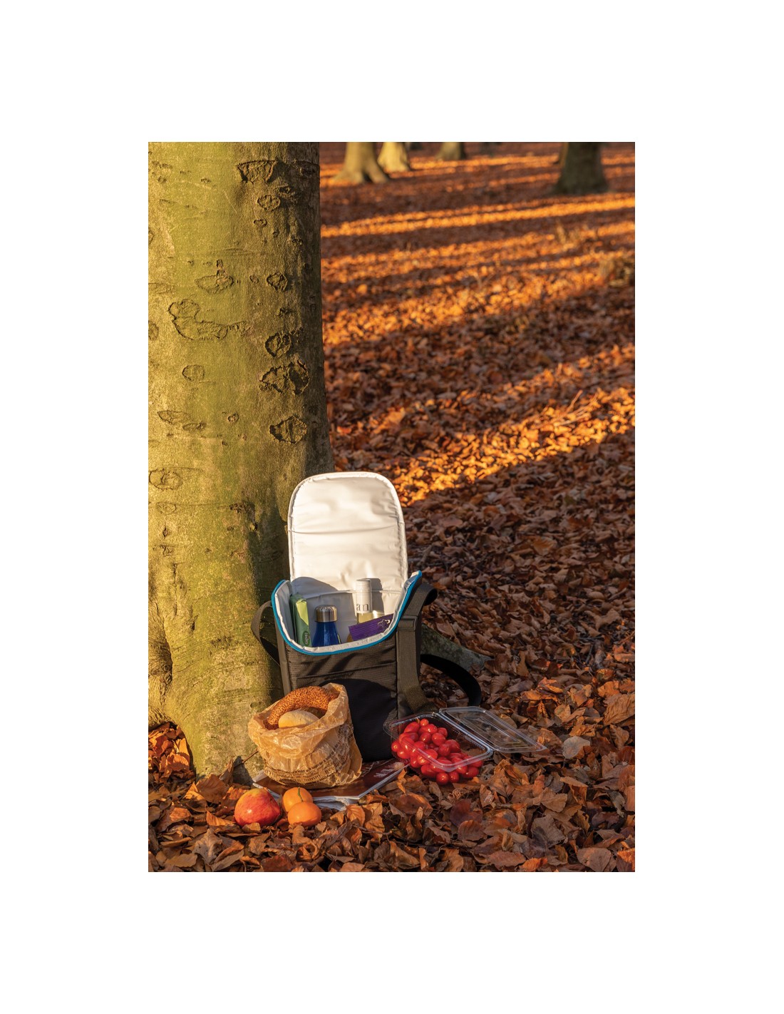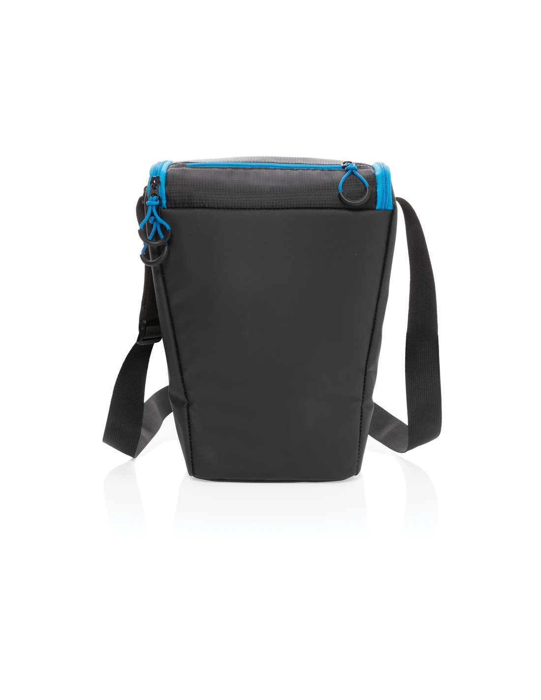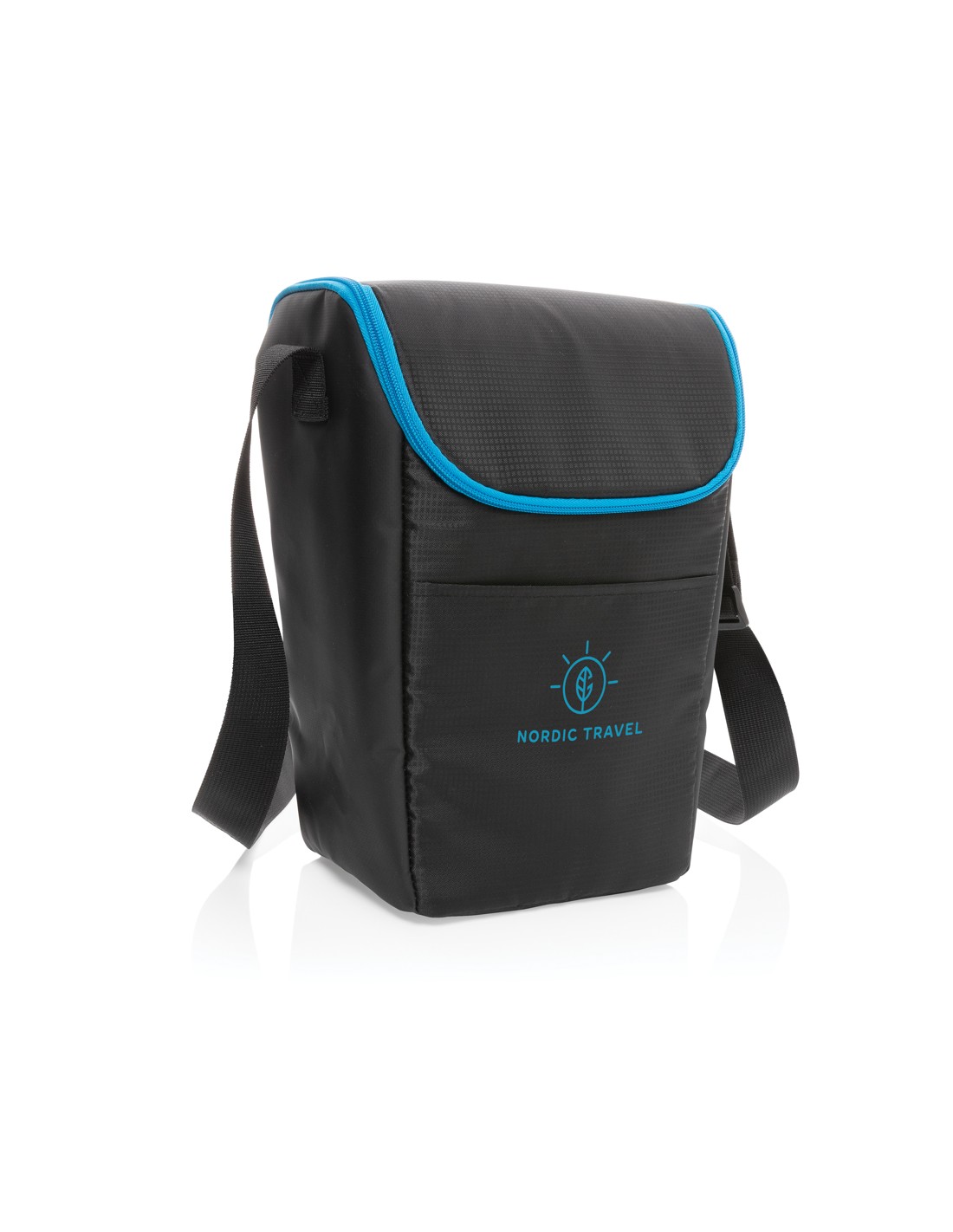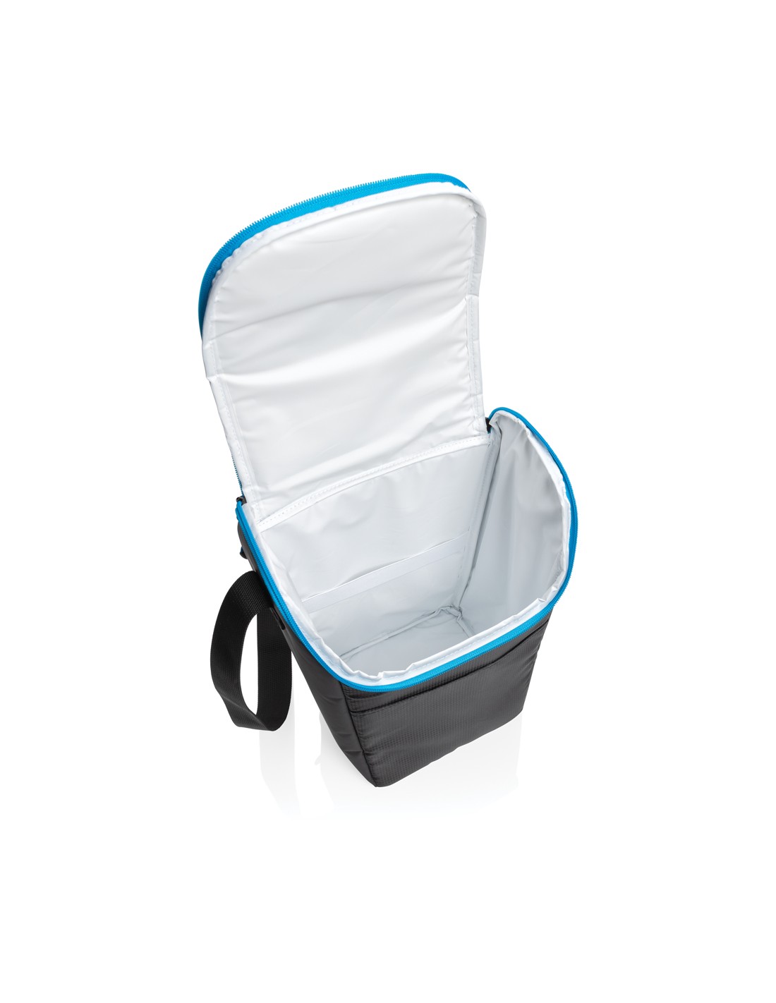 Borsa frigo in telone 50C e parte superiore/fondo in PEVA rigido e apribottiglie laterale. Include 1 tasca frontale e 1 tasca interna in rete. Materiale isolante: Strato di schiuma PE. Include 2 maniglie e 1 cinghia regolabile e staccabile. Capacità 16L.
