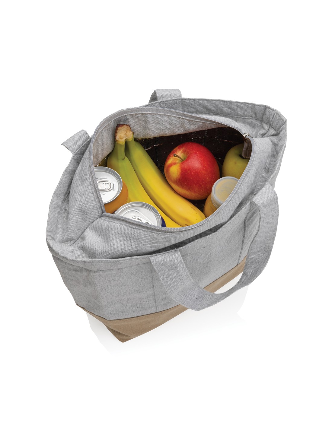 Borsa termica grande in poliestere 600D two-tone. Capacità 20 lattine. Due tasche laterali in rete e una tasca frontale.