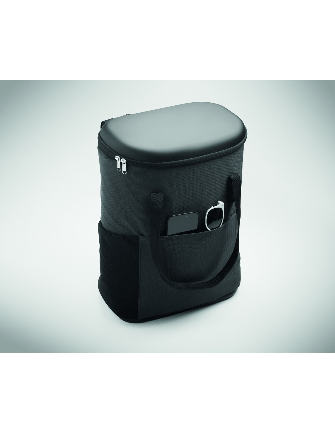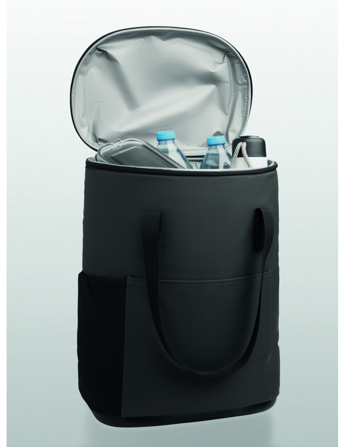 Borsa termica in feltro RPET con tasca frontale. feltro RPET da 1 mm e foglio isolante in alluminio laminato da 3 mm. Capacità: 5 L.