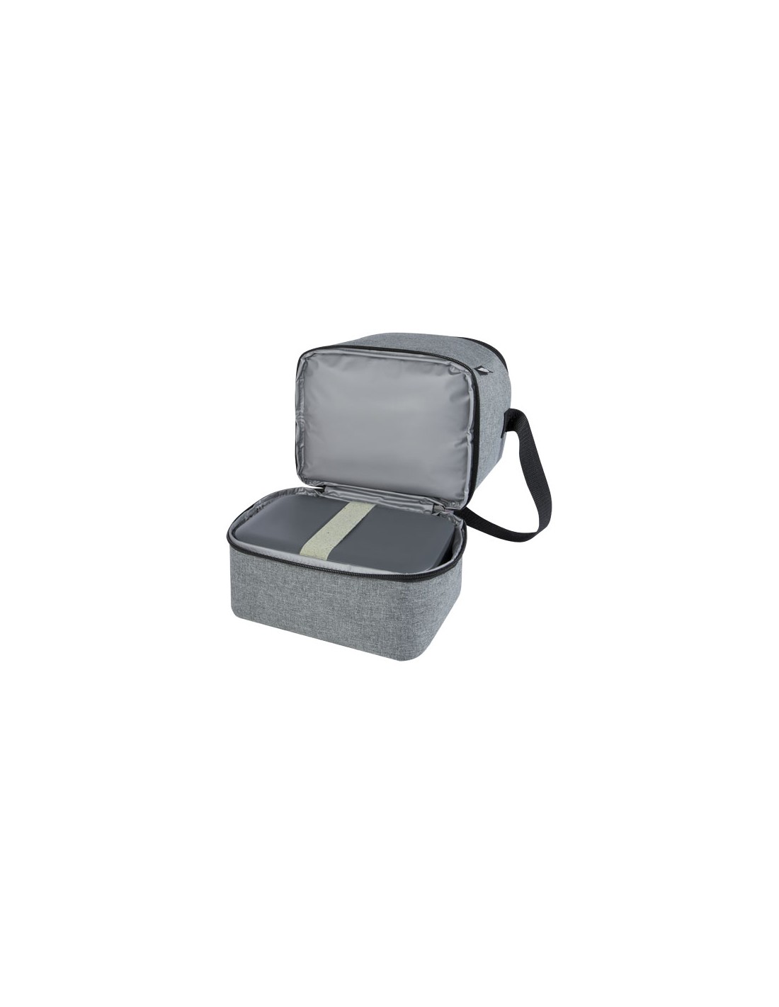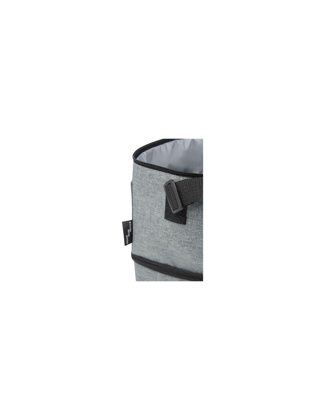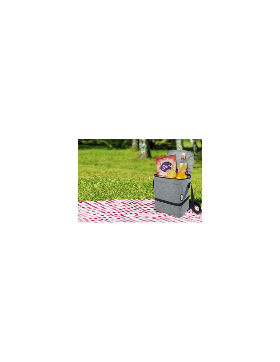 Borsa frigo in telone 50C e parte superiore/fondo in PEVA rigido e apribottiglie laterale. Include 1 tasca frontale e 1 tasca interna in rete. Materiale isolante: Strato di schiuma PE. Include 2 maniglie e 1 cinghia regolabile e staccabile. Capacità 16L.