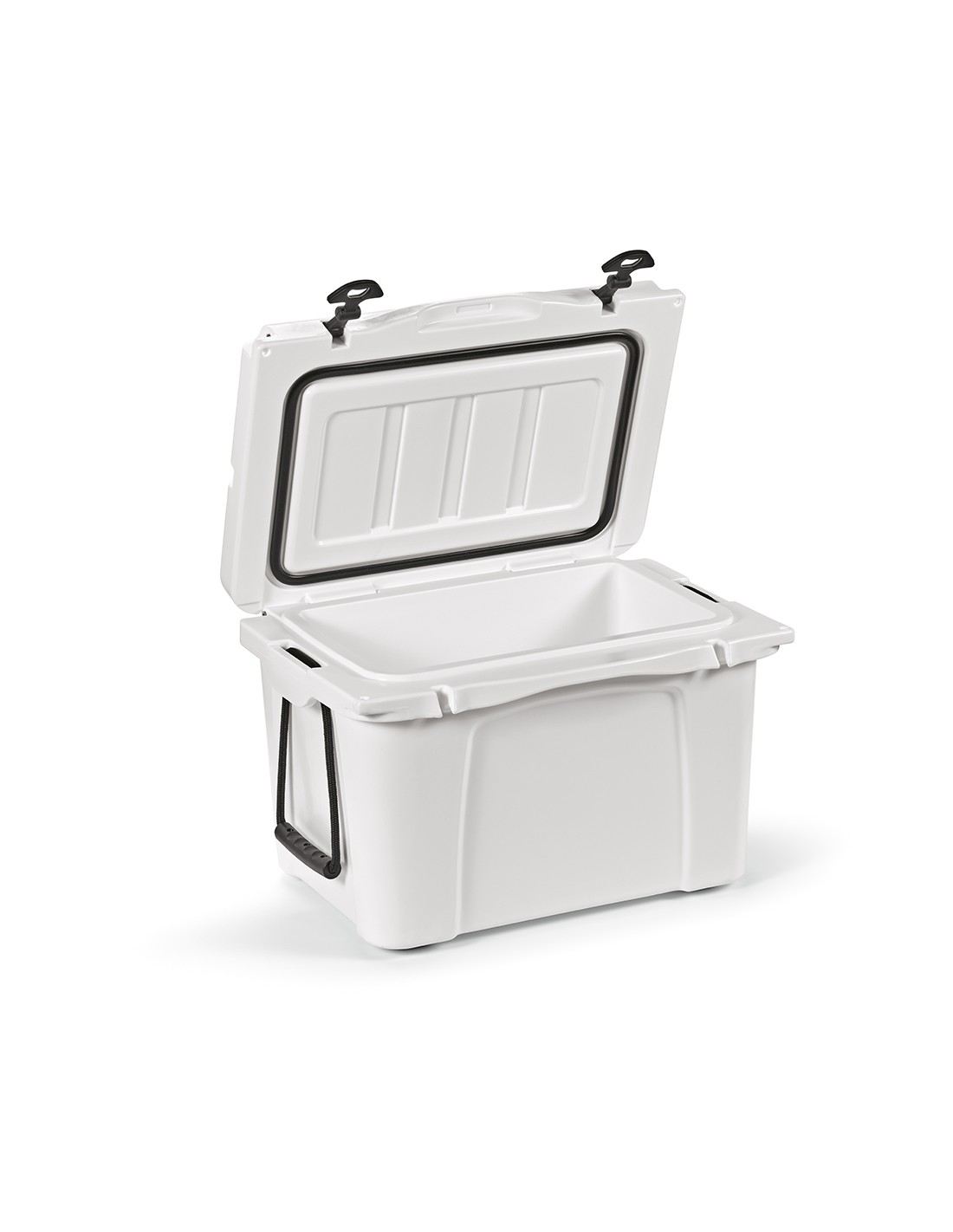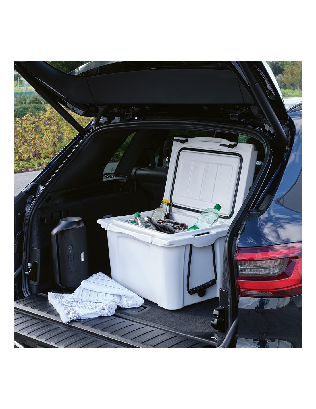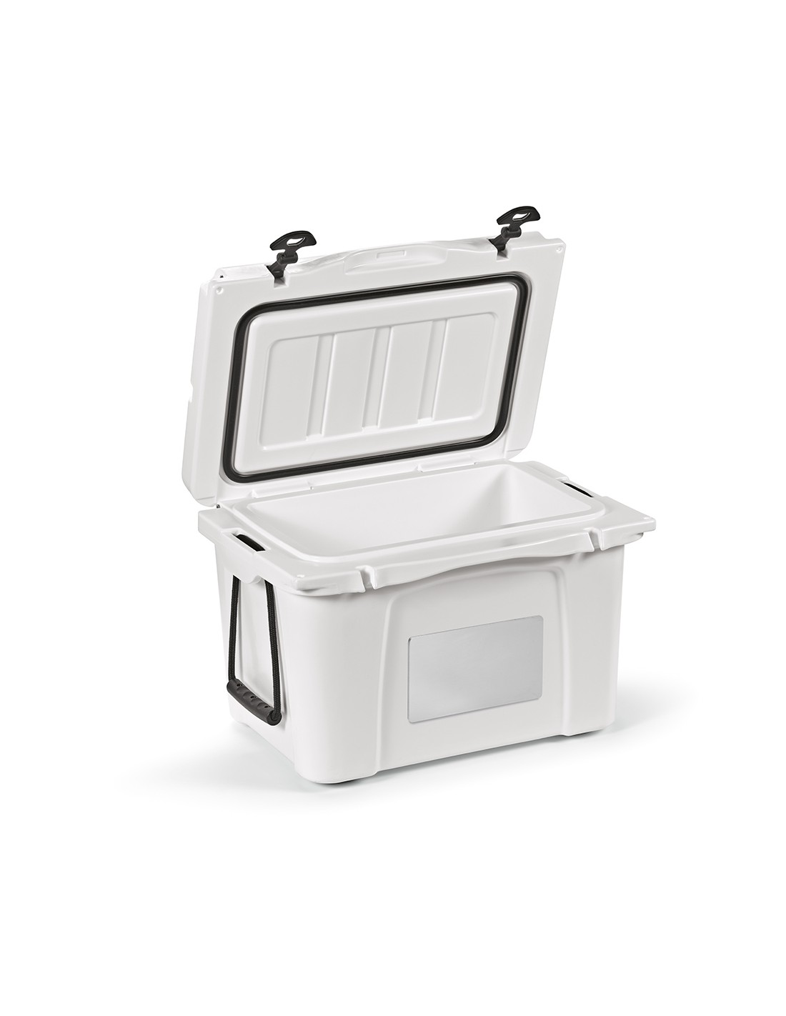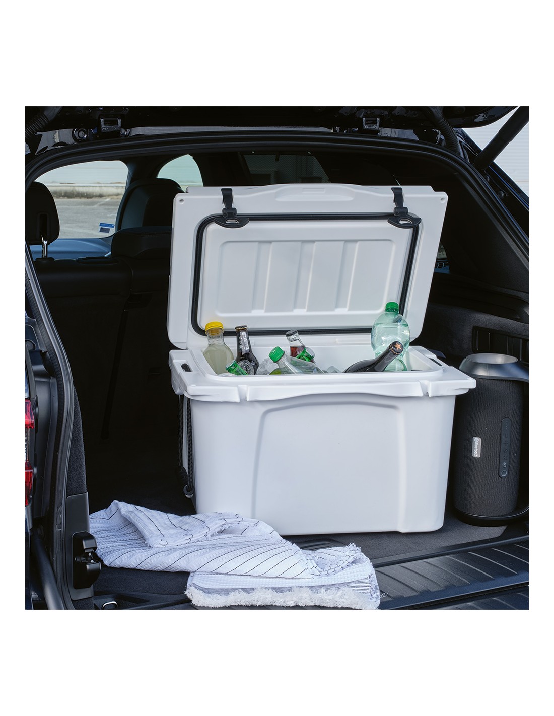 Questa borsa frigo San Francisco da 35L, realizzata in plastica riciclata, è progettata per la praticità e la durata. È dotata di maniglie in corda doppie su ciascun lato e maniglie a presa con apribottiglie integrati per un sollevamento facile e funzionale. Un tappo sul fondo con coperchio nero permette un rapido svuotamento senza disordine. La piastra in acciaio (20x10 cm) sul pannello anteriore aggiunge un tocco elegante, mentre il coperchio include due portabicchieri e una riga di misurazione integrata, perfetta per le avventure all'aperto. Il corpo isolato garantisce che le tue bevande rimangano fresche fino a 4 giorni. Adatta a contenere 48 lattine.