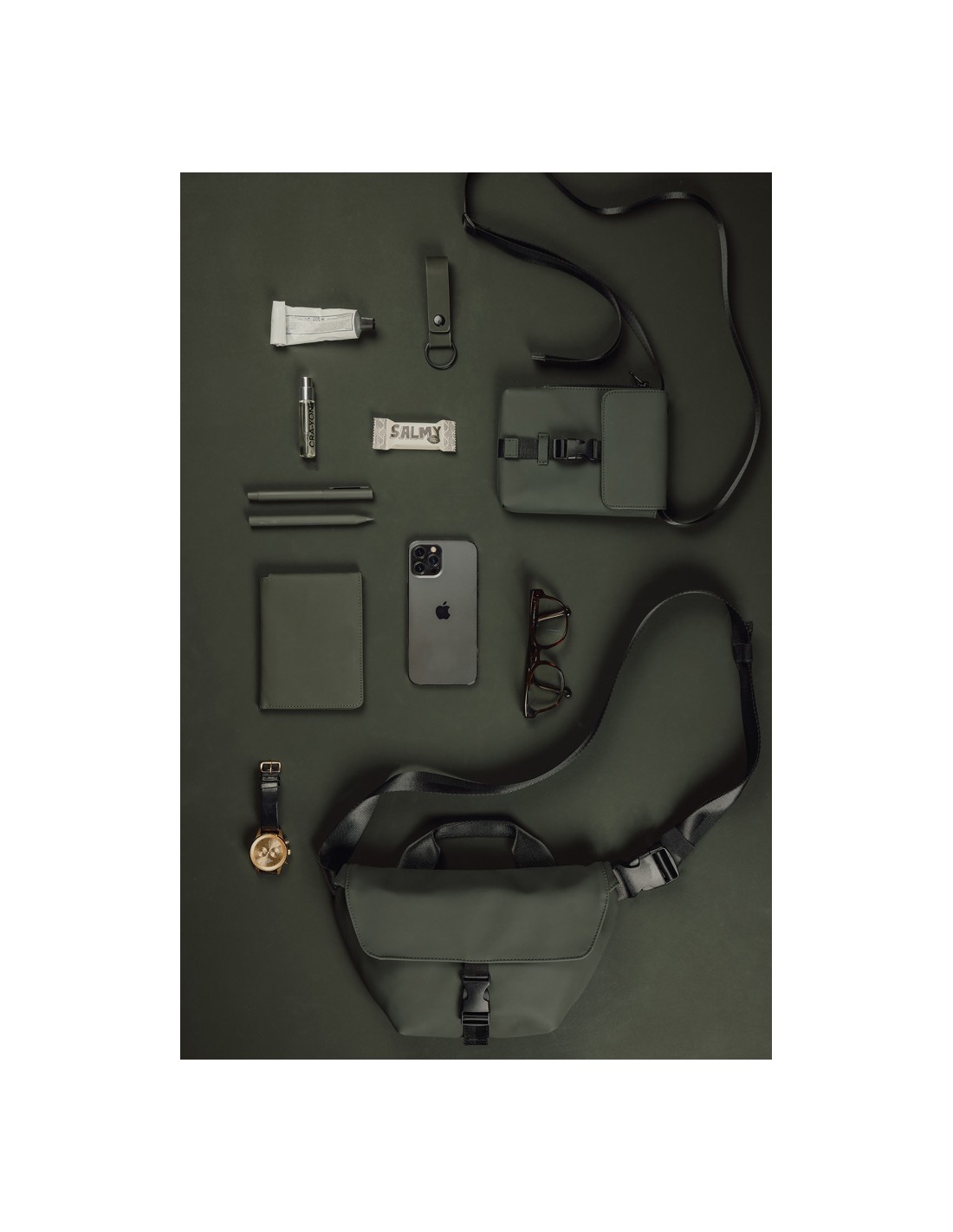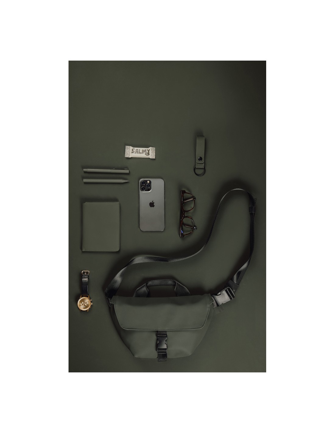 Borsa a tracolla realizzata in plastica PET riciclata con tracolla regolabile. Scomparto principale chiudibile con patella e fibbia.