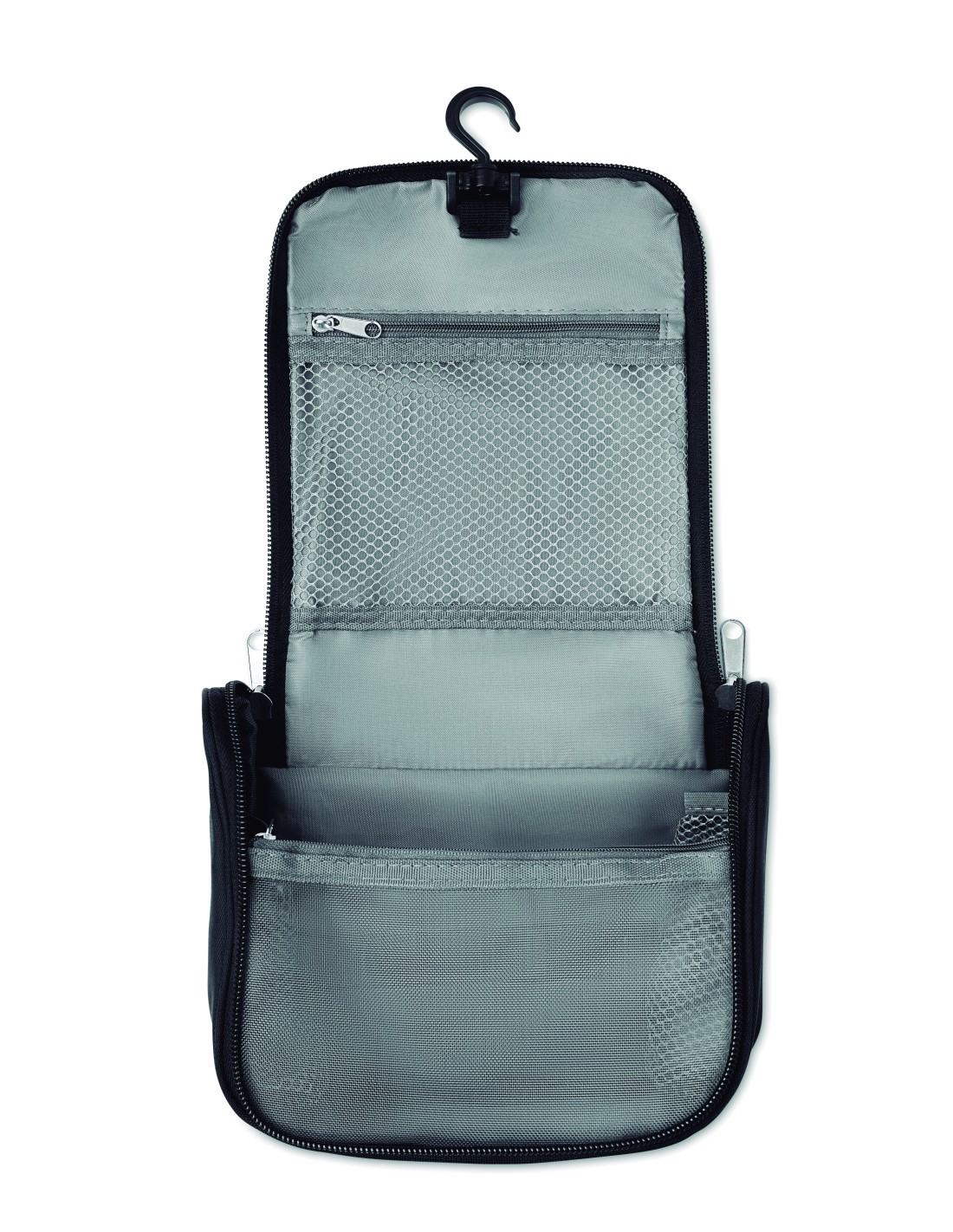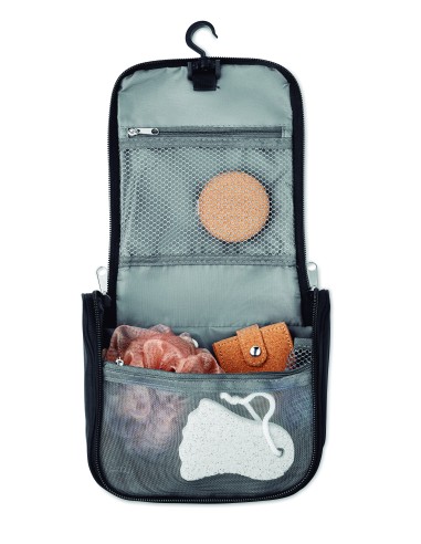 Trousse da viaggio con numerosi scomparti e tasche in rete. In poliestere alta densità.