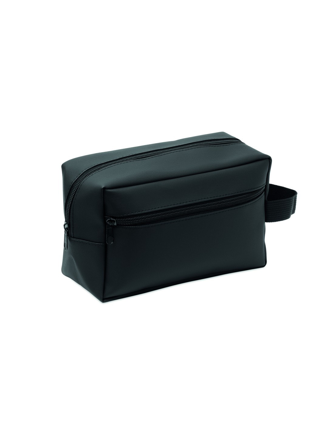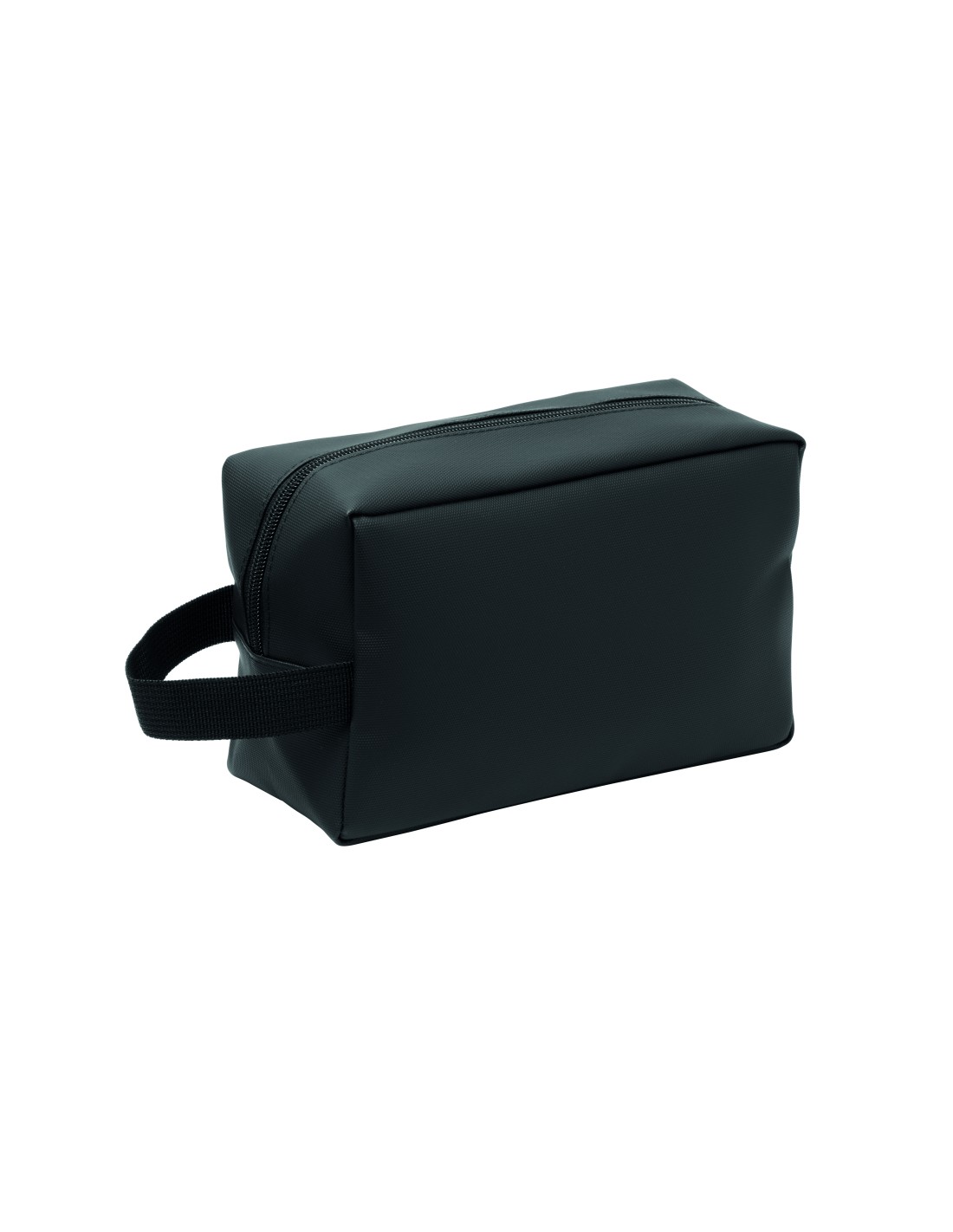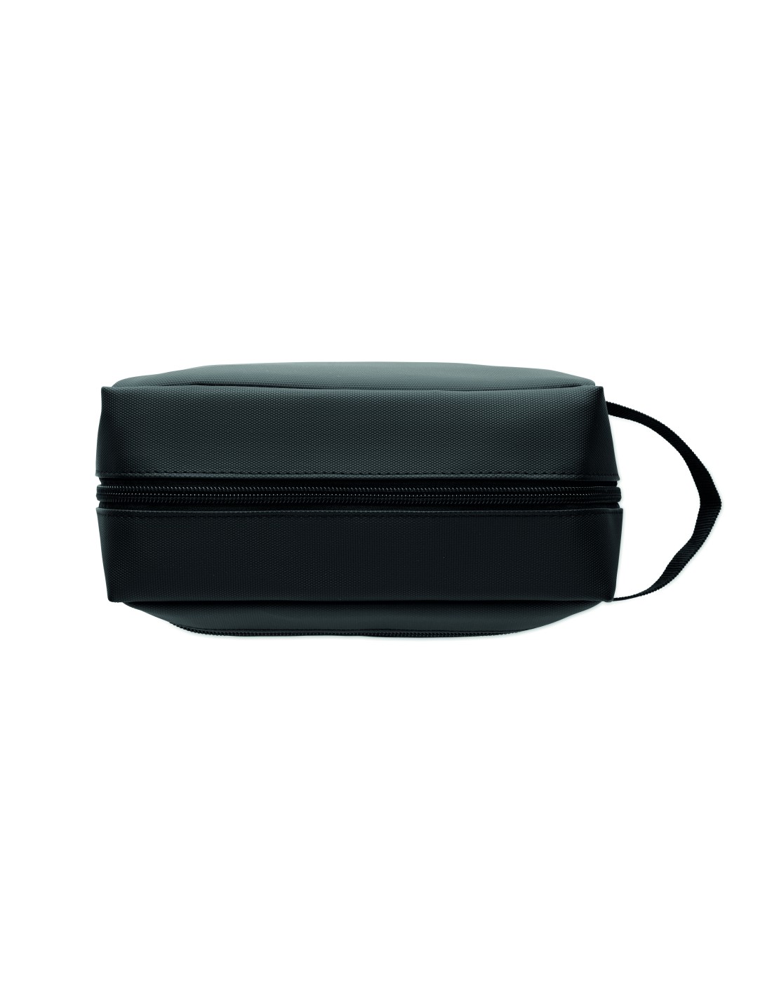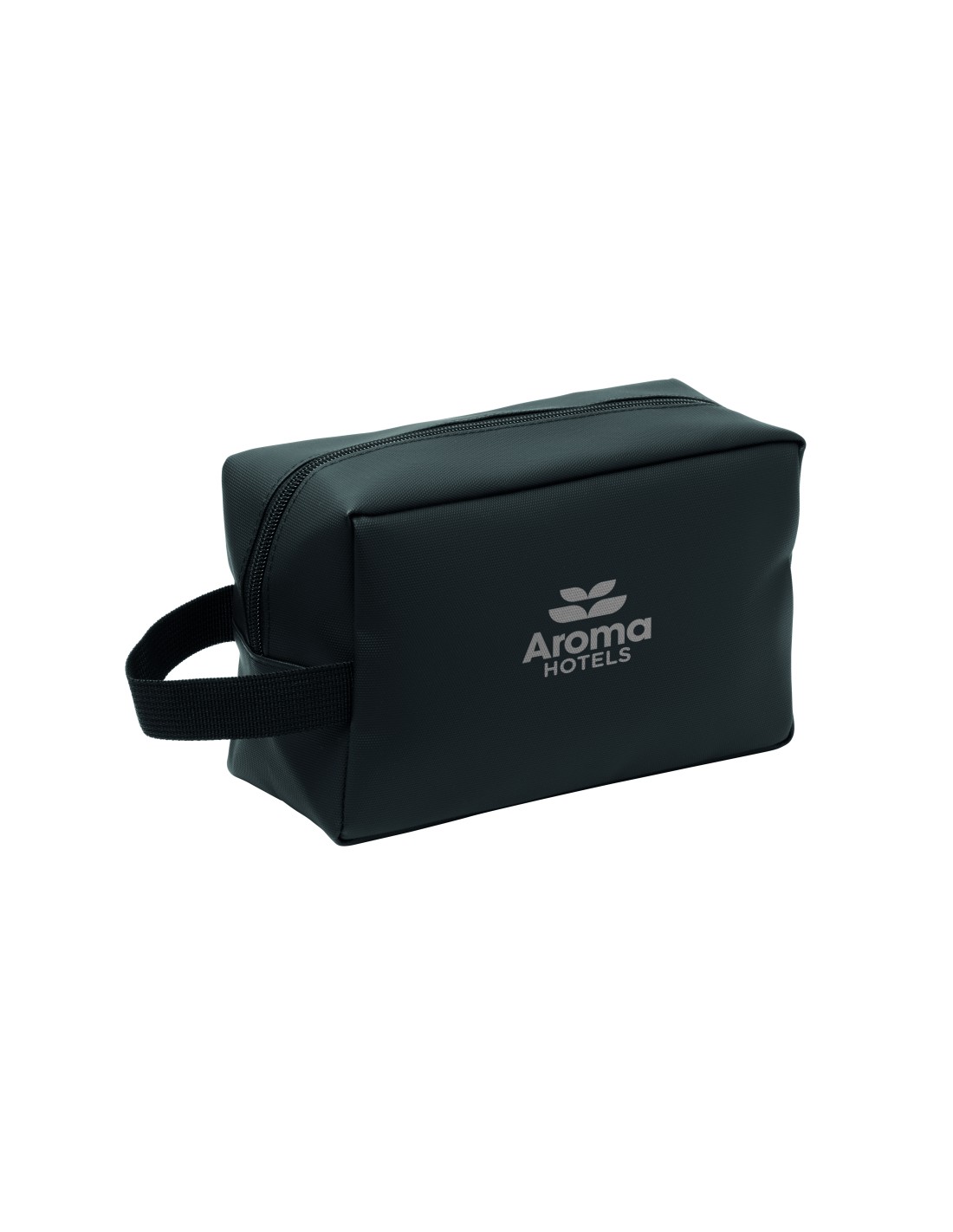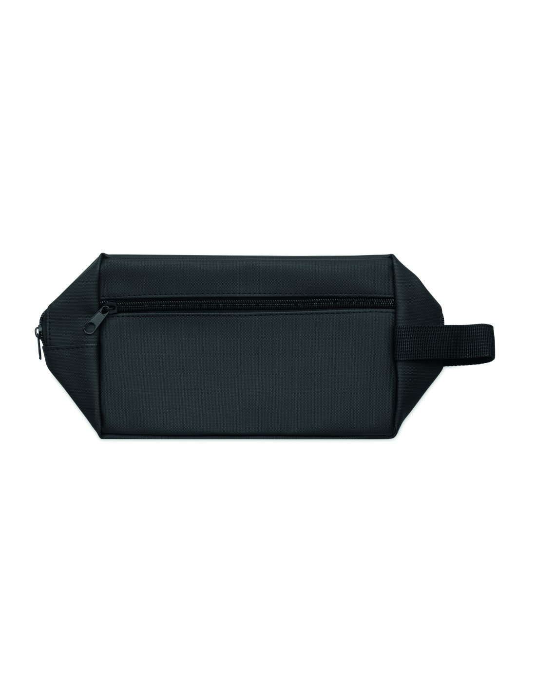 Beauty case in poliestere 600D RPET con rivestimento in PU e fodera in 210D RPET. Una tasca frontale con cerniera e una maniglia.