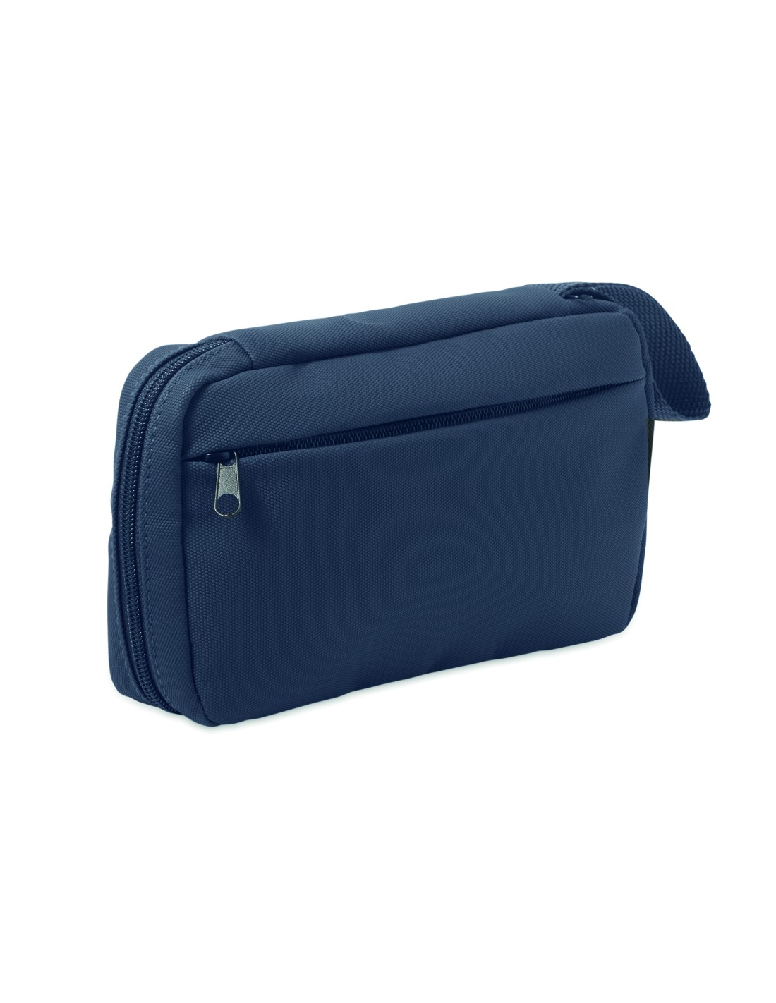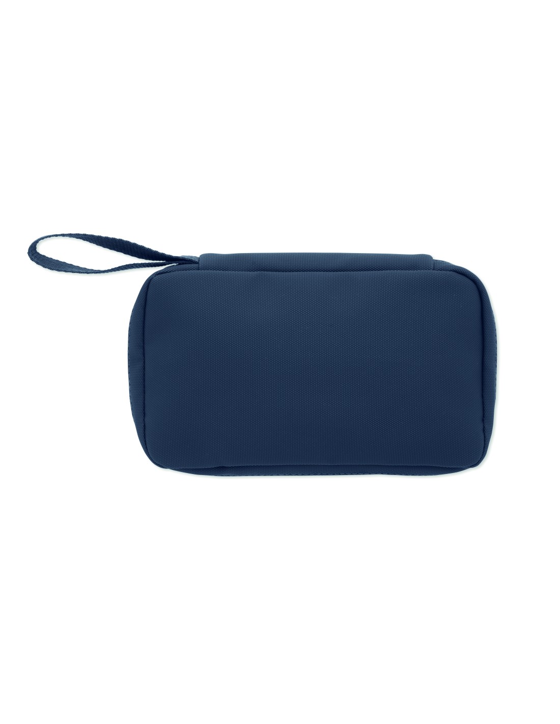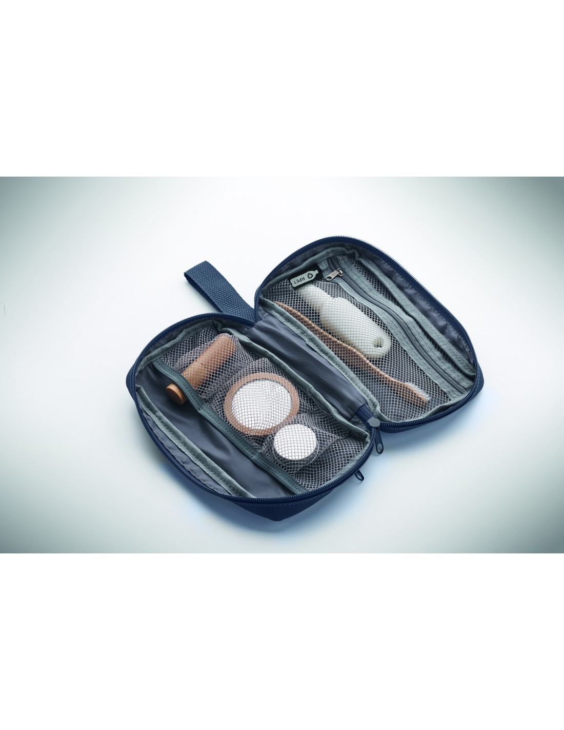 Beauty case in RPET 600D con rivestimento in PU, rete in RPET e fodera in RPET 210D. Presenta una tasca principale anteriore con cerniera e tasche interne in rete e aperte.