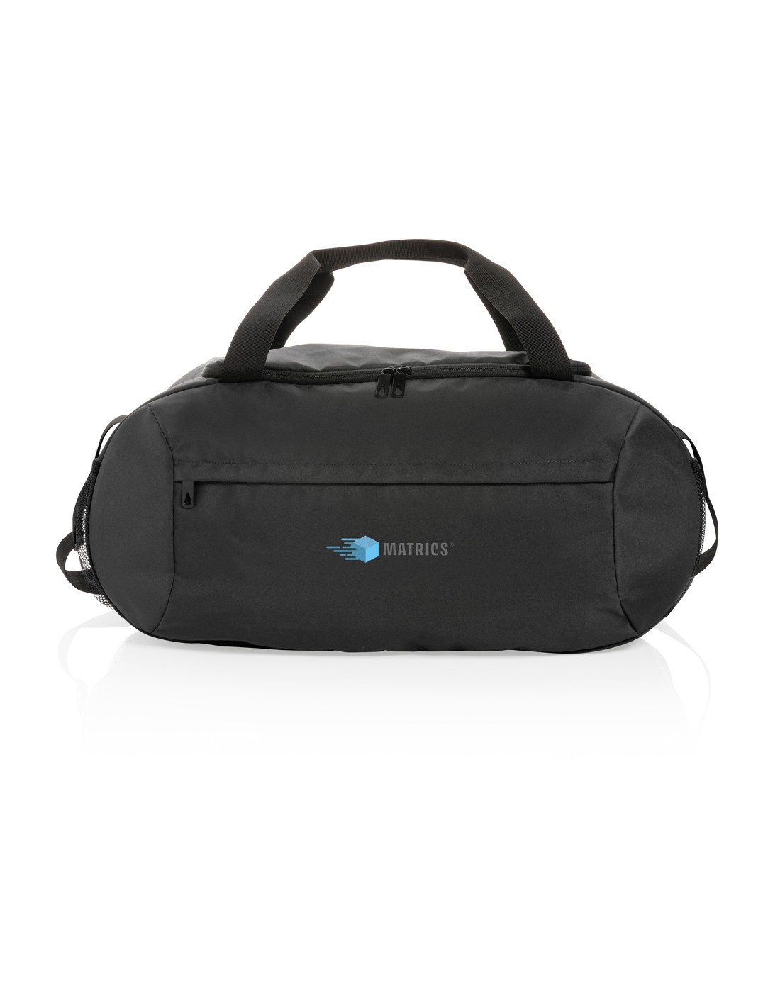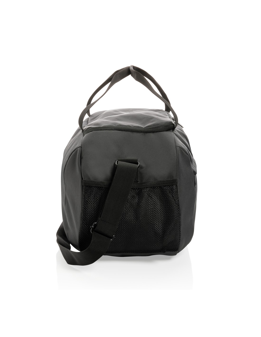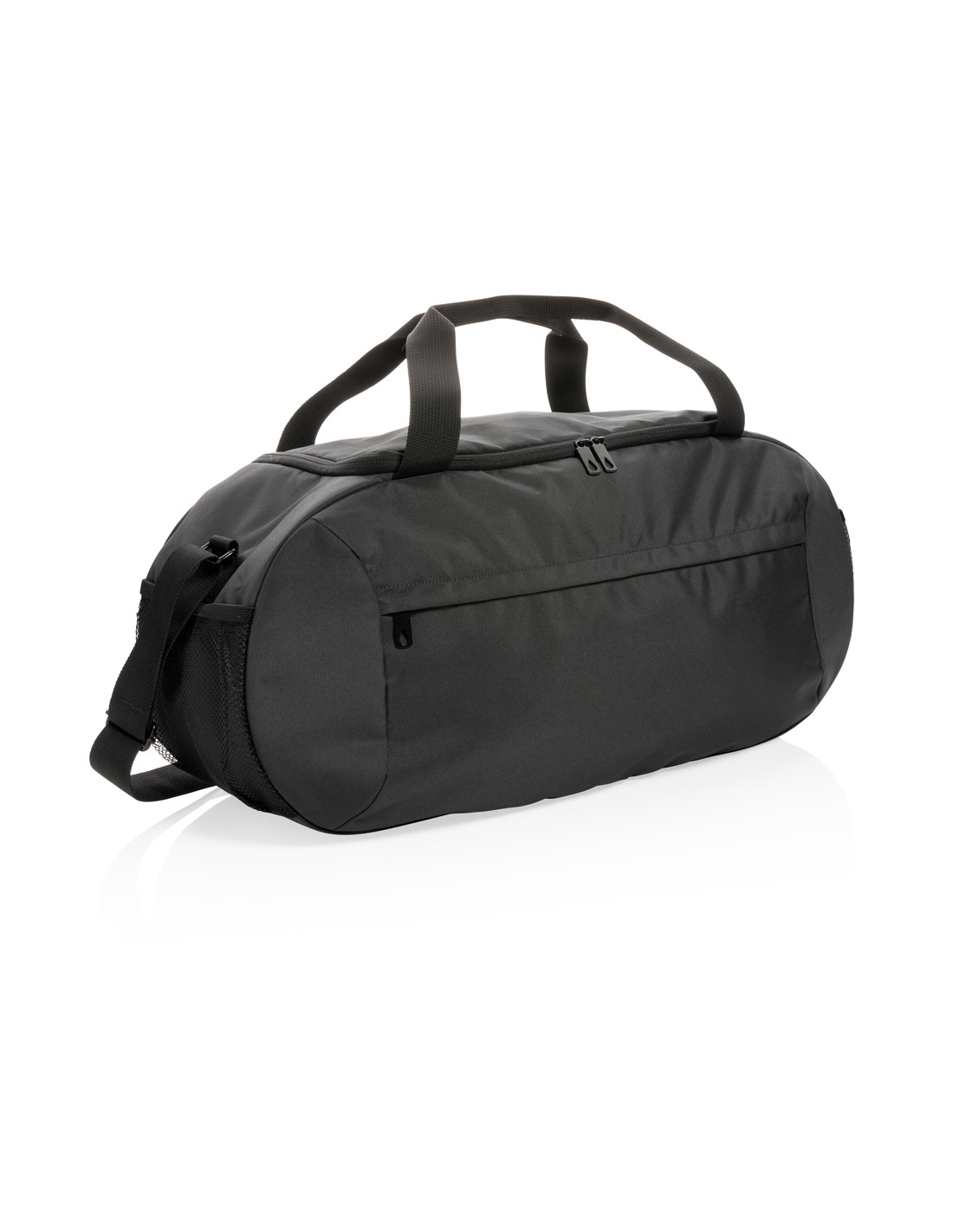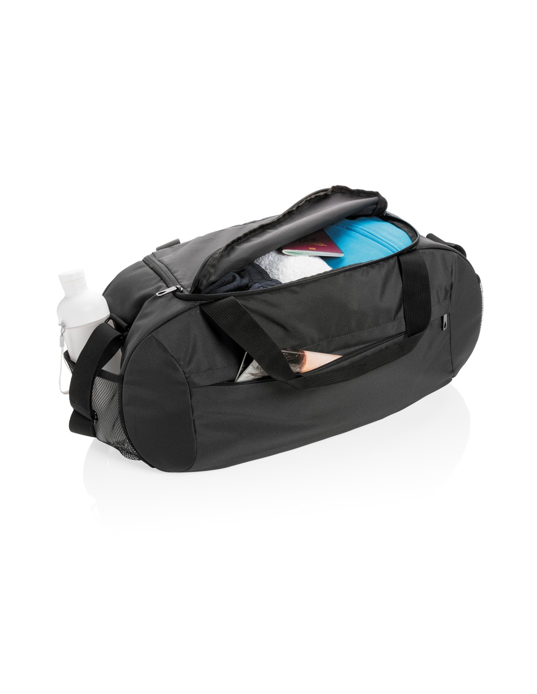 Ampia borsa da viaggio con chiusura a doppia zip. In microfibra con doppio manico in PVC.