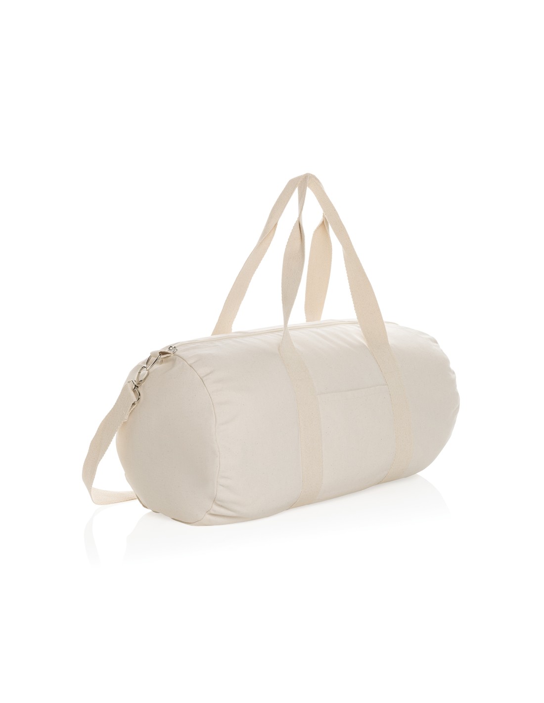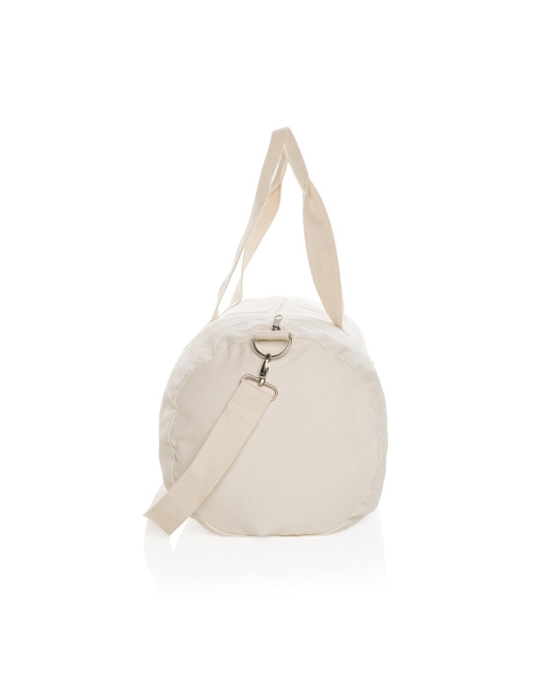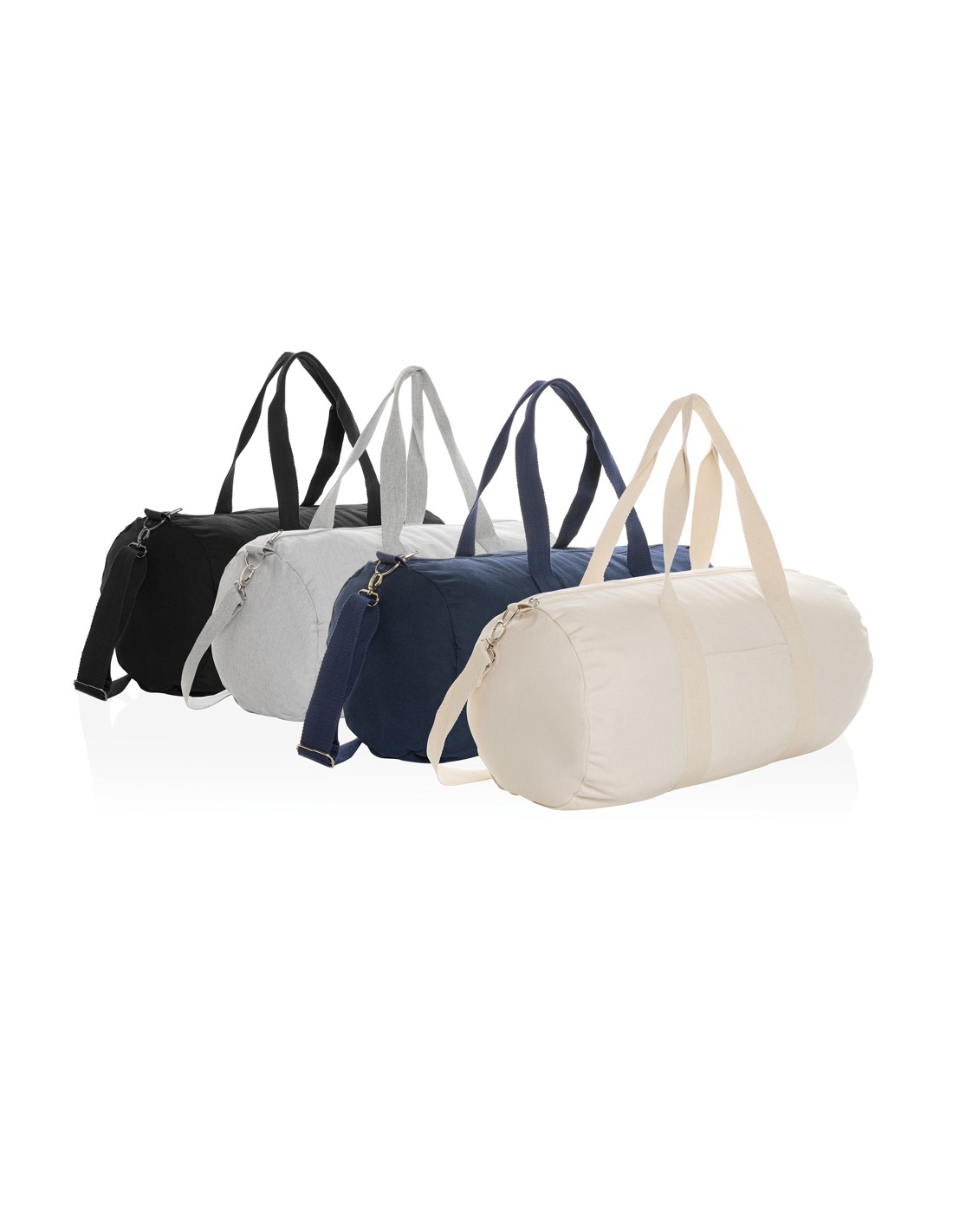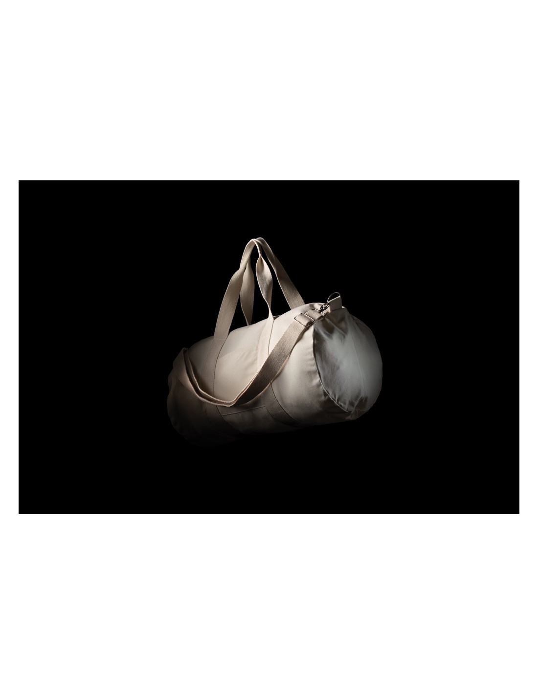 Borsone da viaggio in tessuto riciclato da 450 gr/m² (60% cotone riciclato e 40% poliestere riciclato) con tracolla in cotone regolabile e staccabile.