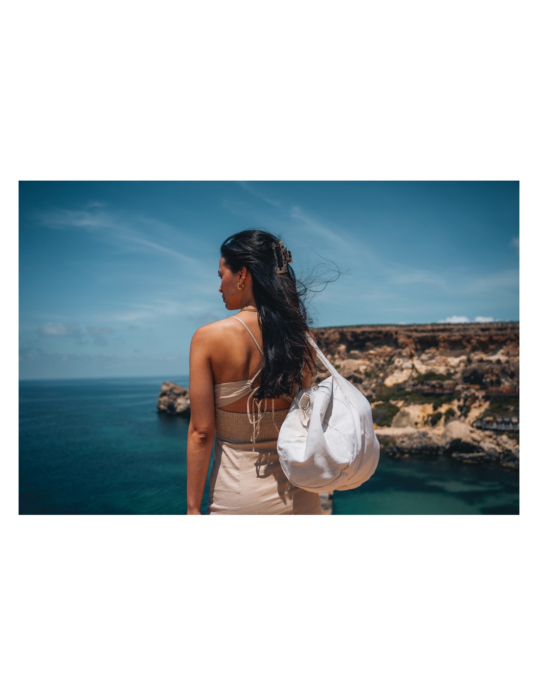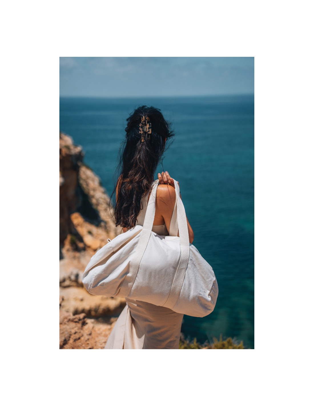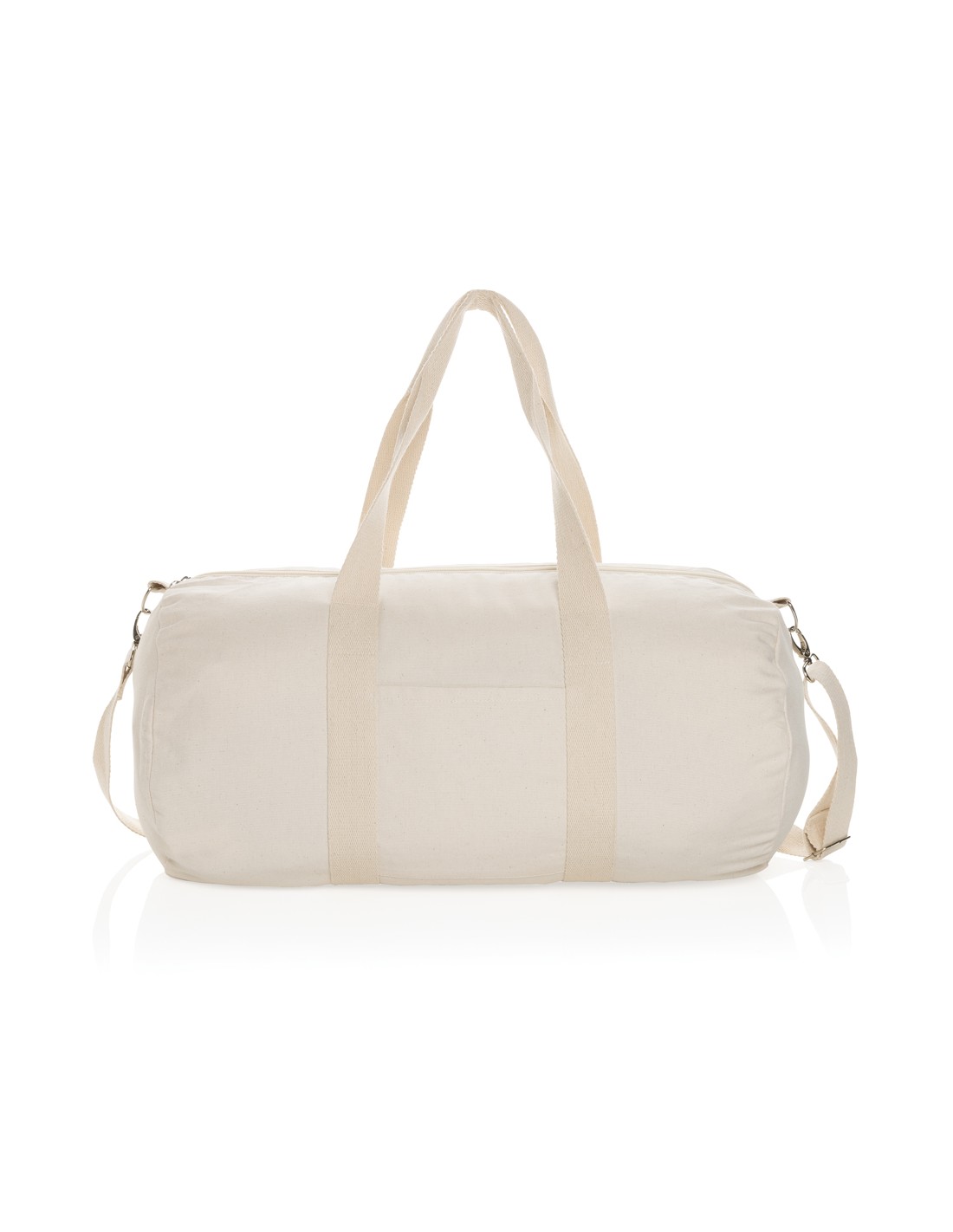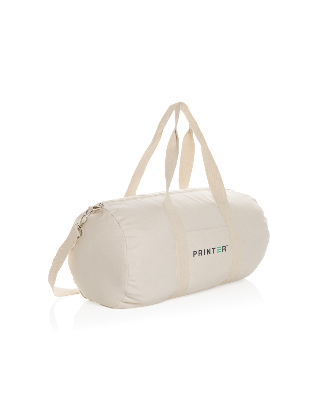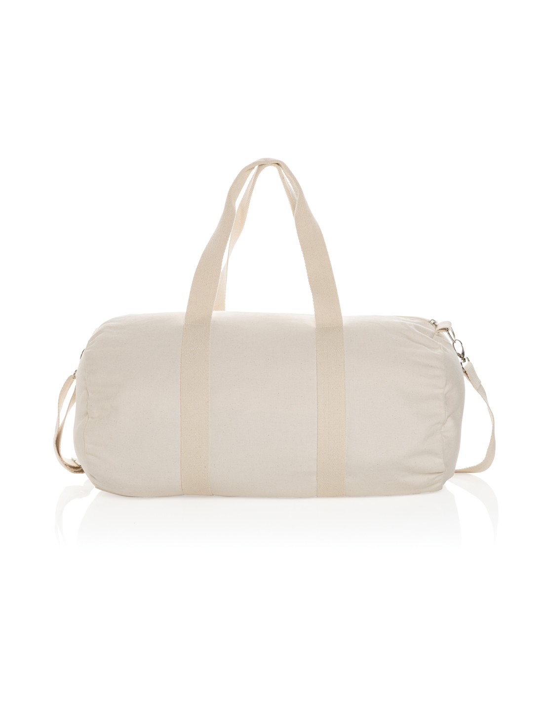 Borsone da viaggio in tessuto riciclato da 450 gr/m² (60% cotone riciclato e 40% poliestere riciclato) con tracolla in cotone regolabile e staccabile.
