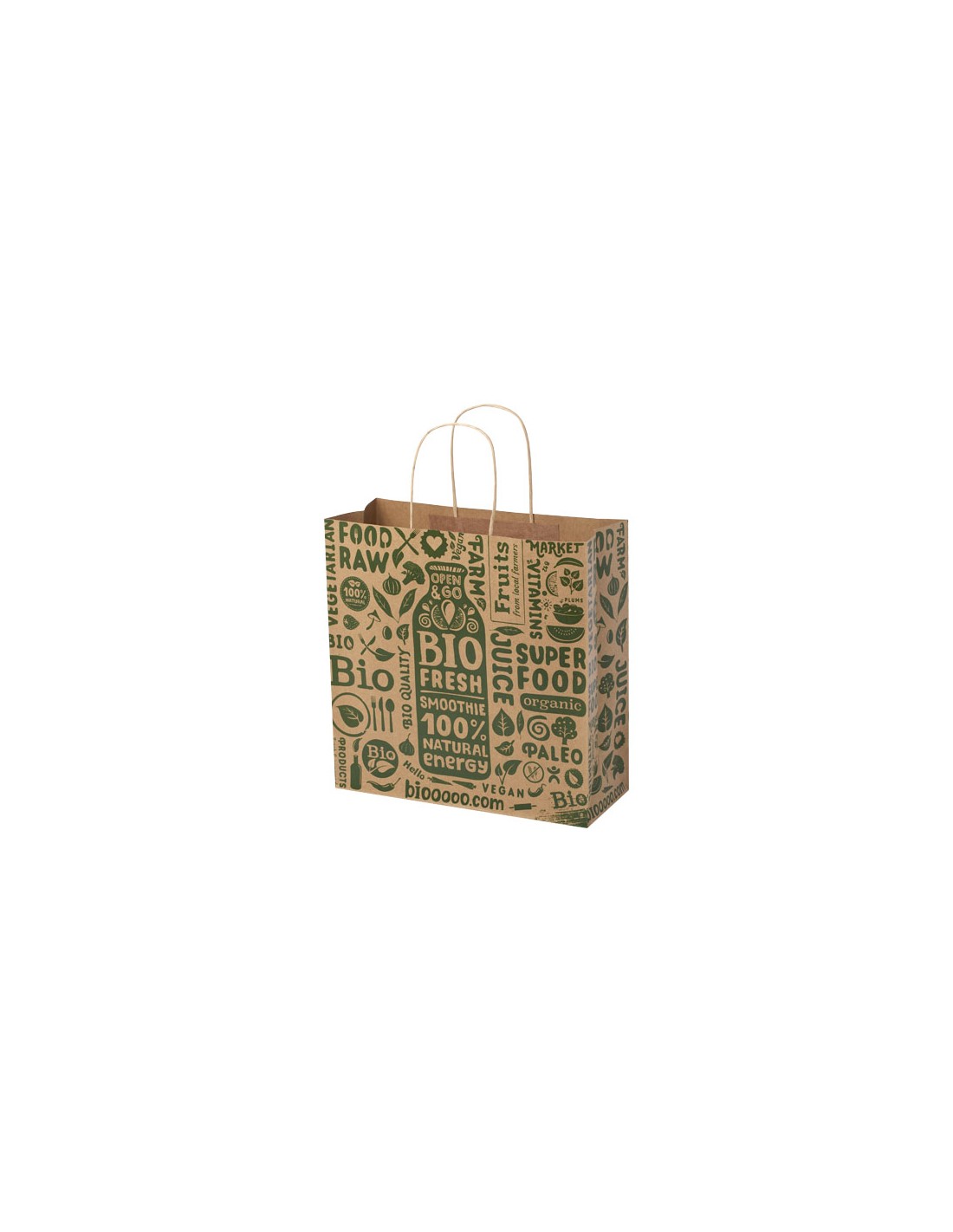 Shopper extra large in carta kraft da 120 g/m² (31 x 12 x 31 cm) con manici di carta intrecciati. La parte anteriore e posteriore personalizzabili offrono un ampio spazio per stampare un logo o qualsiasi altro design, rendendolo un ottimo strumento di marketing aziendale. Realizzato in Europa e riciclabile al 100%, questo sacchetto è una scelta più sostenibile per aziende e persone attente all'ambiente in cerca di una soluzione per il confezionamento sostenibile.