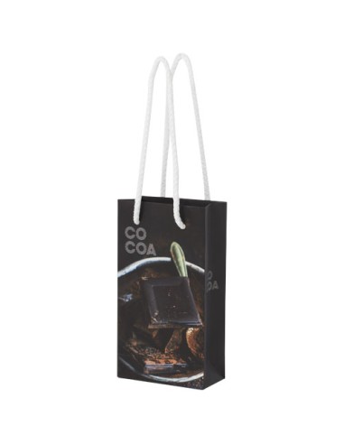 Sacchetto piccolo di carta integra da 170 g/m² opaca (9,5 x 4 x 17 cm) realizzato a mano con manici di plastica. La parte anteriore e posteriore personalizzabili offrono un ampio spazio per stampare un logo o qualsiasi altro design, rendendolo un ottimo strumento di marketing aziendale. Realizzata in Europa e riciclabile al 100%.