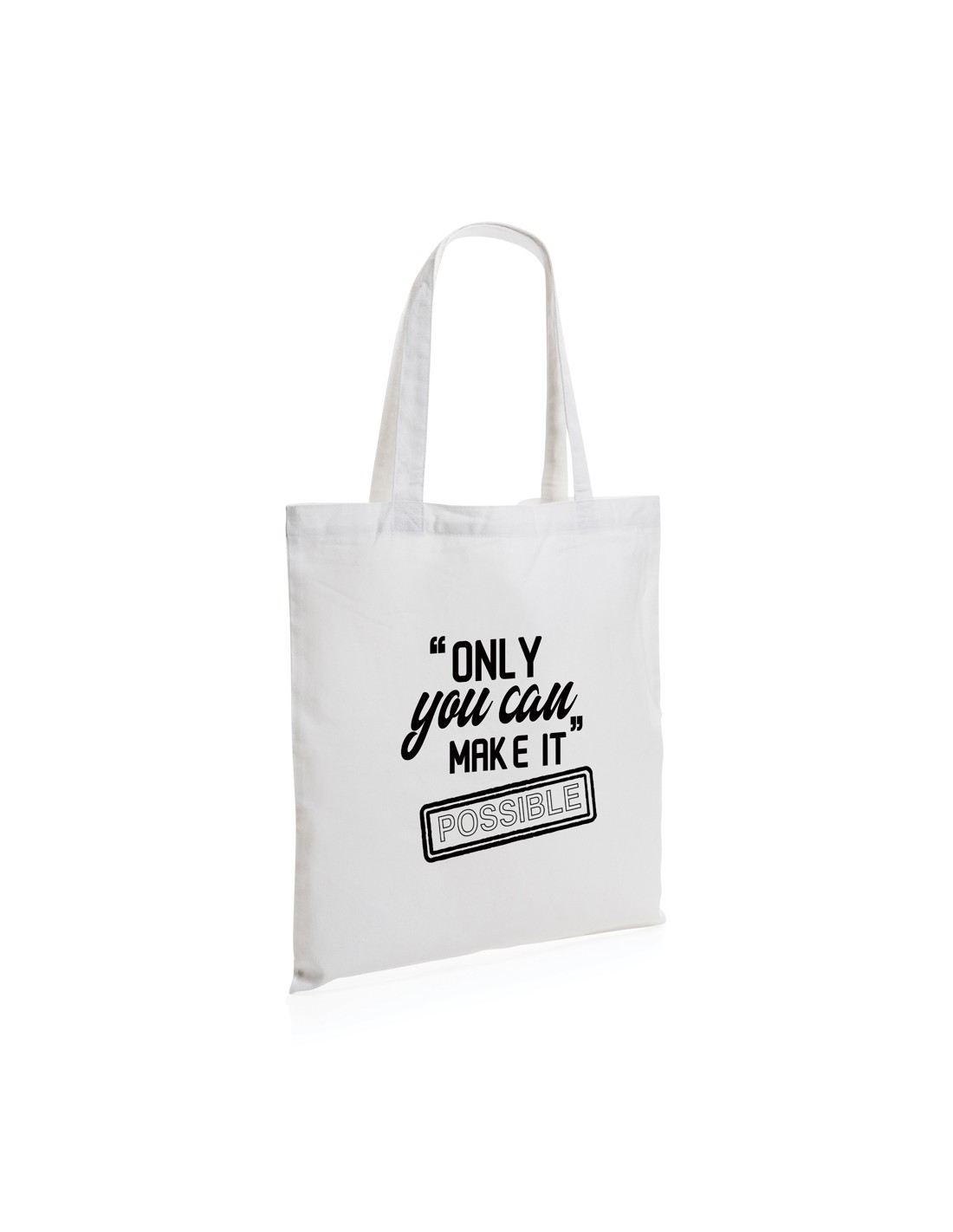 Racconta la vera storia sulla sostenibilità! Questa versatile shopper in cotone da 145gr integra la tecnologia tracciante AWARE™. Con AWARE™ è garantito l'uso di materiali in tessuto riciclato (70% cotone e 30% rPET) e le dichiarazioni di impatto sulla riduzione dell'acqua sono garantite. Risparmia acqua e utilizza tessuti riciclati genuini. Scegliendo questo articolo risparmierai 465 litri di acqua. Questo dato si basa sul confronto con tessuti convenzionali. Dati disponibili Material Snapshot 2016 pubblicati da Textile Exchange. Il 2% dei proventi di ogni prodotto Impact venduto sarà donato a Water.org.