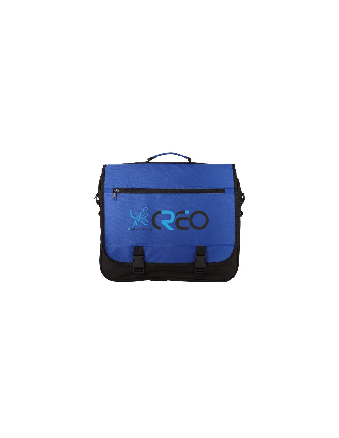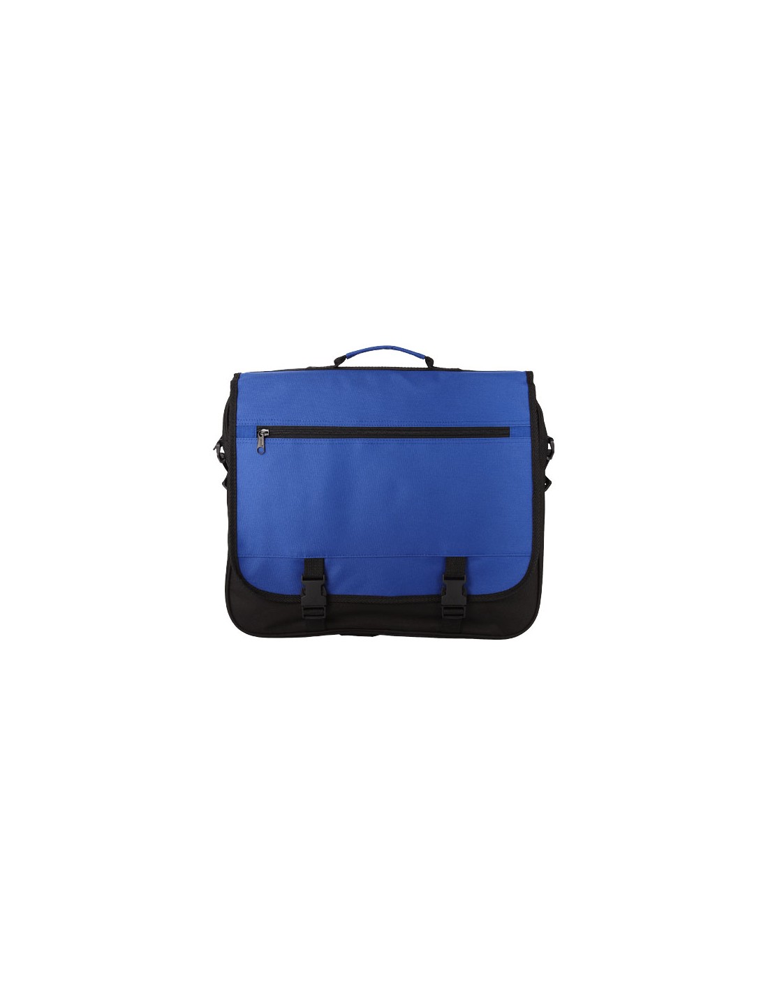 Borsa porta documenti con tracolla regolabile, chiusura della patella con fibbie, tasca frontale con zip, scomparto principale con zip e diverse tasche interne.