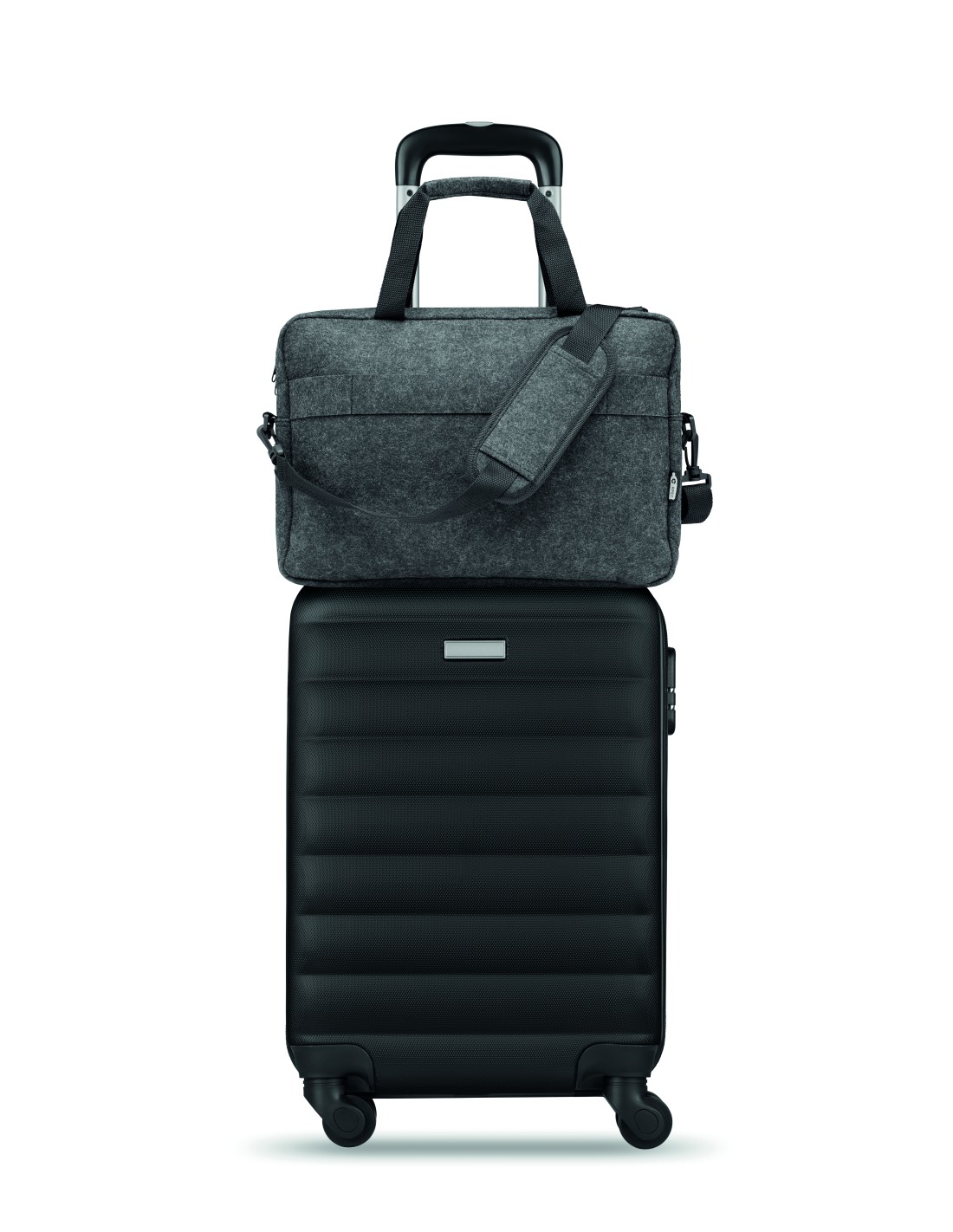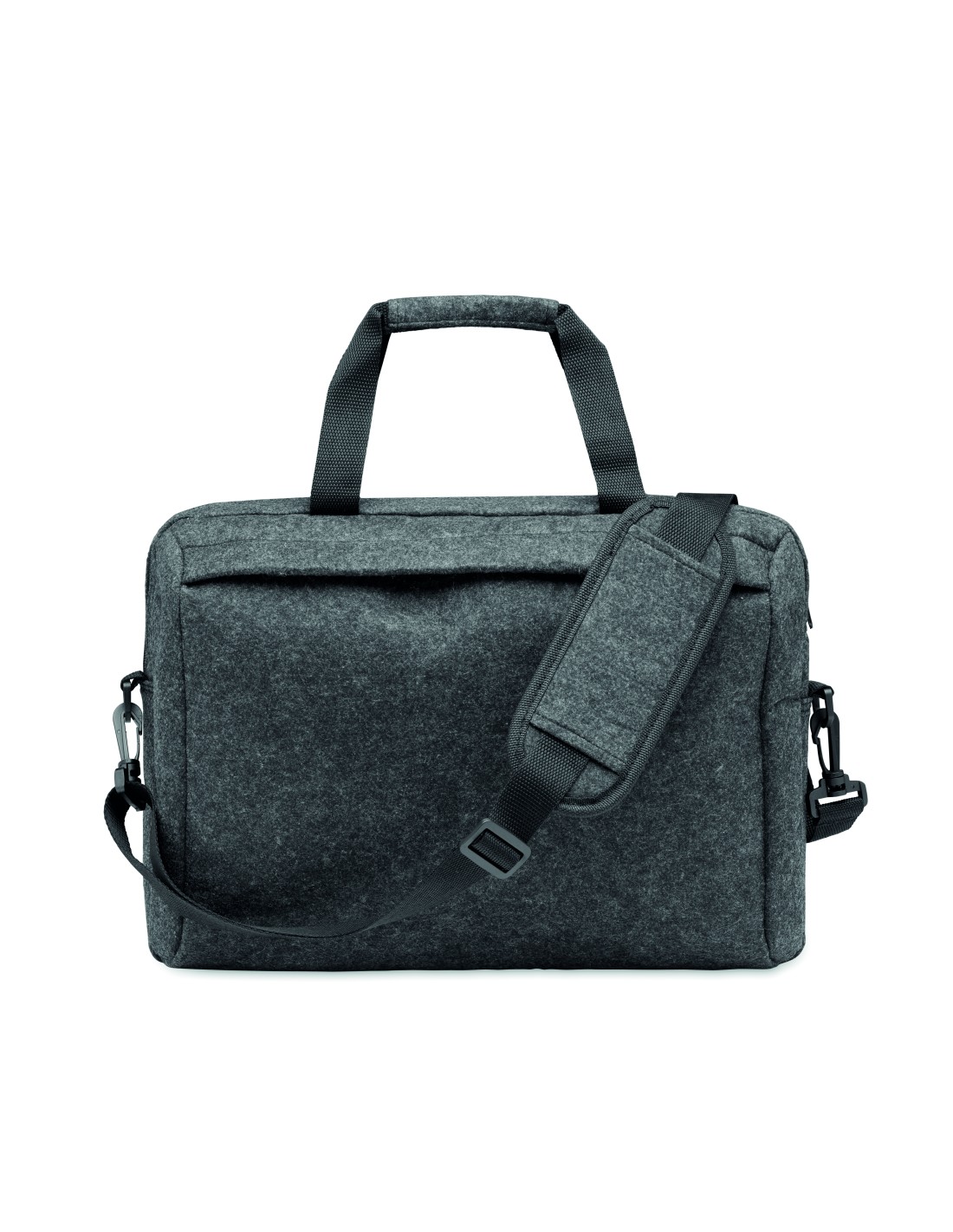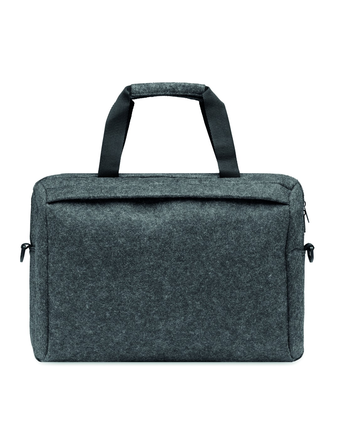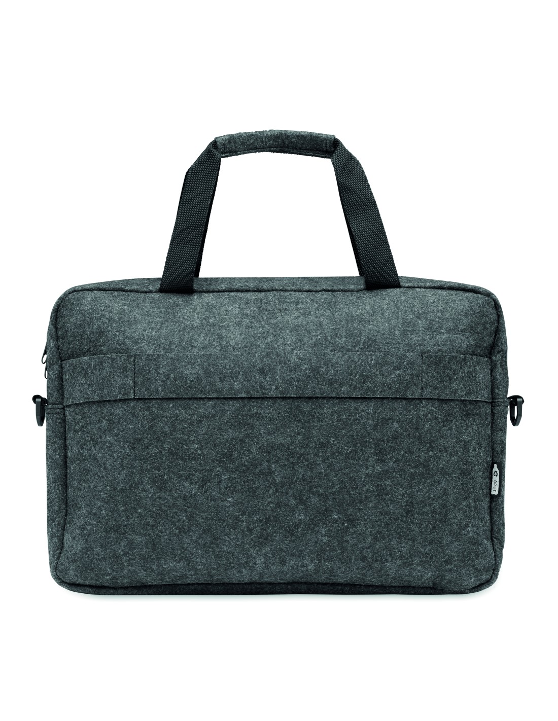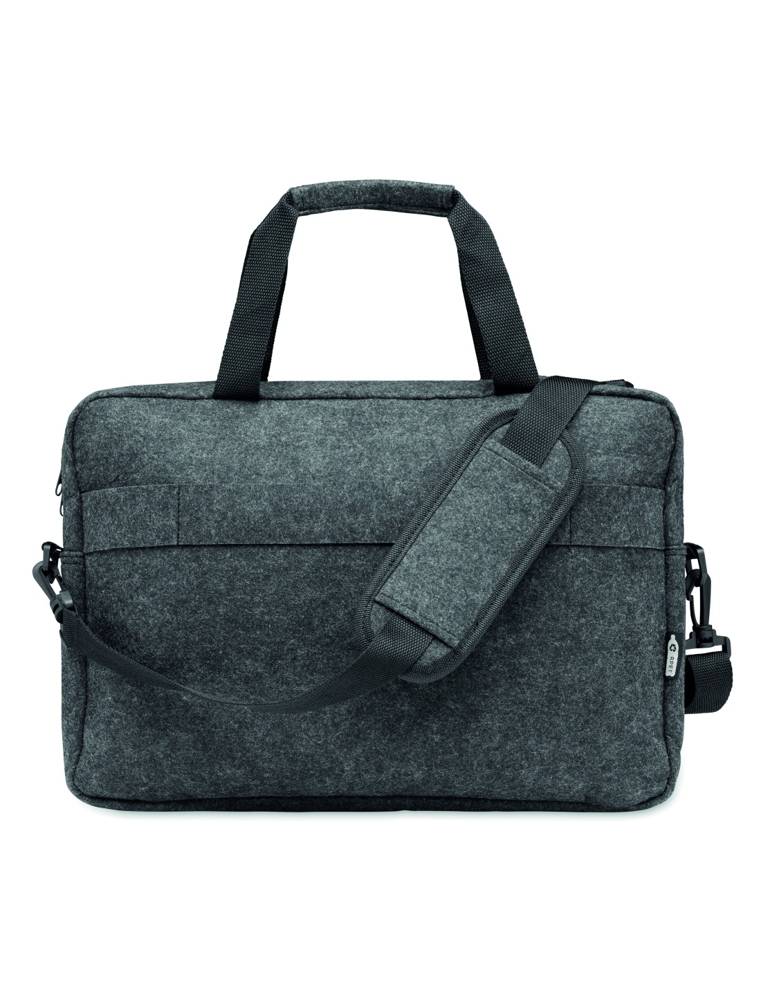 Porta laptop da 15''in feltro RPET con scomparto interno principale, tasca frontale con cerniera. Tracolla staccabile e regolabile. Supporto per trolley sul retro.