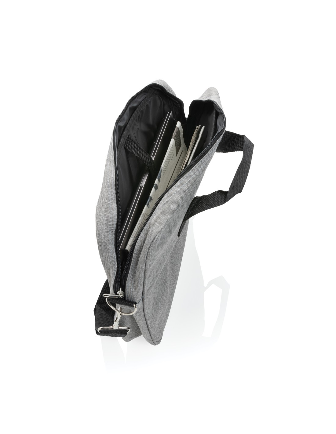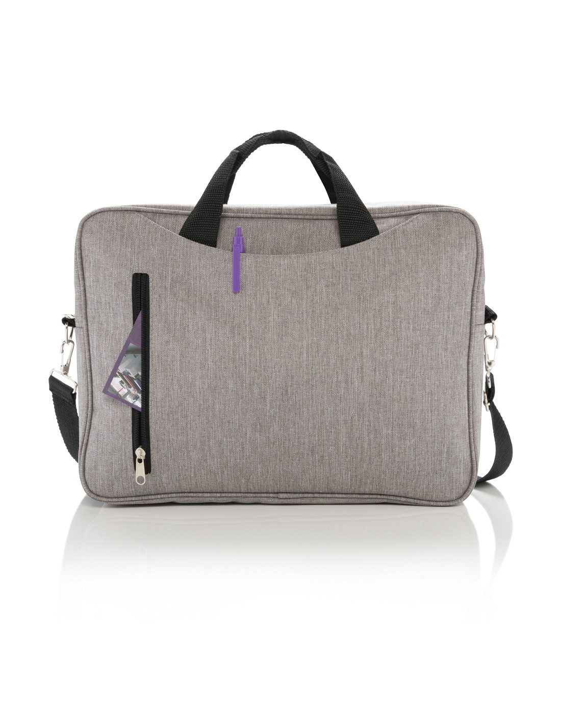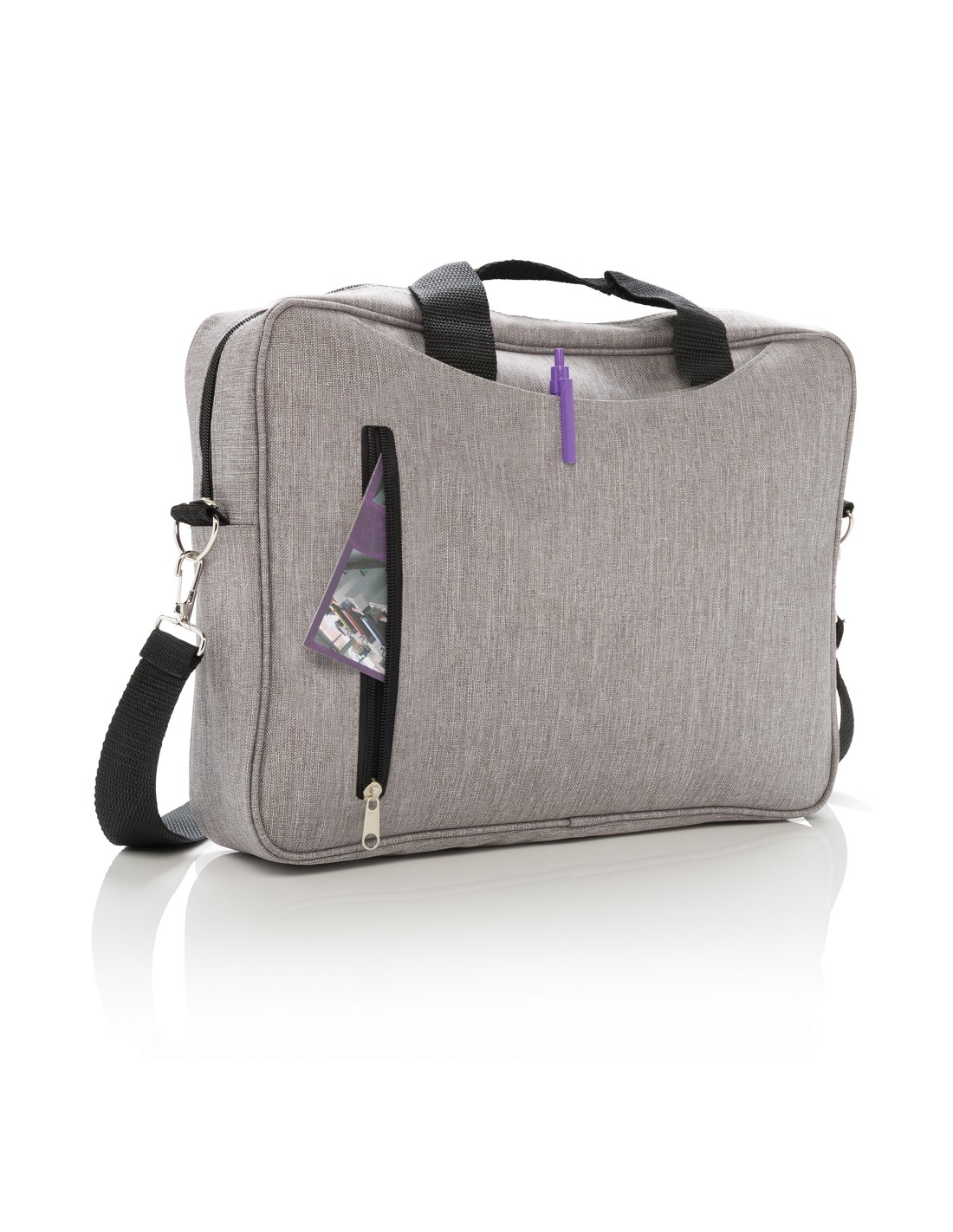 Borsa porta computer in poliestere 300D ideale per chi ama viaggiare leggero. Ha tutte le tasche che ti possono servire, uno scompartimento per computer da 15,4 pollici, scomparto porta documenti e invito per manico trolley. Senza PVC.
