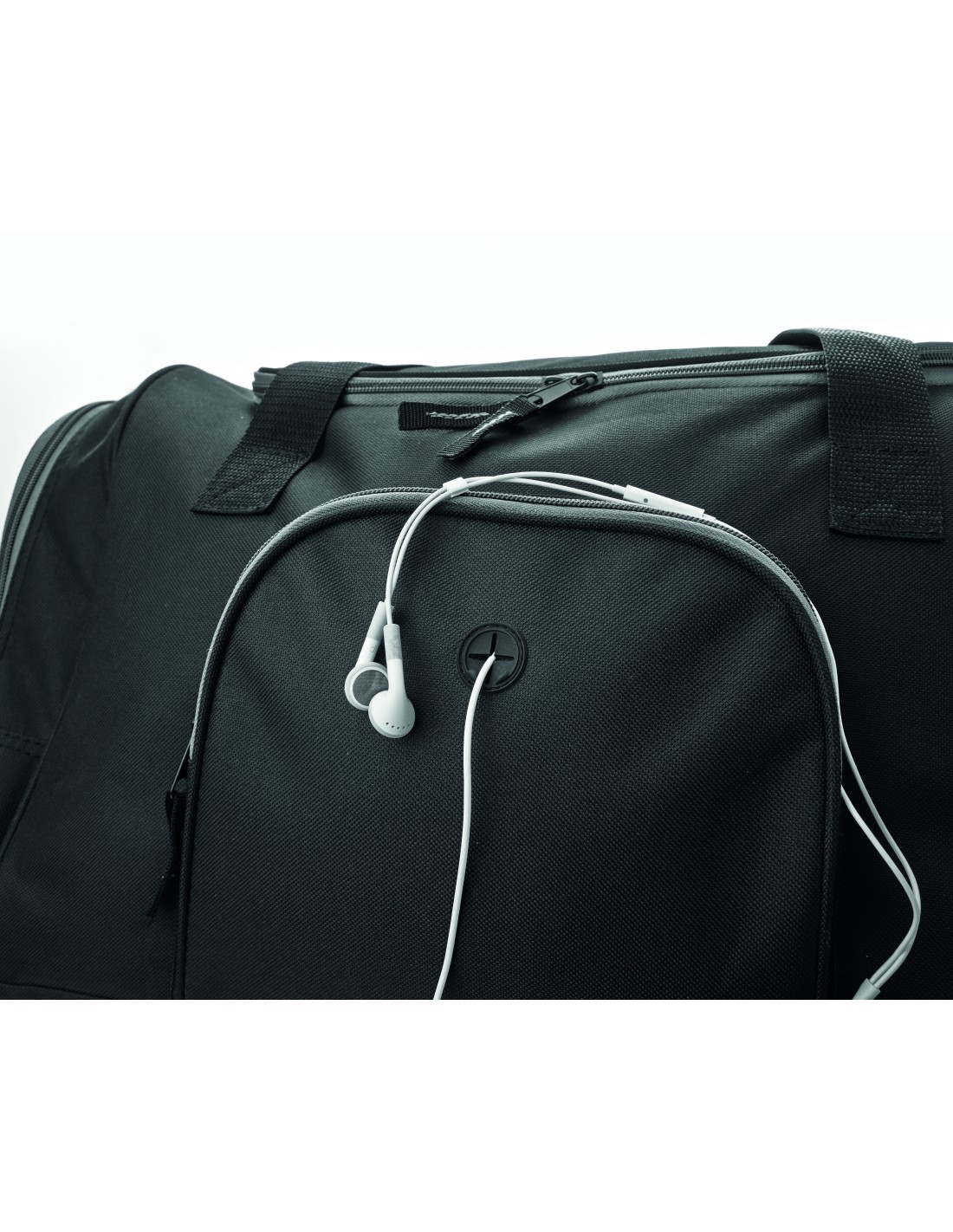 Borsone in poliestere 600D con 2 scompartimenti con chiusura zip e una tasca frontale con asola per auricolari. Tracolla regolabile e removibile inclusa.