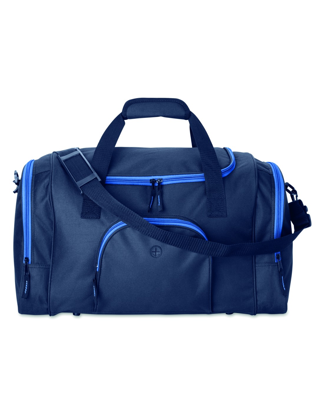 Borsone in poliestere 600D con 2 scompartimenti con chiusura zip e una tasca frontale con asola per auricolari. Tracolla regolabile e removibile inclusa.