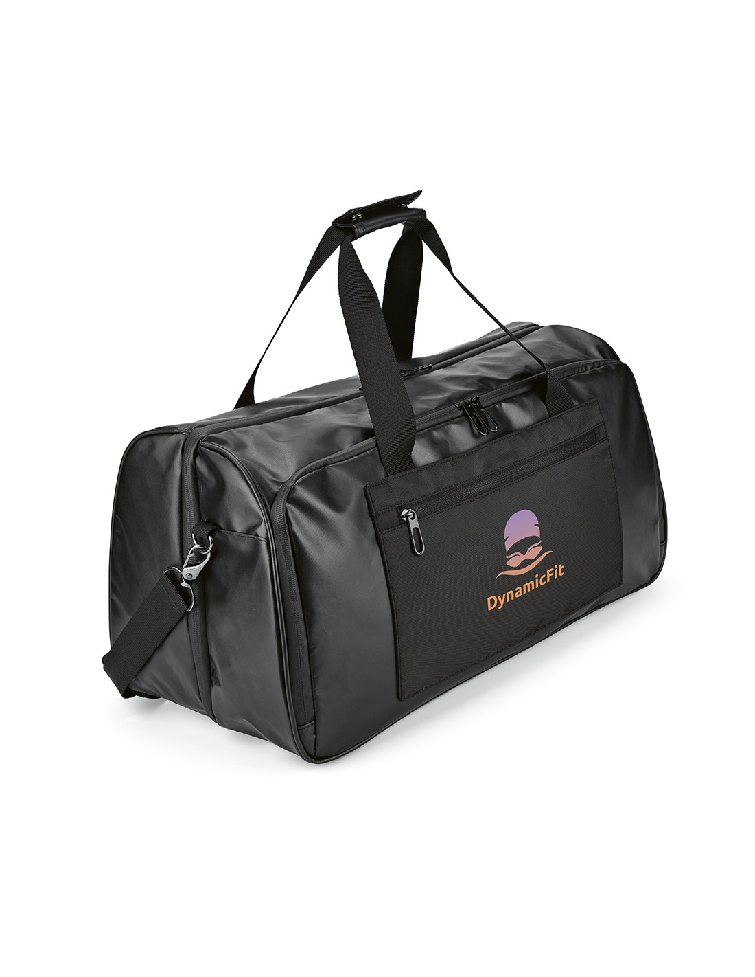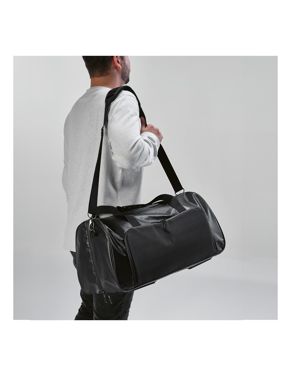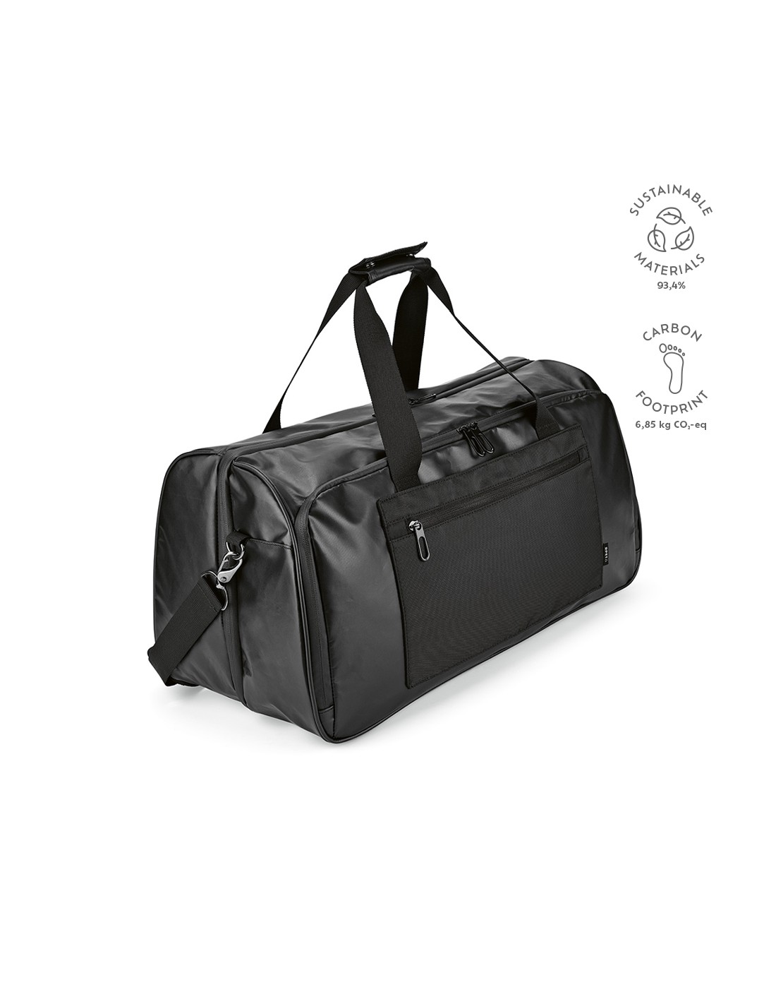 Borsone in poliestere 600D RPET con rivestimento in PU. Tasca frontale con cerniera. Fodera interna in poliestere 210D RPET. 1 scomparto laterale con cerniera / 1 scomparto laterale in rete. Tasca interna con cerniera.