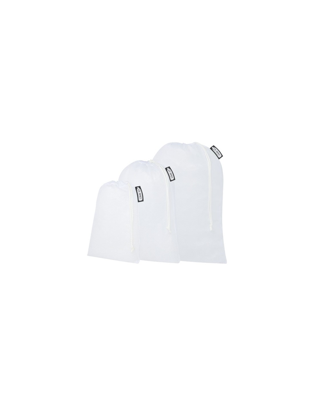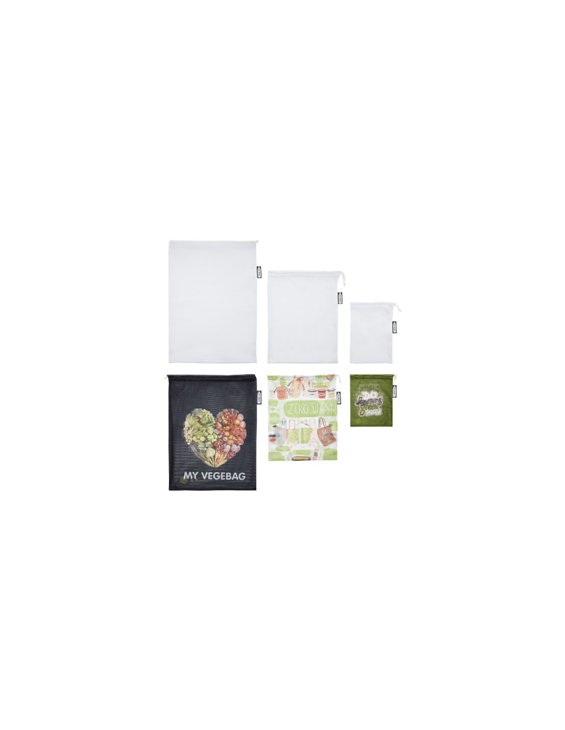 Set di tre sacchetti per frutta e verdura riutilizzabili realizzati al 100% in poliestere riciclato da 60-65 g/m² con chiusura a coulisse Disponibili nelle misure 15 x 21 cm, 25 x 32 cm, 30 x 41 cm. L'utilizzo di questi sacchetti fornisce un contributo eco-friendly alla riduzione delle borse di plastica. La resistenza di questi prodotti ne garantisce lavabilità e riutilizzabilità, assicurandone al contempo pulizia ed igiene. Stampabili su tutta la superficie in sublimazione. Realizzati in Europa.