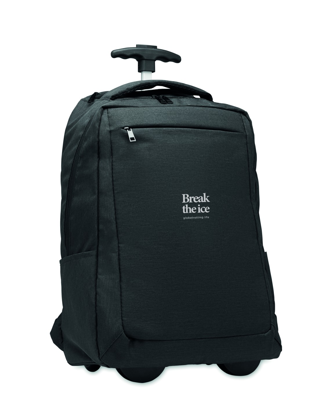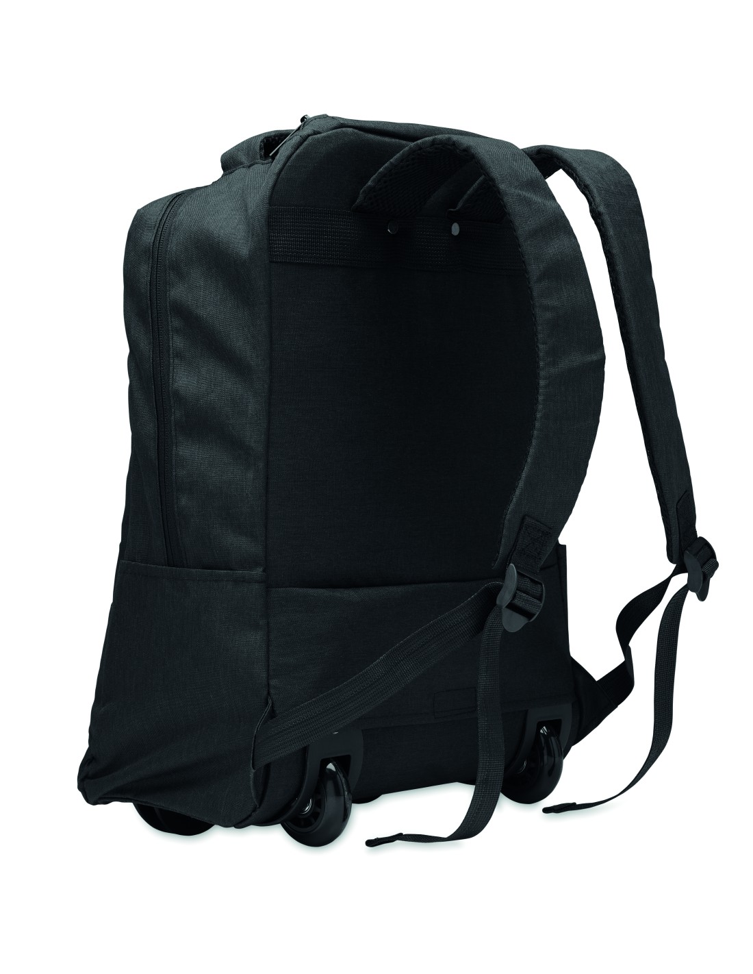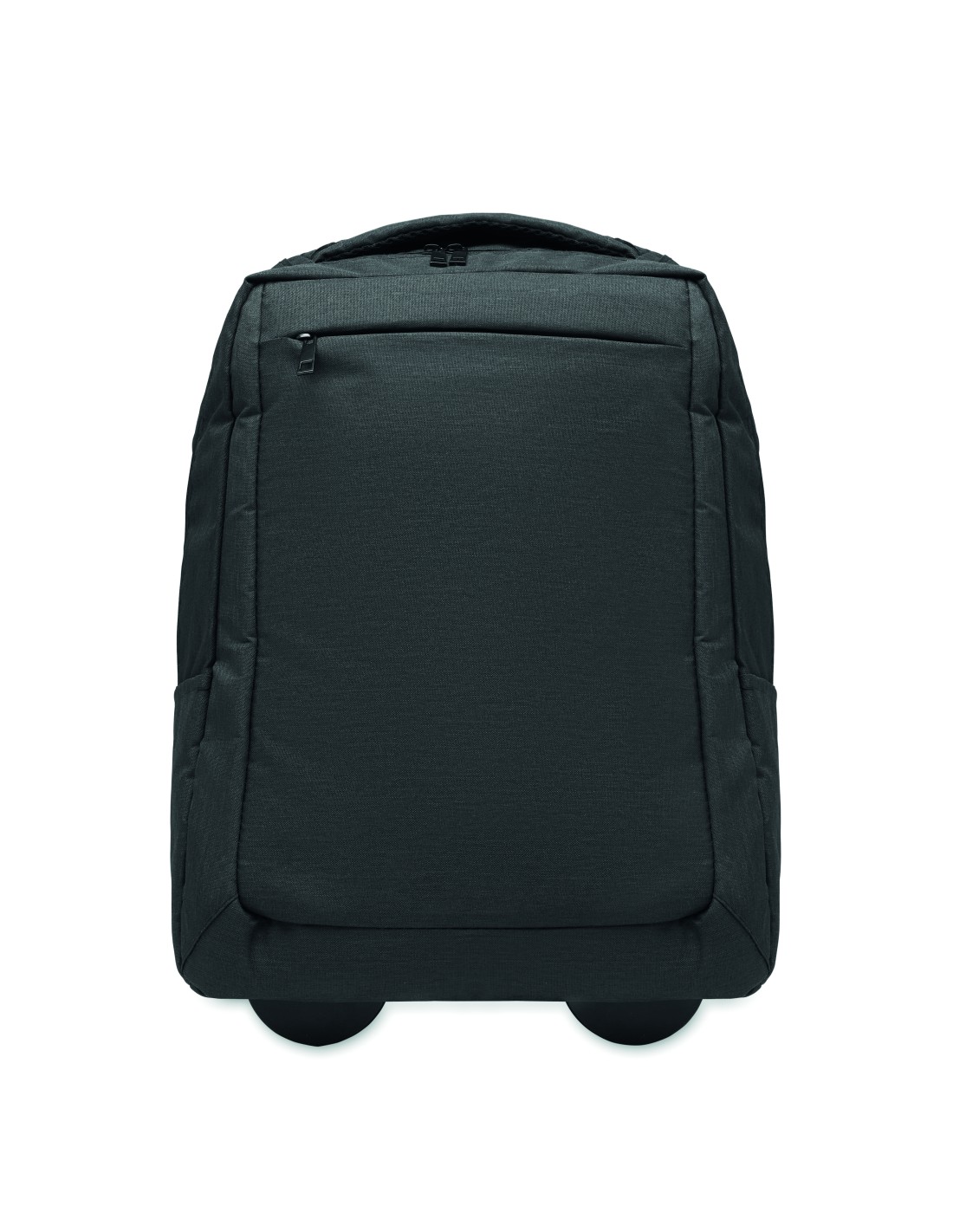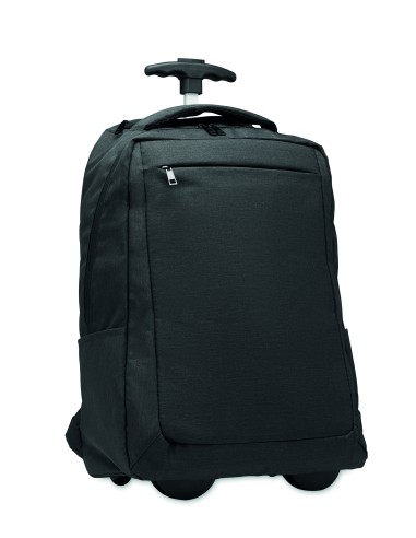 Zaino per laptop con ruote in poliestere 600D RPET. Uno scomparto interno per laptop da 15 pollici. Tasca frontale con cerniera. Due tasche laterali a scorrimento. Tre tasche interne. Schienale e spallacci imbottiti. 2 ruote e telaio a doppio tubo.