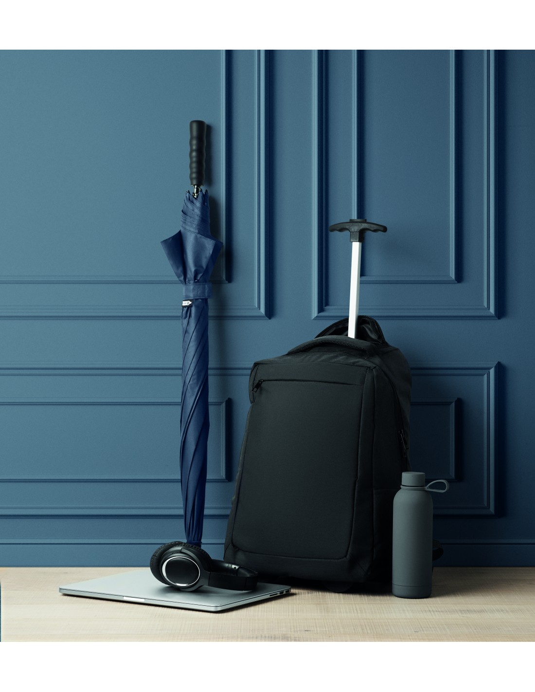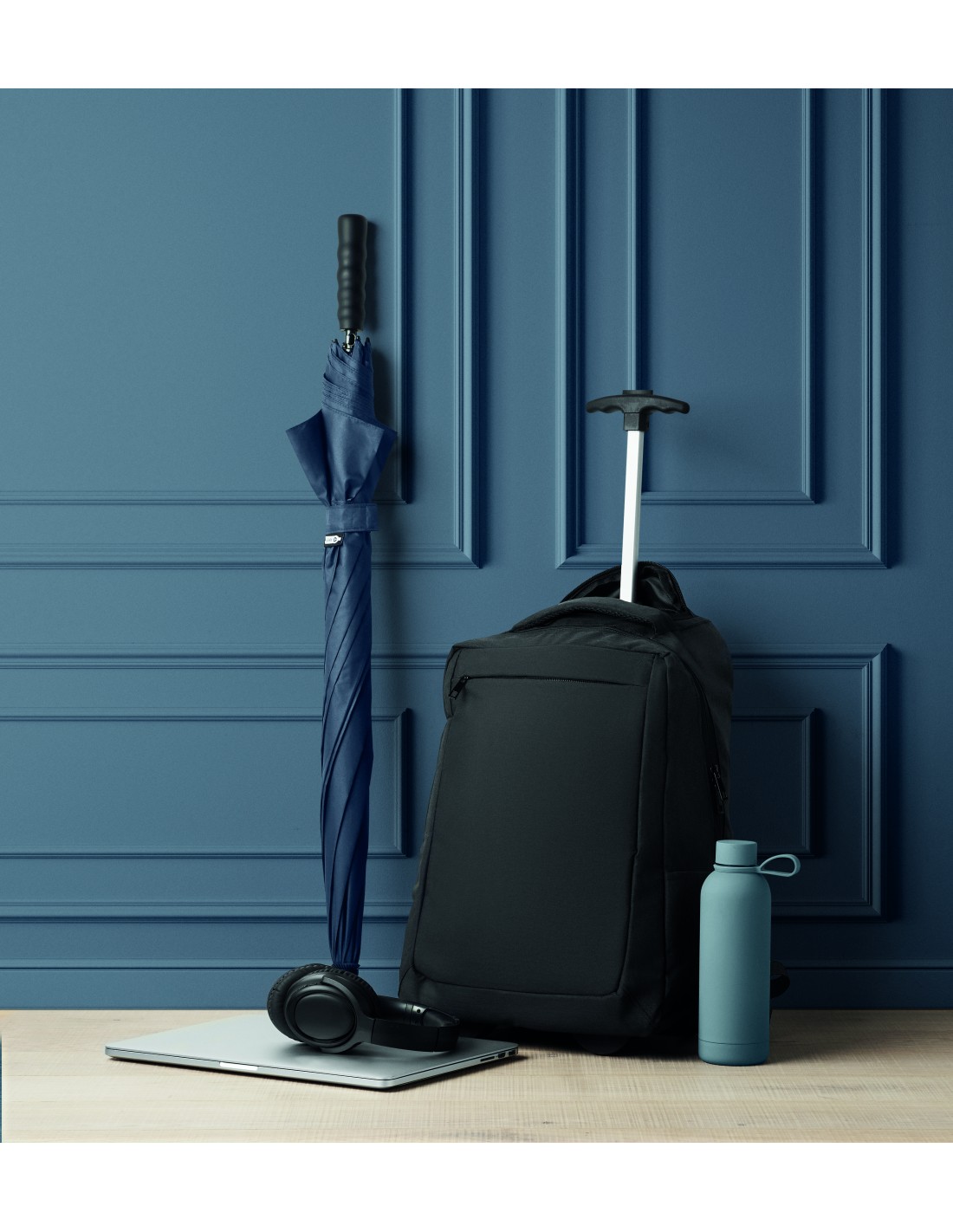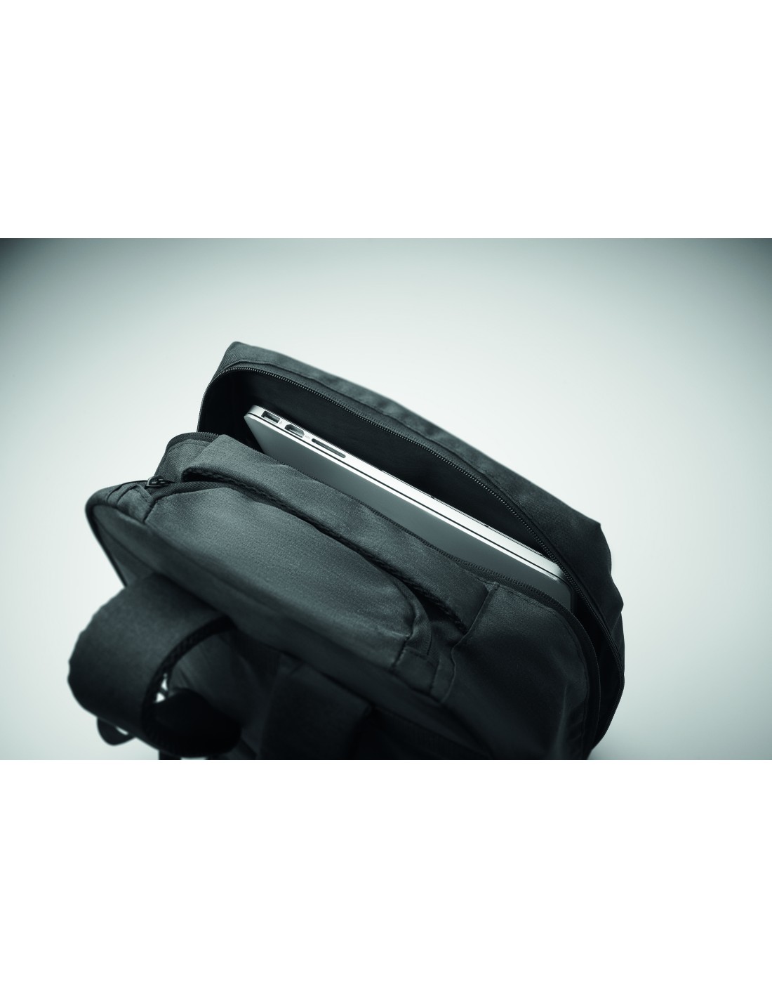 Zaino per laptop con ruote in poliestere 600D RPET. Uno scomparto interno per laptop da 15 pollici. Tasca frontale con cerniera. Due tasche laterali a scorrimento. Tre tasche interne. Schienale e spallacci imbottiti. 2 ruote e telaio a doppio tubo.