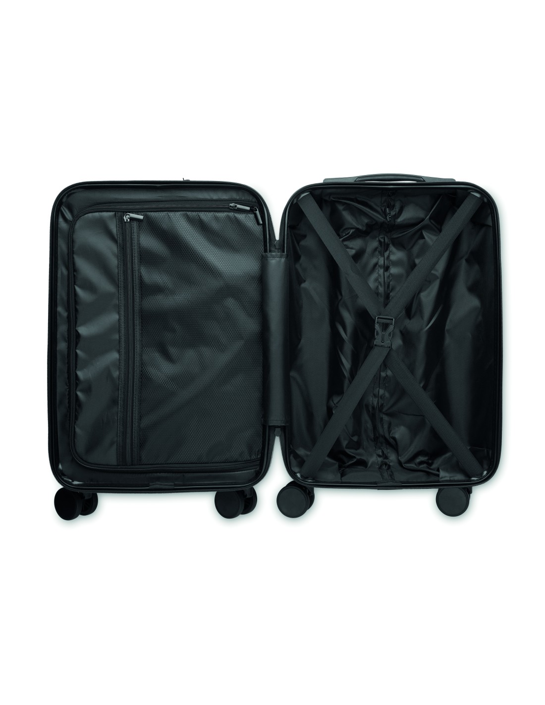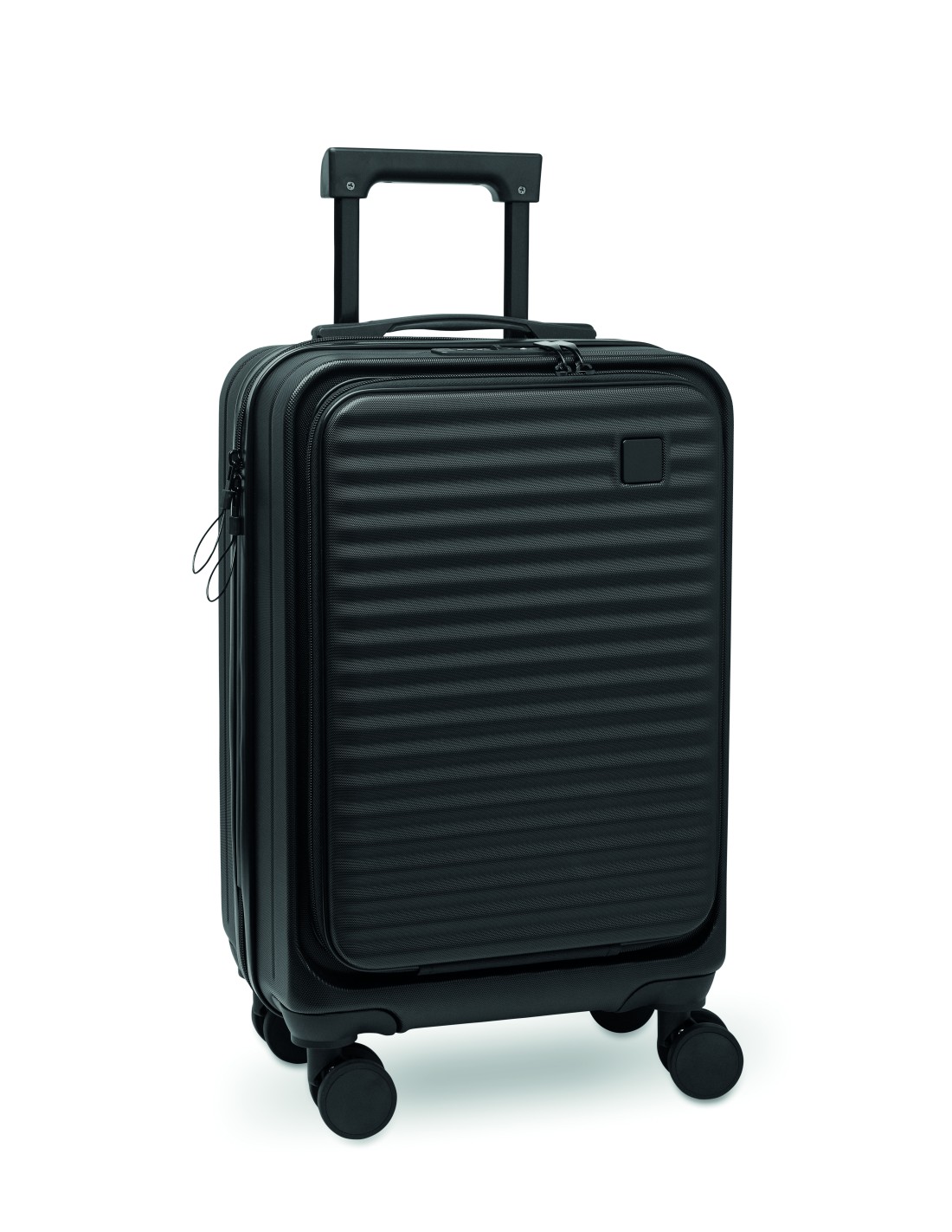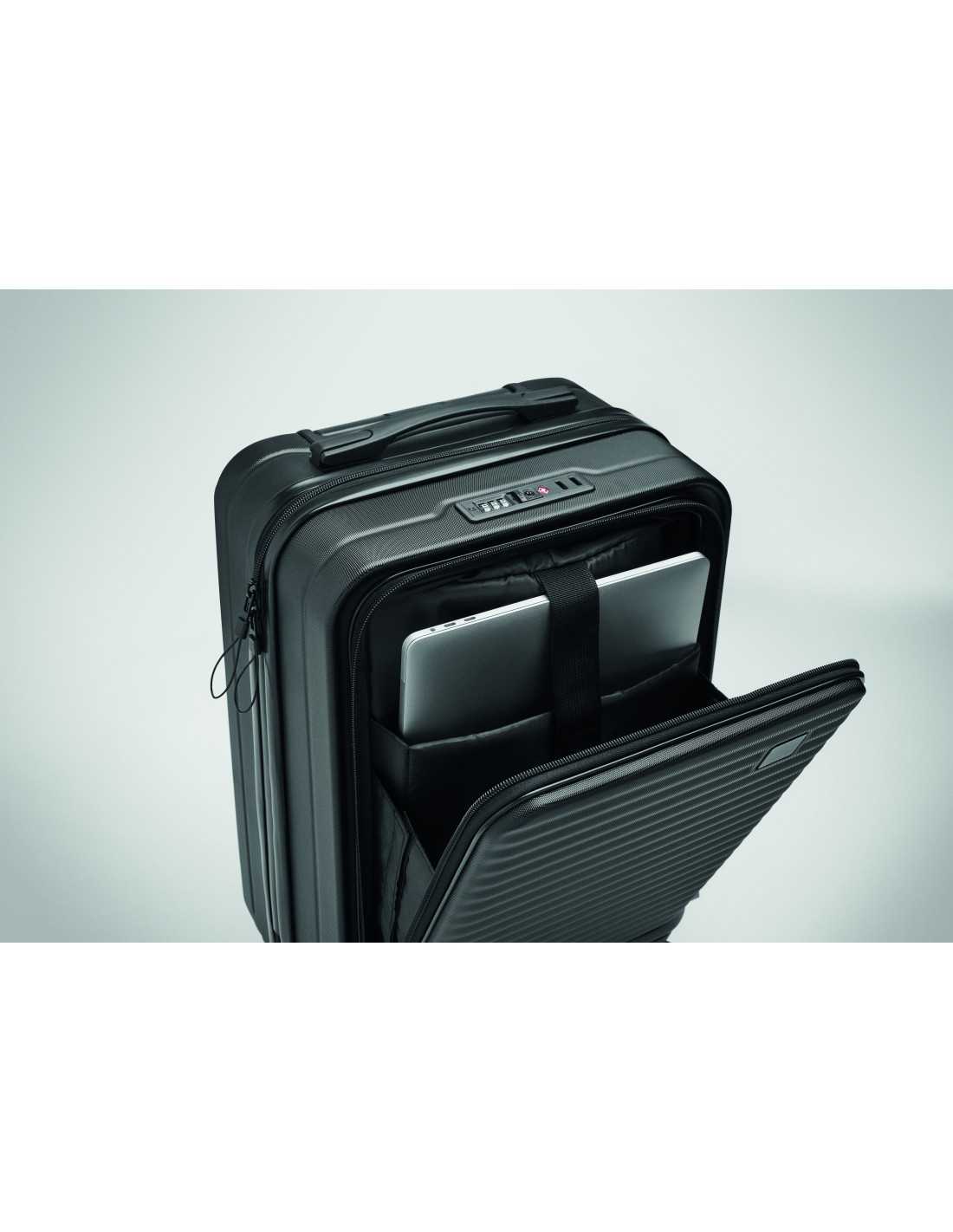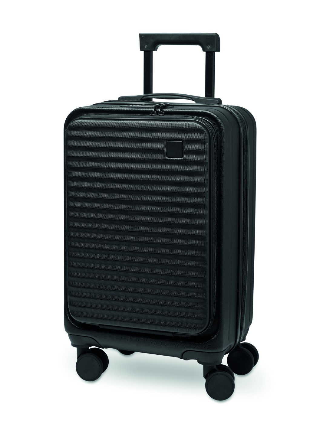 Trolley rigido da 20 pollici in ABS. 1 scomparto principale con scomparto interno. Scomparto anteriore aggiuntivo con cerniera per documenti e scomparto imbottito per laptop da 15''. Include un lucchetto di sicurezza (TSA). Si muove su 4 ruote.