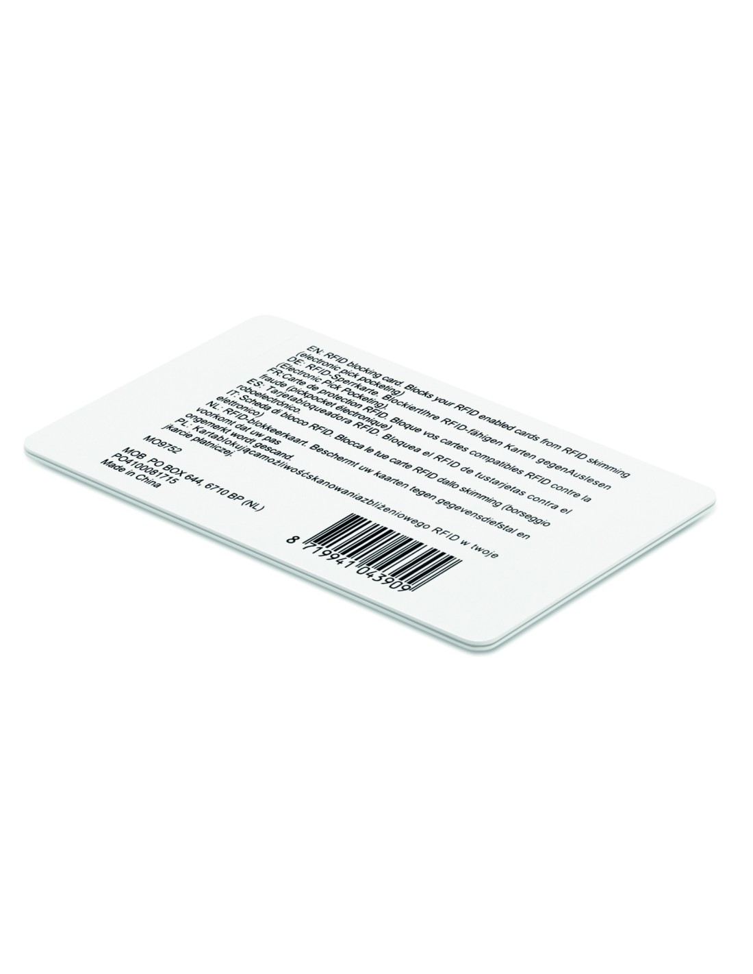 Scheda di blocco RFID. Lo strato di alluminio all'interno di questa carta blocca tutte le frequenze radio che passano attraverso. Tutte le altre carte dietro questa carta bloccante saranno protette (borseggio elettronico). (0,76 mm).