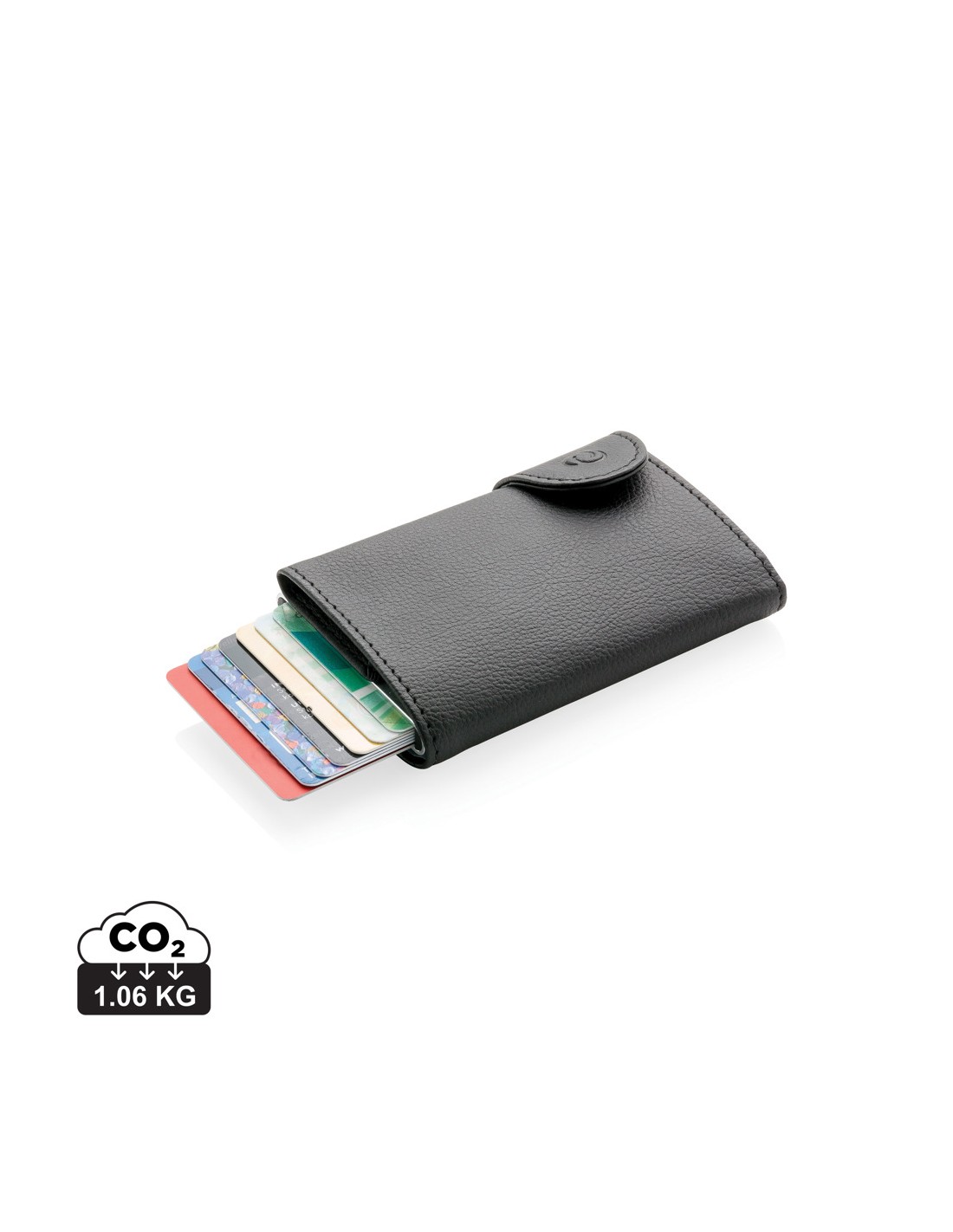 Sottile e semplice. Biglietti da visita, carte bancarie, documenti d'identità: tutto ciò che ti serve in un unico posto. Il porta badge è realizzato in tessuto 600D EcoSystem™ e presenta una fodera, entrambi realizzati con bottiglie d'acqua post-consumo riciclate al 100%. Dotato di un blocco RFID...