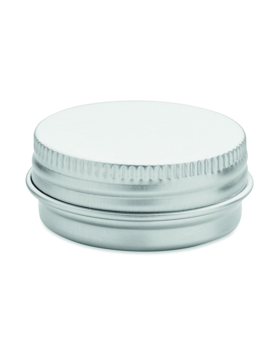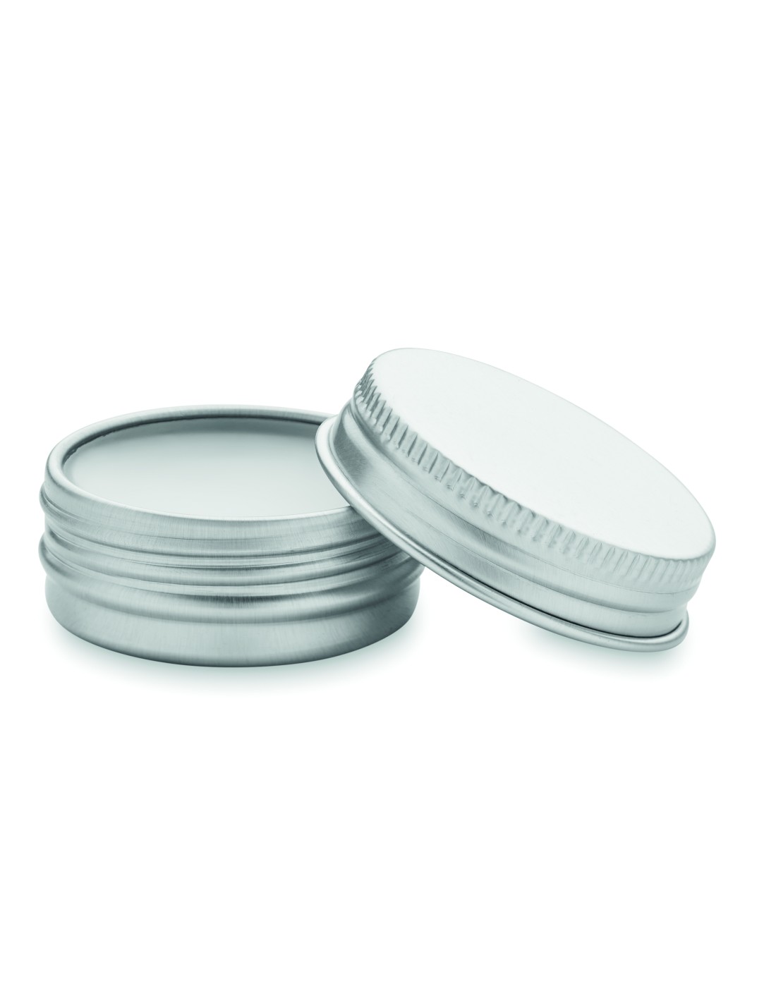 Balsamo labbra vegano in barattolo rotondo di alluminio con tappo a vite. Dermatologicamente testato. SPF10.Sapore: Vaniglia.