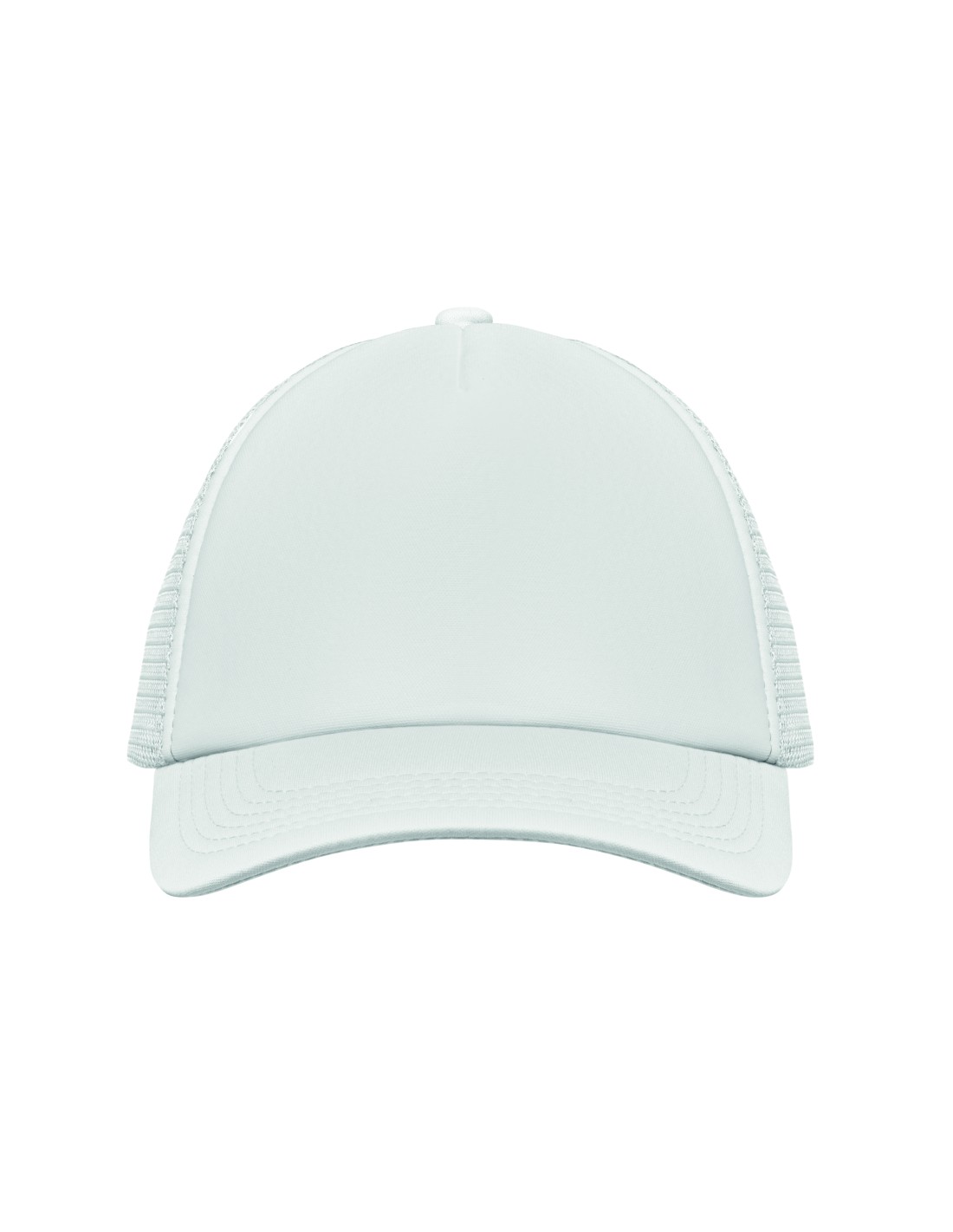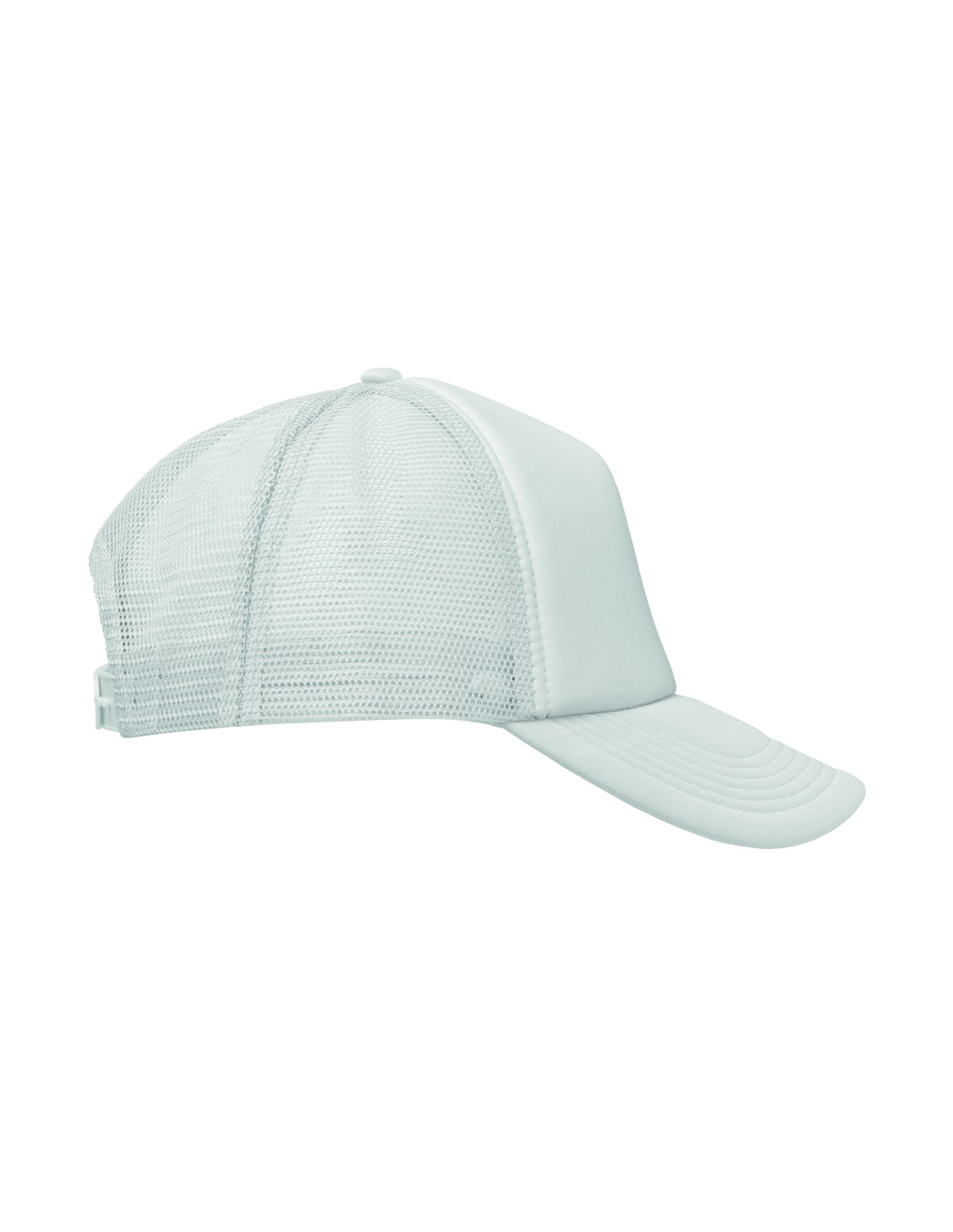 cappello truckers a 5 pannelli in poliestere 140-150 gr/m² con chiusura a scatto regolabile in plastica. Pannello frontale bianco e visiera colorata in jersey di poliestere con supporto in schiuma. Altri pannelli in rete colorata. Taglia 7 1/4.