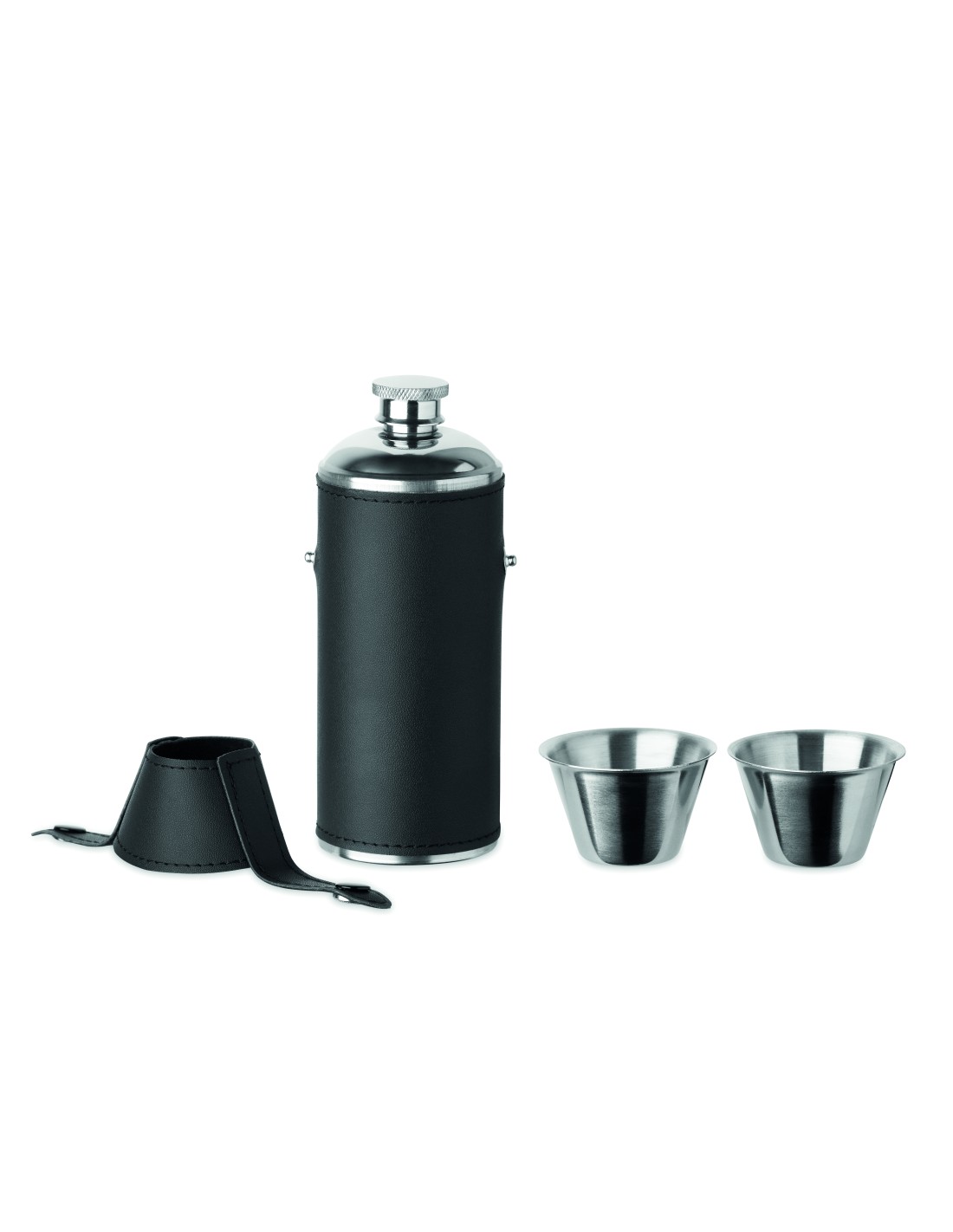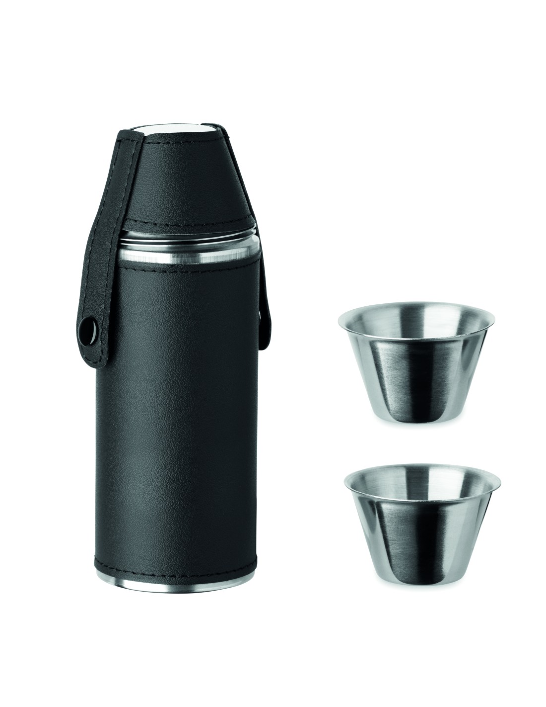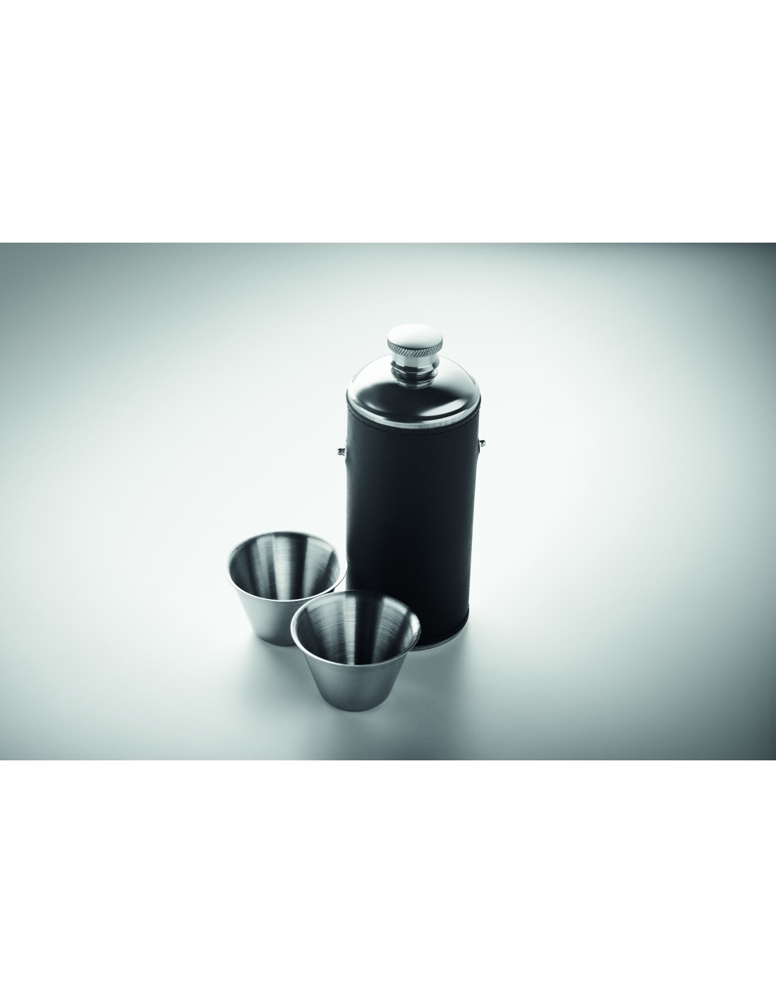 Hip Flask in acciaio inossidabile con superficie in pelle PU e 2 bicchieri da 20 ml in acciaio inossidabile nel coperchio. Capacità: 230 ml.