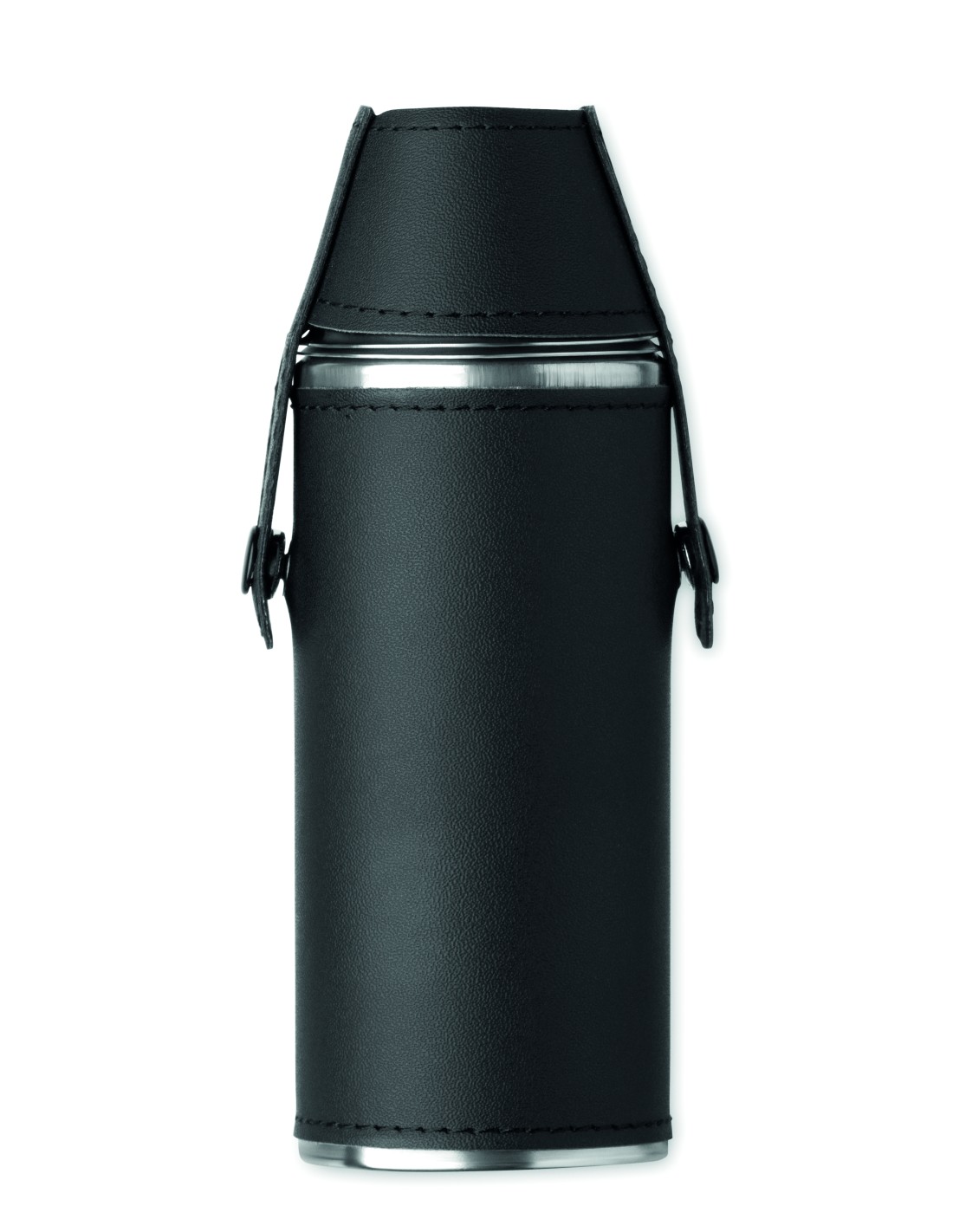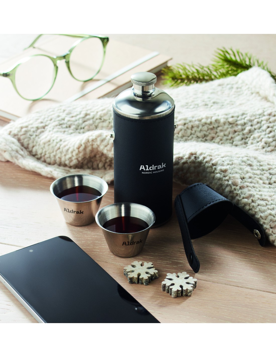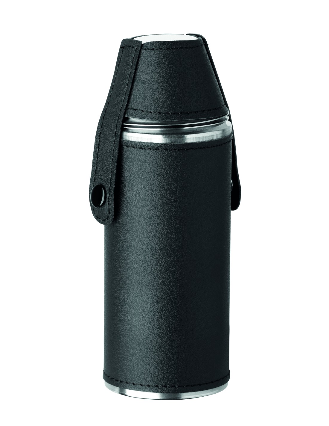 Hip Flask in acciaio inossidabile con superficie in pelle PU e 2 bicchieri da 20 ml in acciaio inossidabile nel coperchio. Capacità: 230 ml.