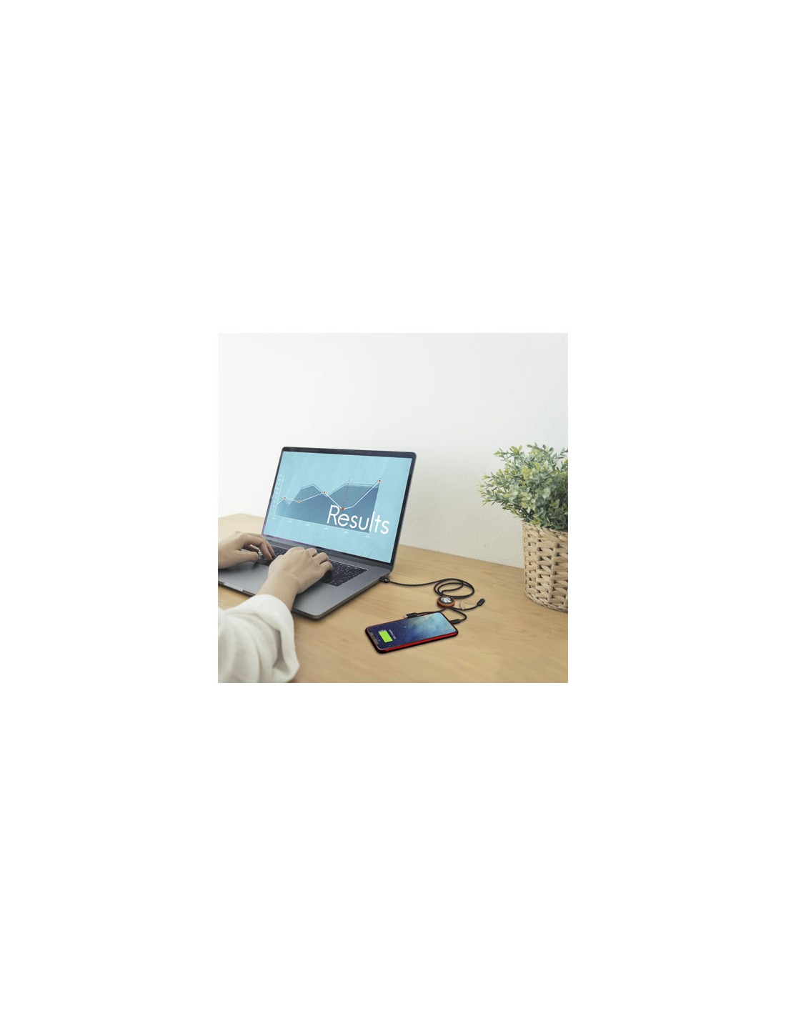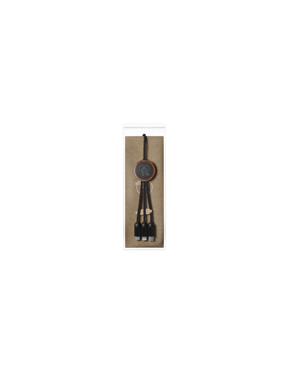 Cavo di ricarica esteso 3 in 1 in PET riciclato con logo luminoso e custodia rotonda in bambù. Il logo luminoso è visibile su entrambi i lati. Dispone di 3 connettori (tipo C, micro USB, iPhone) e di un connettore USB doppio per uso universale. Fornito in un astuccio in TPU, con un biglietto in carta kraft. Lunghezza del cavo: 1 metro. Garanzia di 3 anni inclusa.