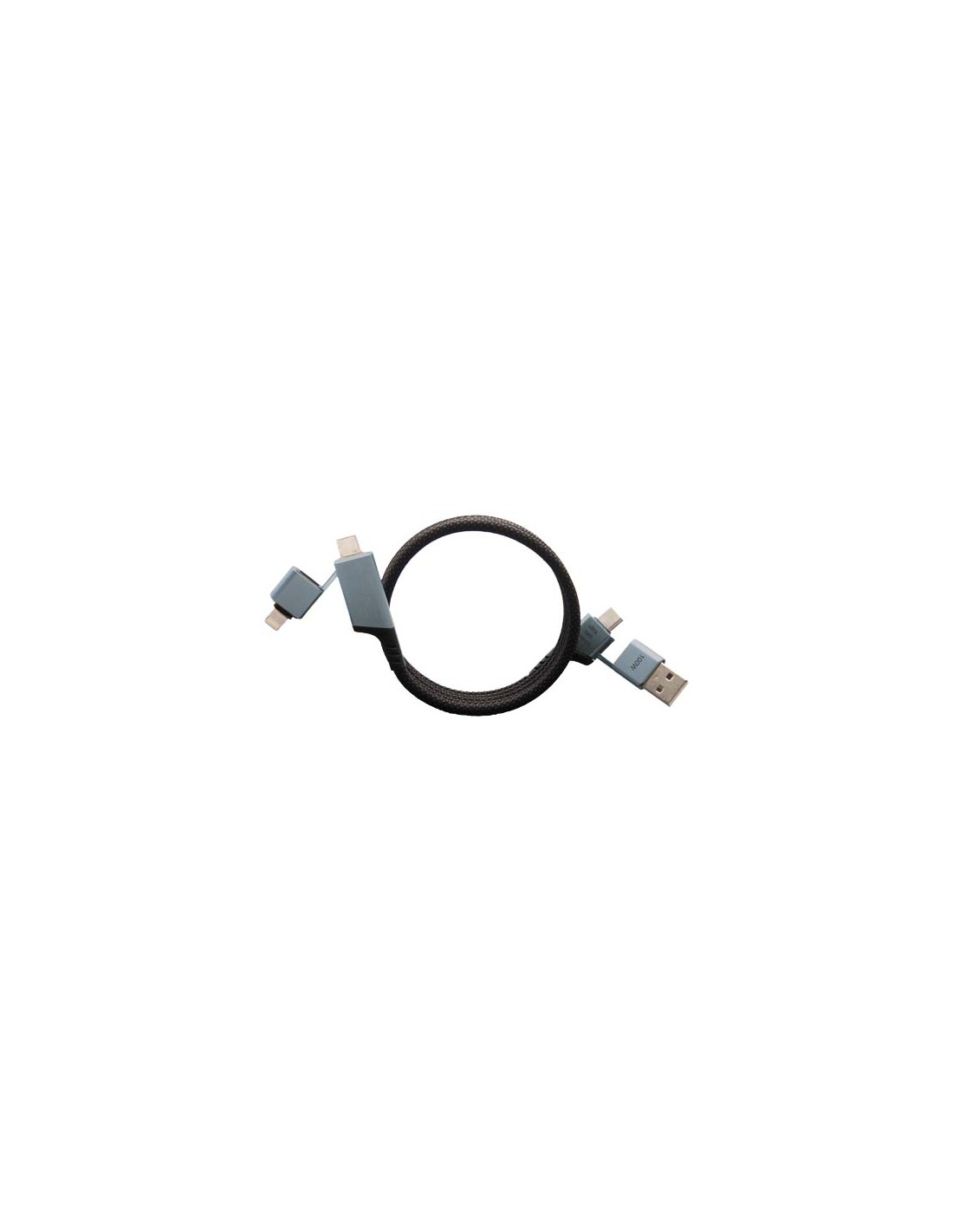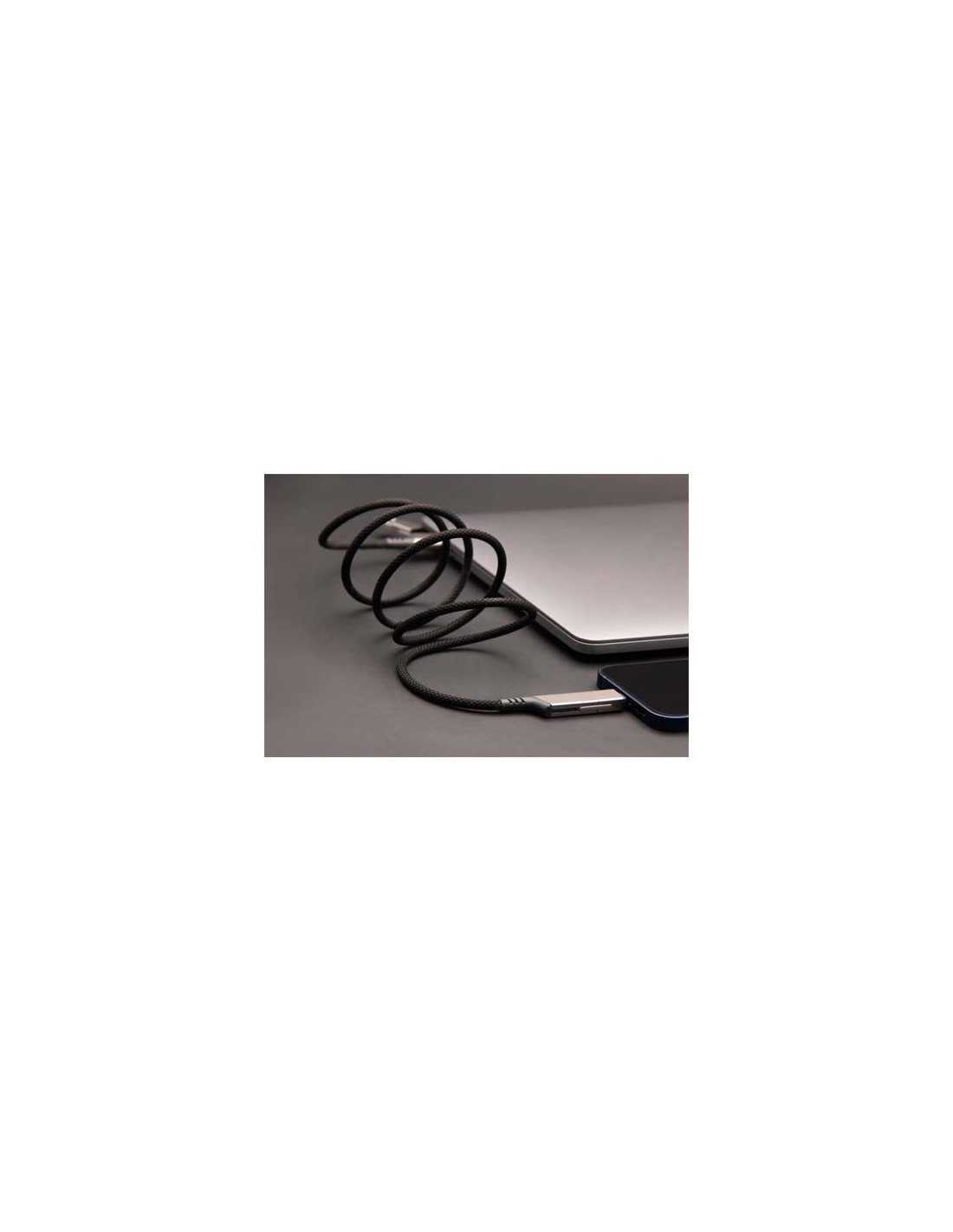 Cavo di ricarica con logo luminoso, finitura in gomma e dotato di tre connettori (tipo C, Android, iPhone). È possibile caricare fino a tre dispositivi contemporaneamente. Lunghezza dei cavi (spine incluse): 10 cm. Cavo in plastica PET riciclata ed'imballaggio realizzato in carta e plastica...