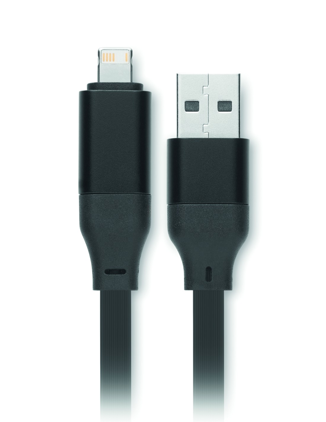 Cavo da 60W con involucro in ABS riciclato, portachiavi e supporto per telefono. Ingresso: 2-in-1 Tipo-C e Tipo-A. Uscita: Tipo-C e micro-B (2 in 1 pin). Lunghezza del cavo: 26 cm.