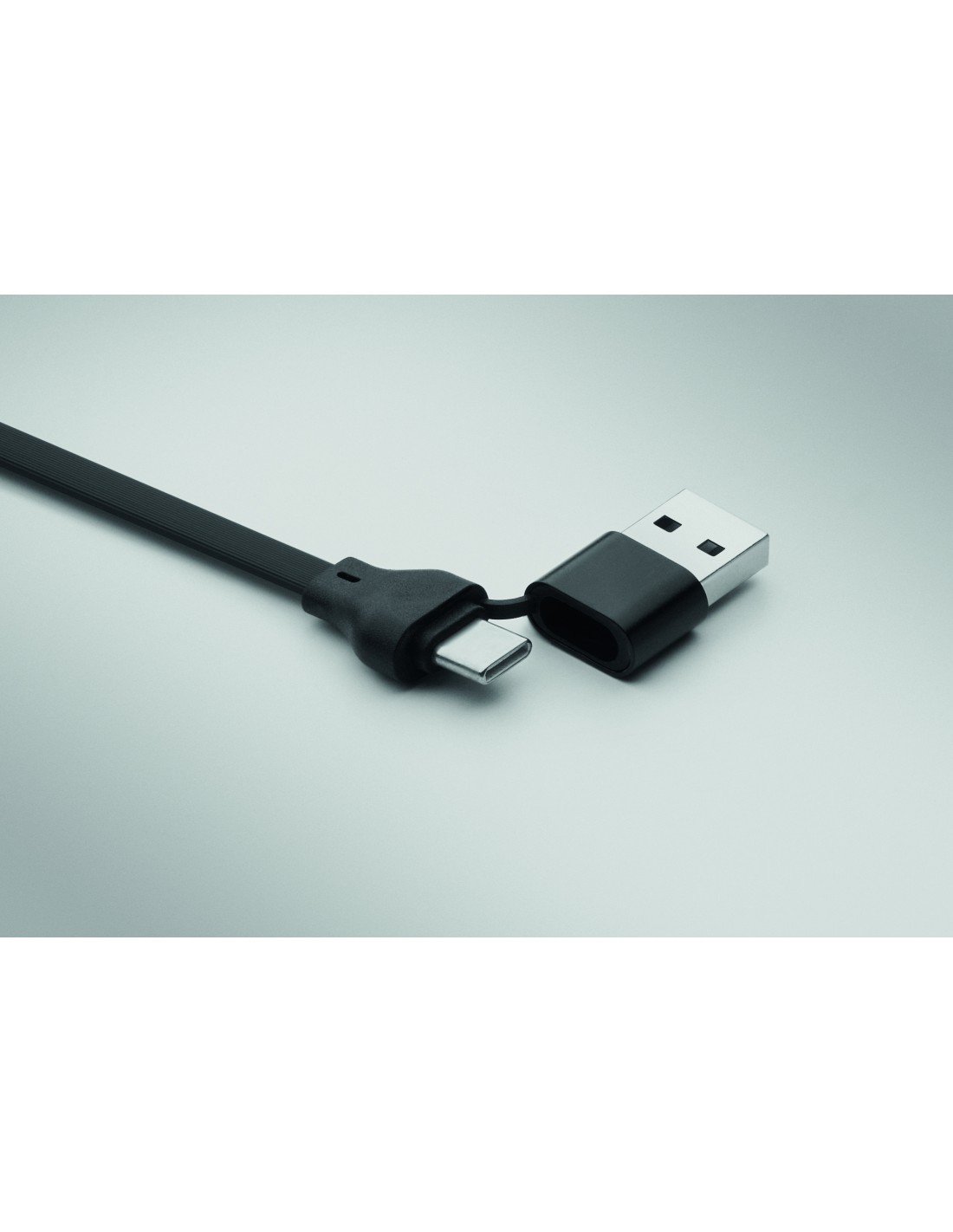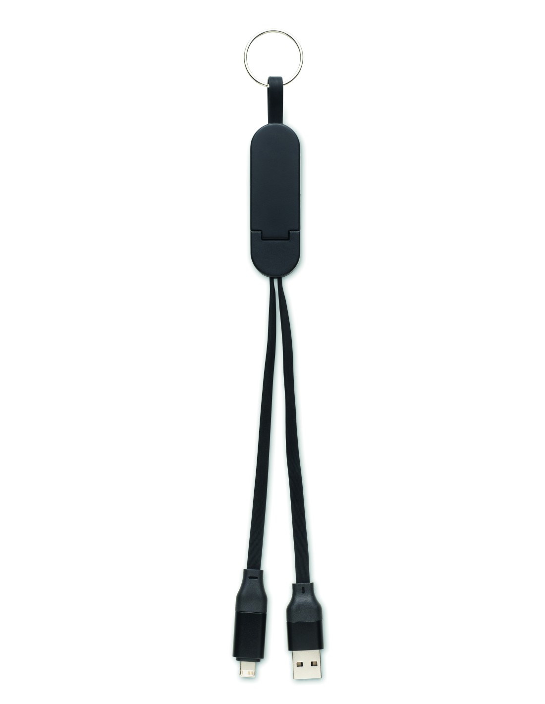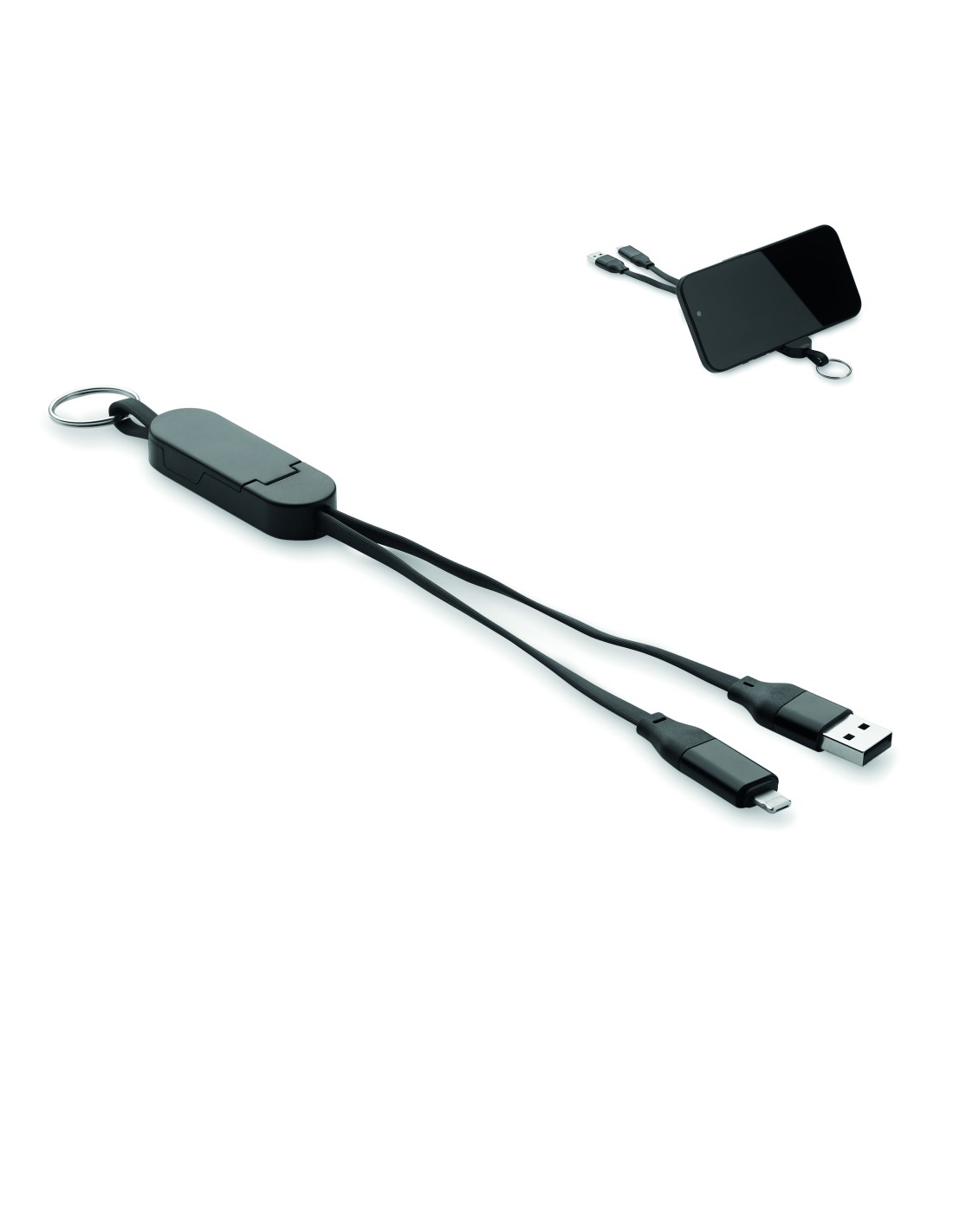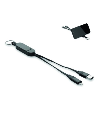 Cavo da 60W con involucro in ABS riciclato, portachiavi e supporto per telefono. Ingresso: 2-in-1 Tipo-C e Tipo-A. Uscita: Tipo-C e micro-B (2 in 1 pin). Lunghezza del cavo: 26 cm.