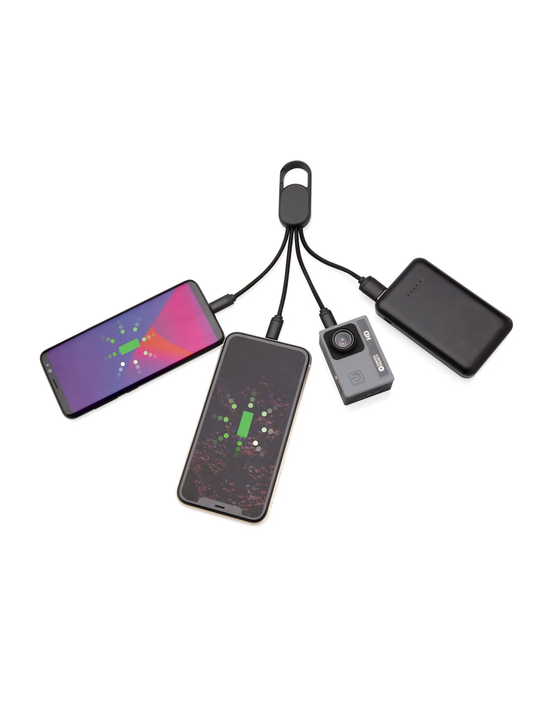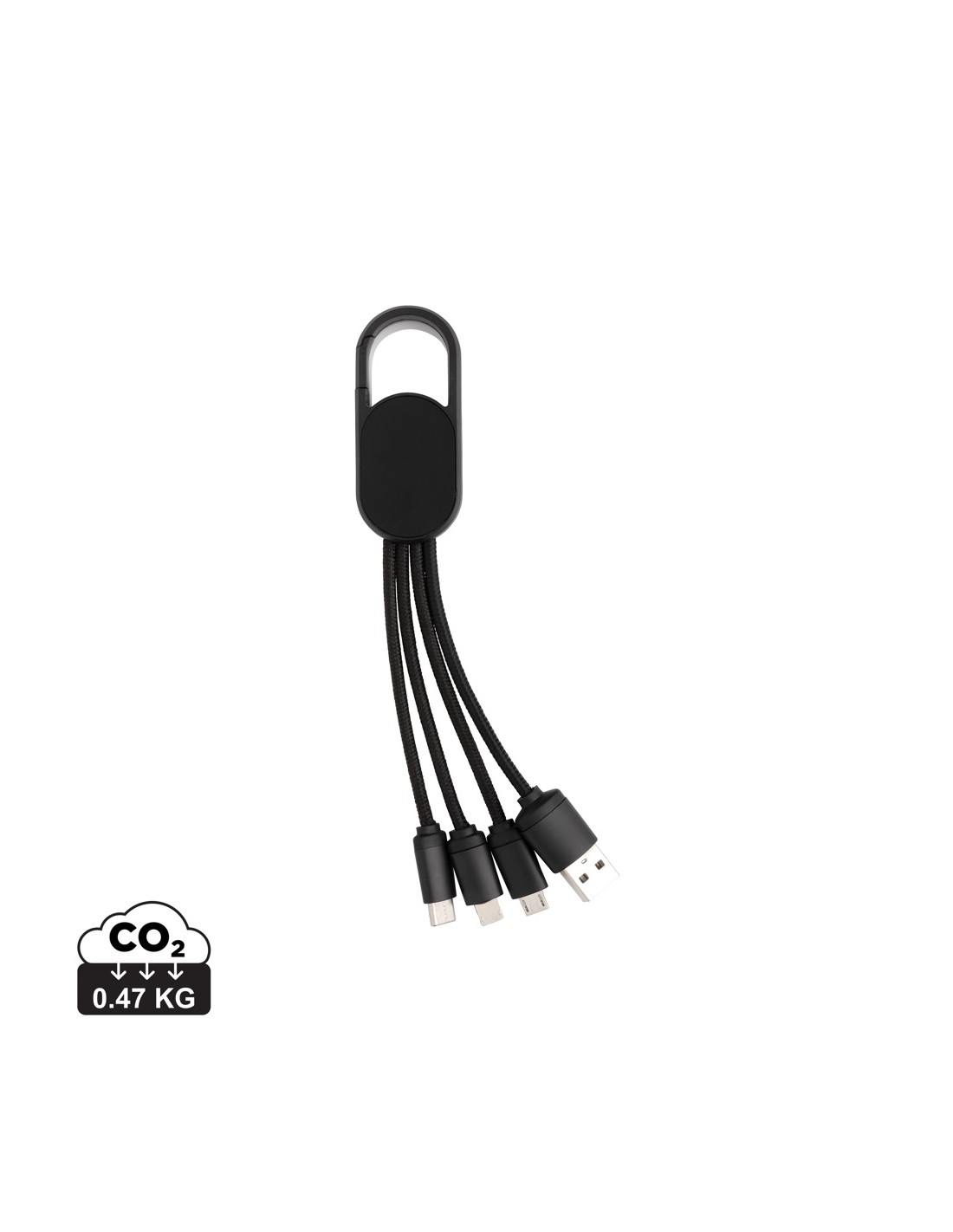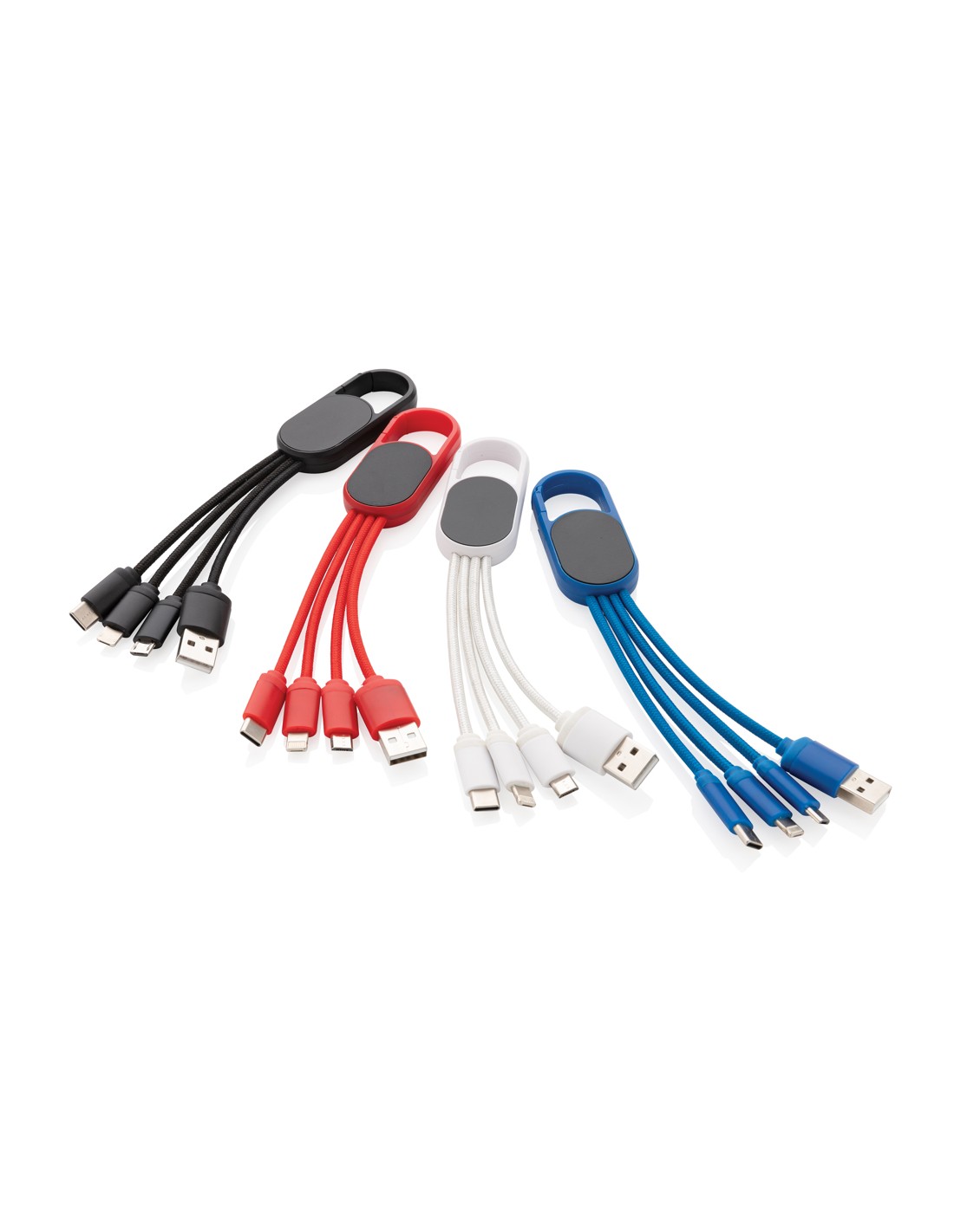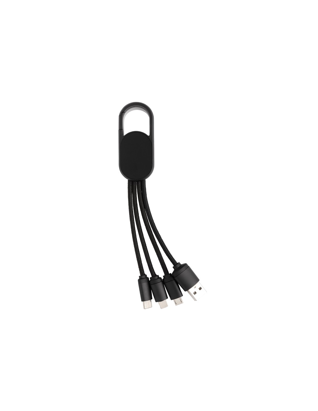 Cavo 4 in 1 con moschettone. Porta USB in input mentre in output ha un connettore doppio iOS, micro USB e type C. Adatto per la ricarica ditutti i dispositivi mobili. Struttura in ABS con cavo intrecciato in nylon da 10 cm.SUpporta la ricarica 2.1A.