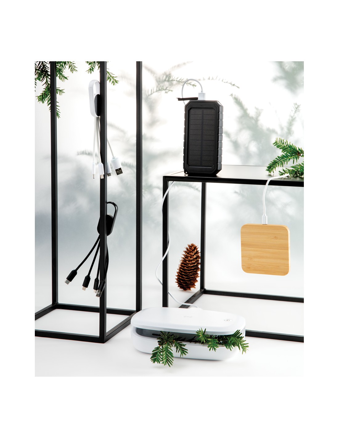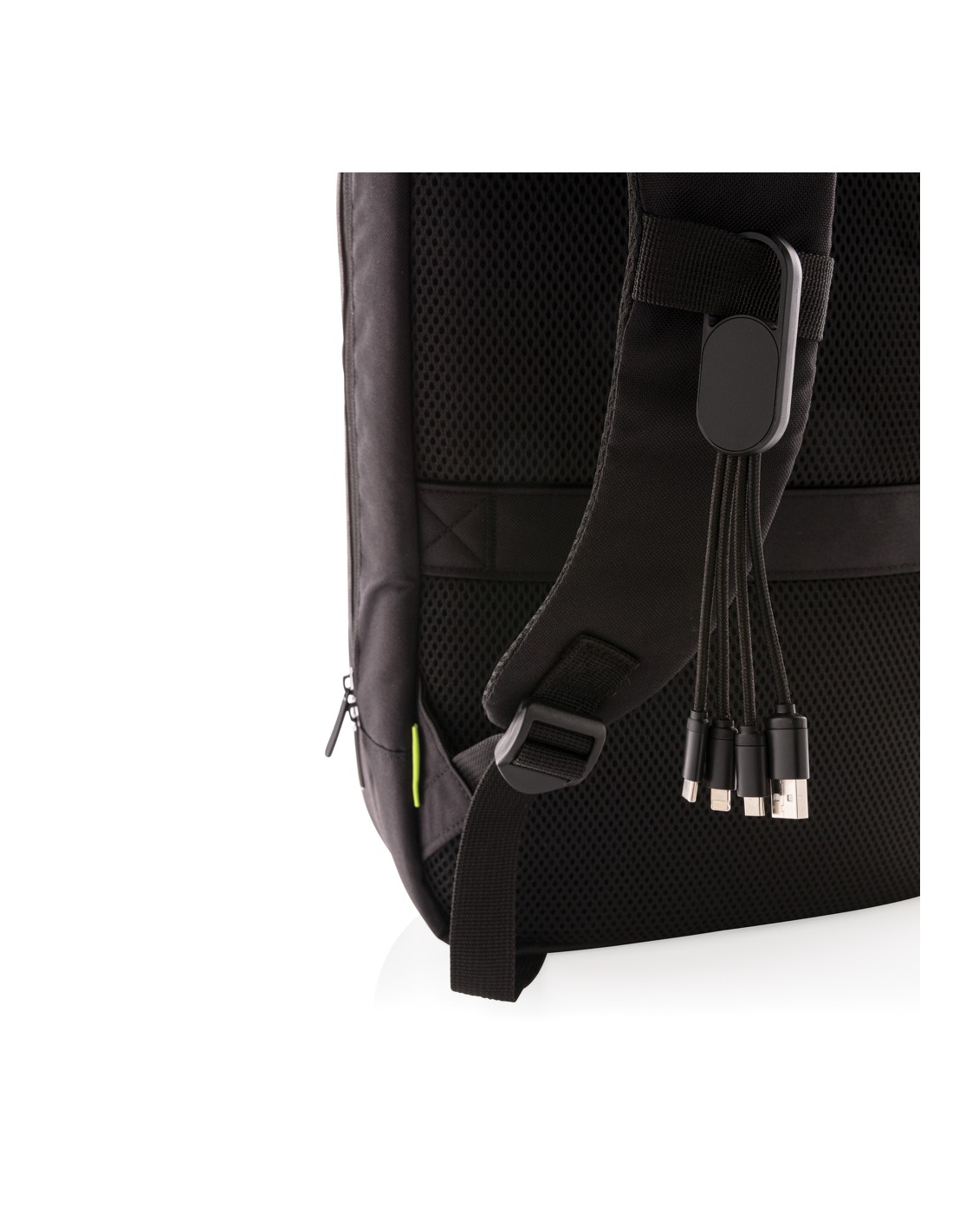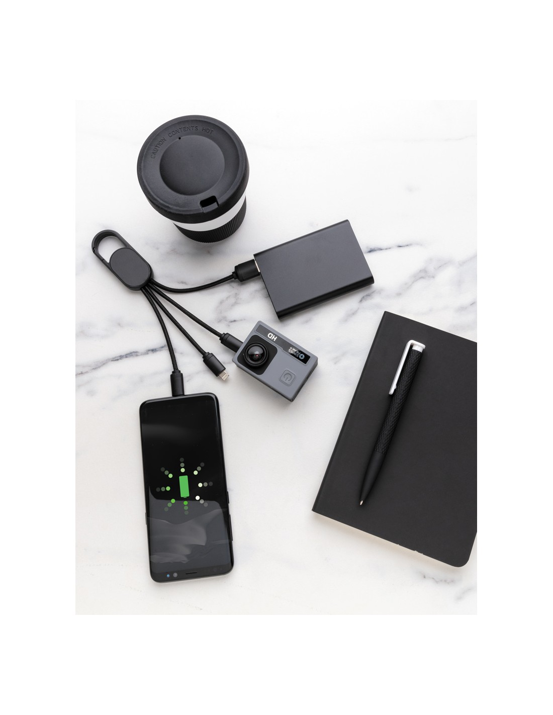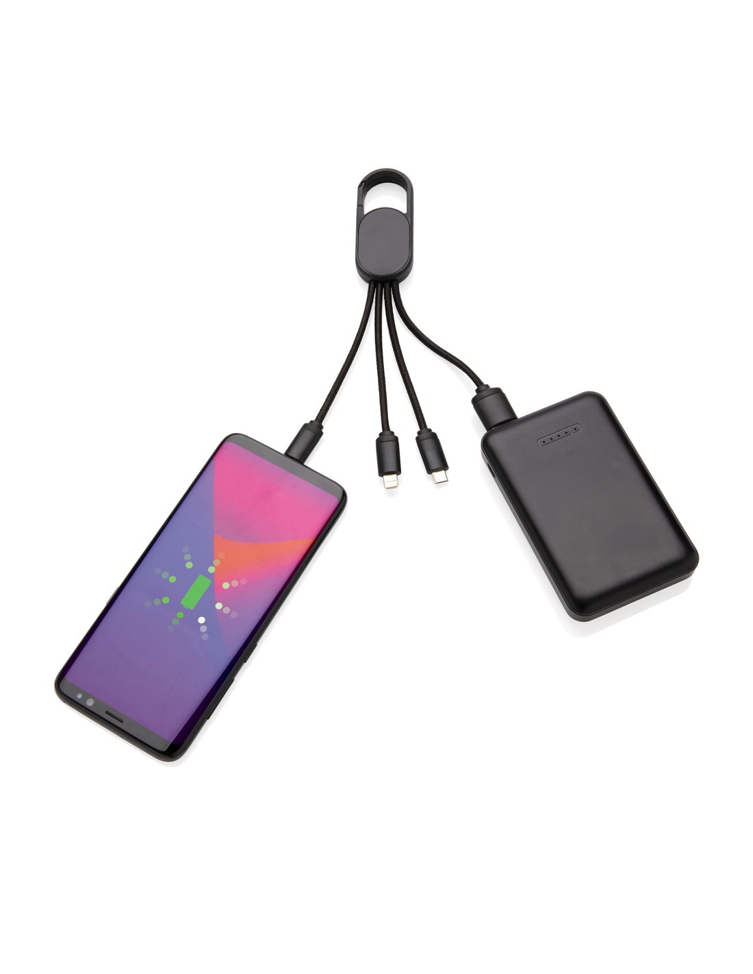 Cavo 4 in 1 con moschettone. Porta USB in input mentre in output ha un connettore doppio iOS, micro USB e type C. Adatto per la ricarica ditutti i dispositivi mobili. Struttura in ABS con cavo intrecciato in nylon da 10 cm.SUpporta la ricarica 2.1A.
