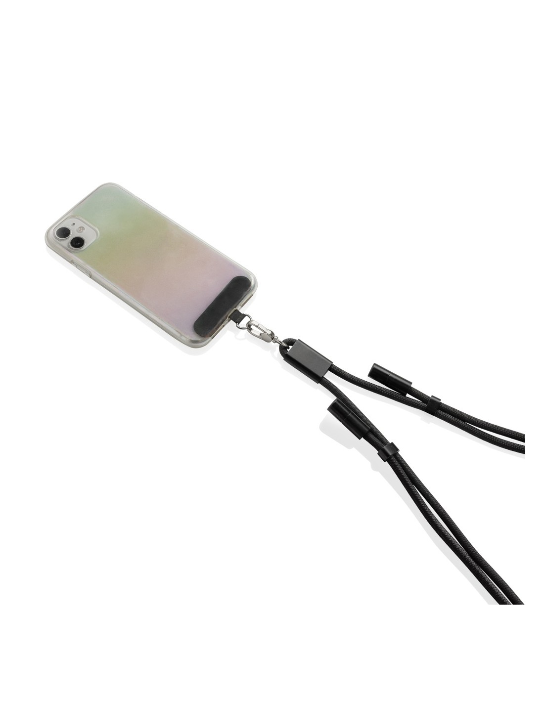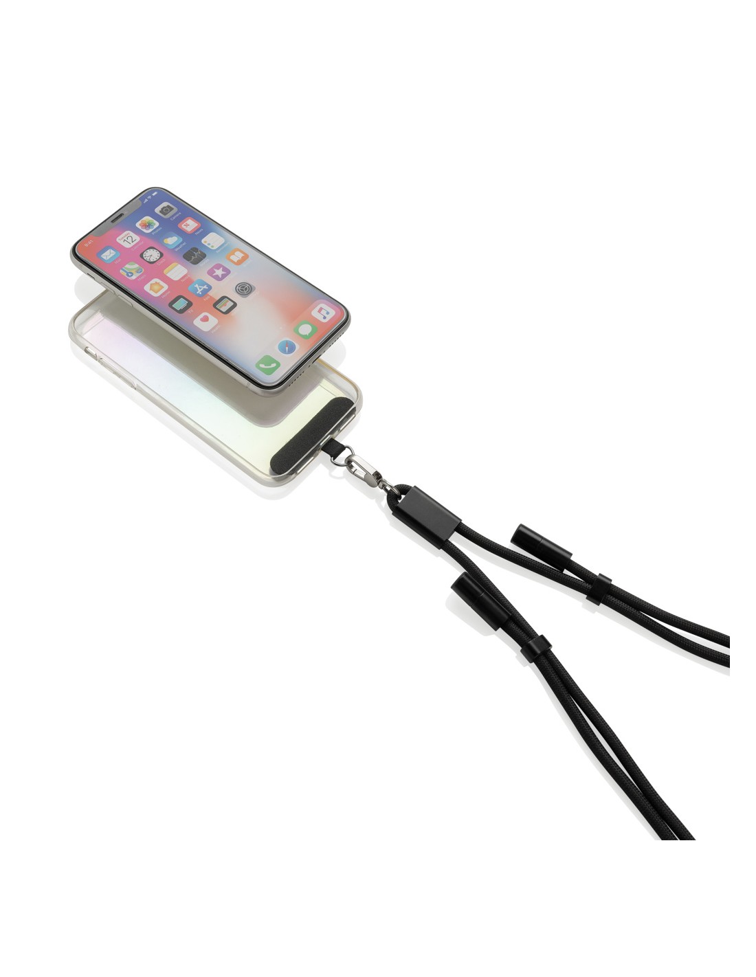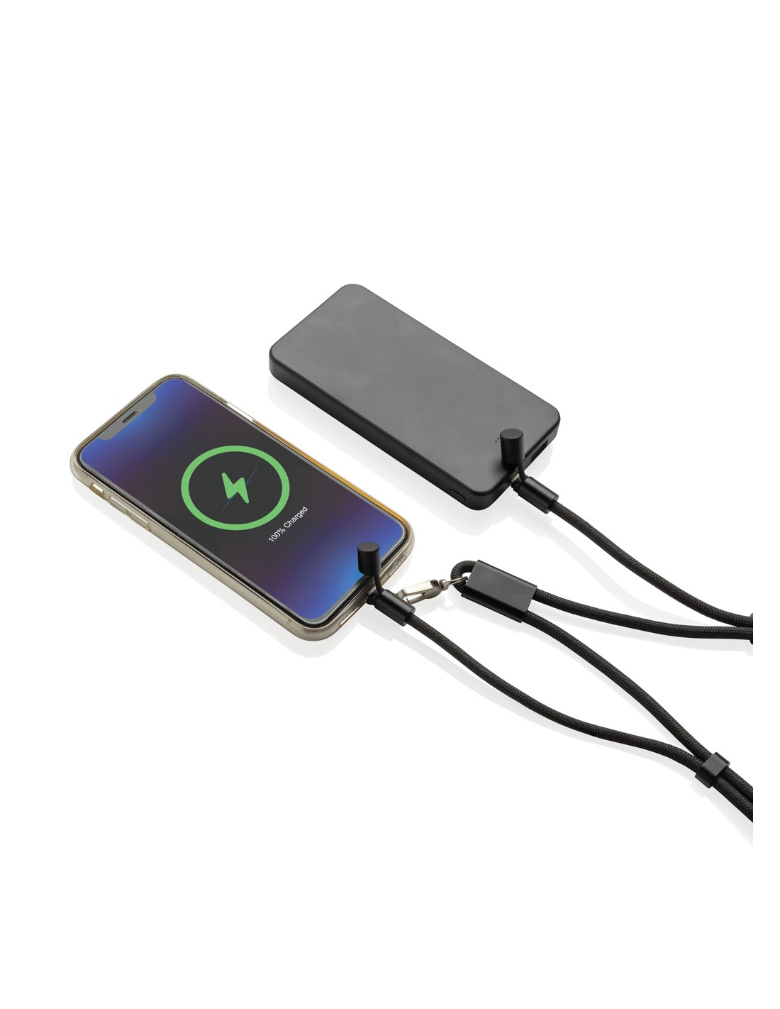 Cavo di ricarica con finitura in gomma, metallo e logo luminoso. Dotato di tre connettori (Tipo-C, Android, iPhone) e uscita USB-A e USB-C. È possibile caricare fino a tre dispositivi contemporaneamente. Lunghezza dei cavi (spine incluse): 10 cm. Lunghezza totale del cavo: 1 metro. Il cavo è...
