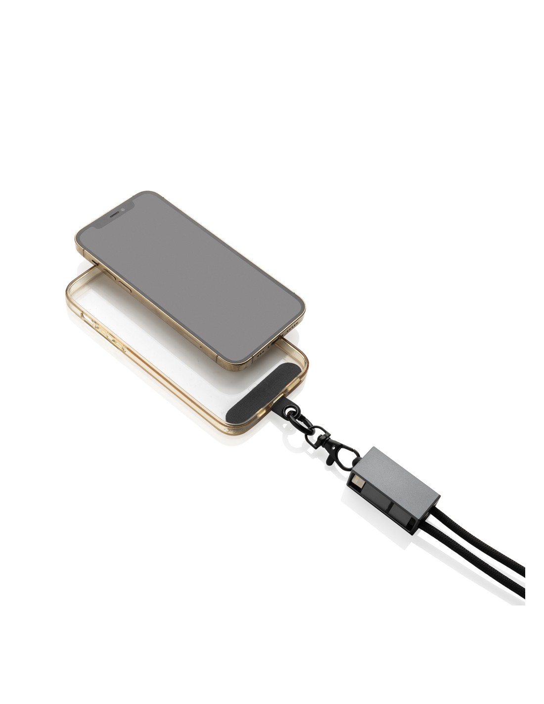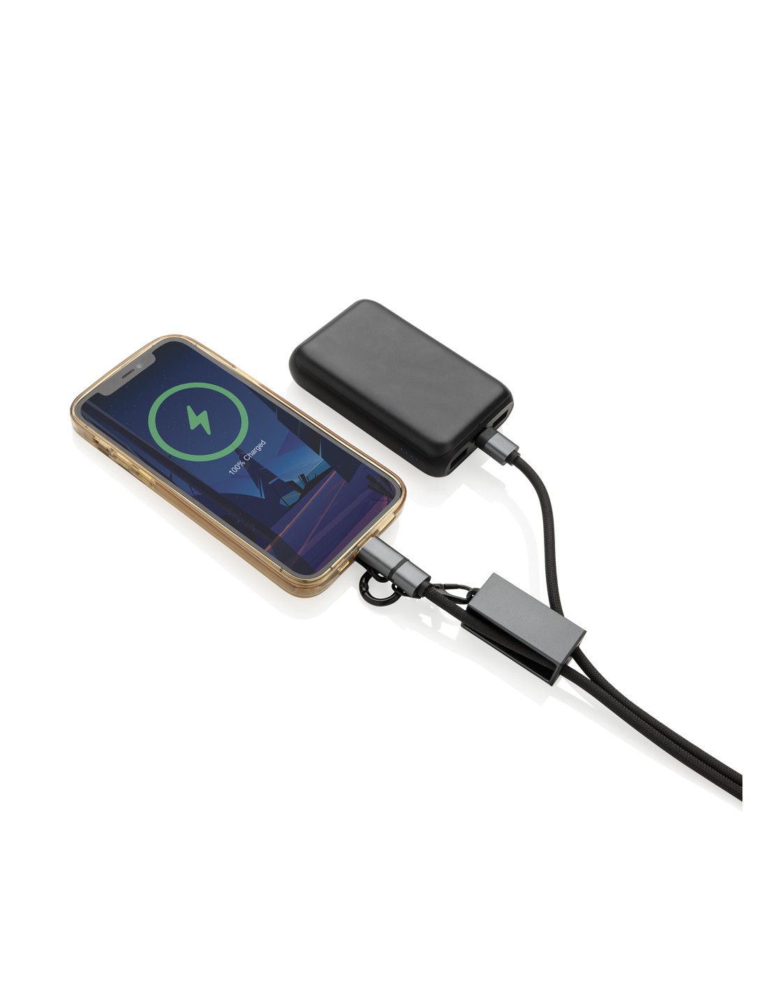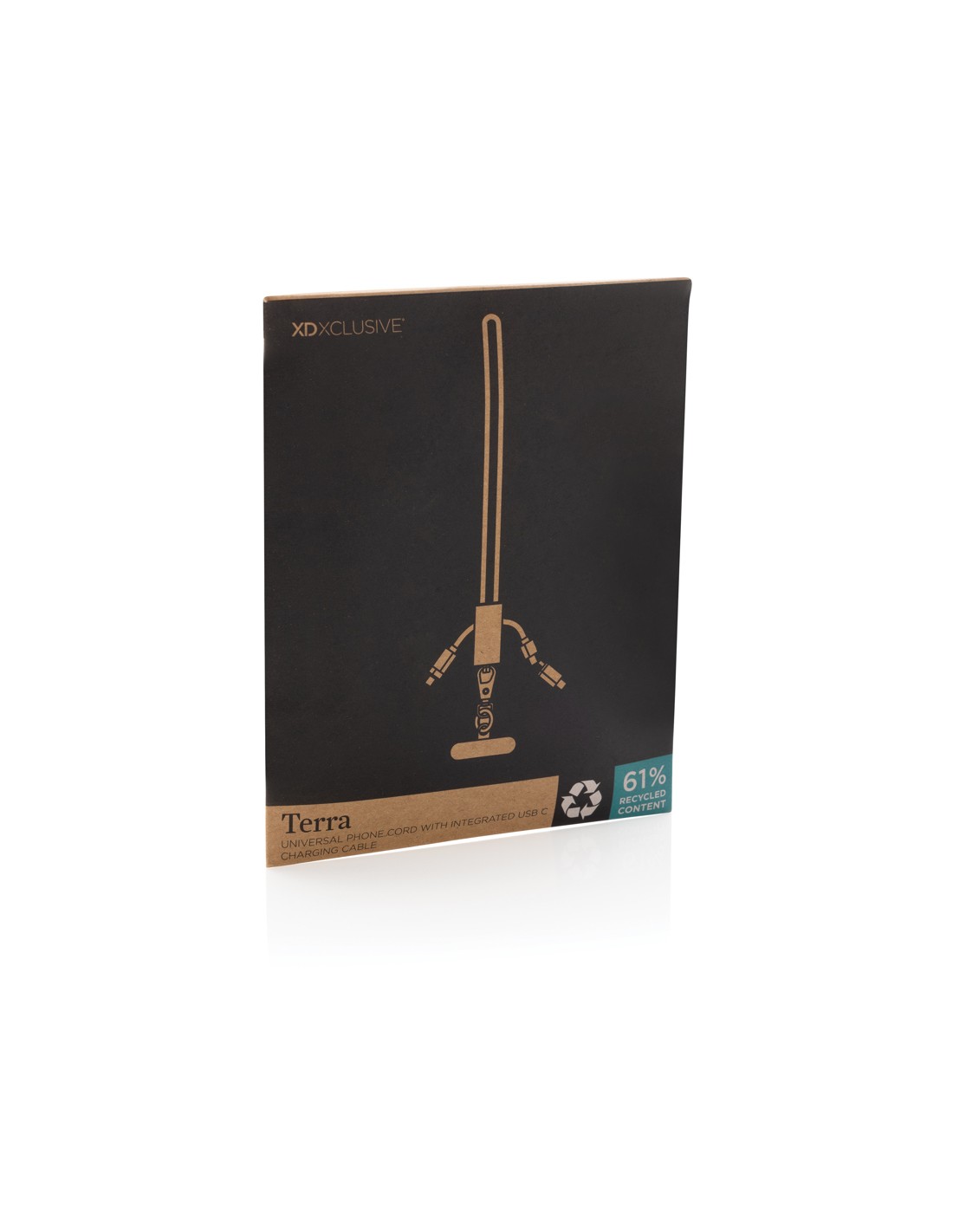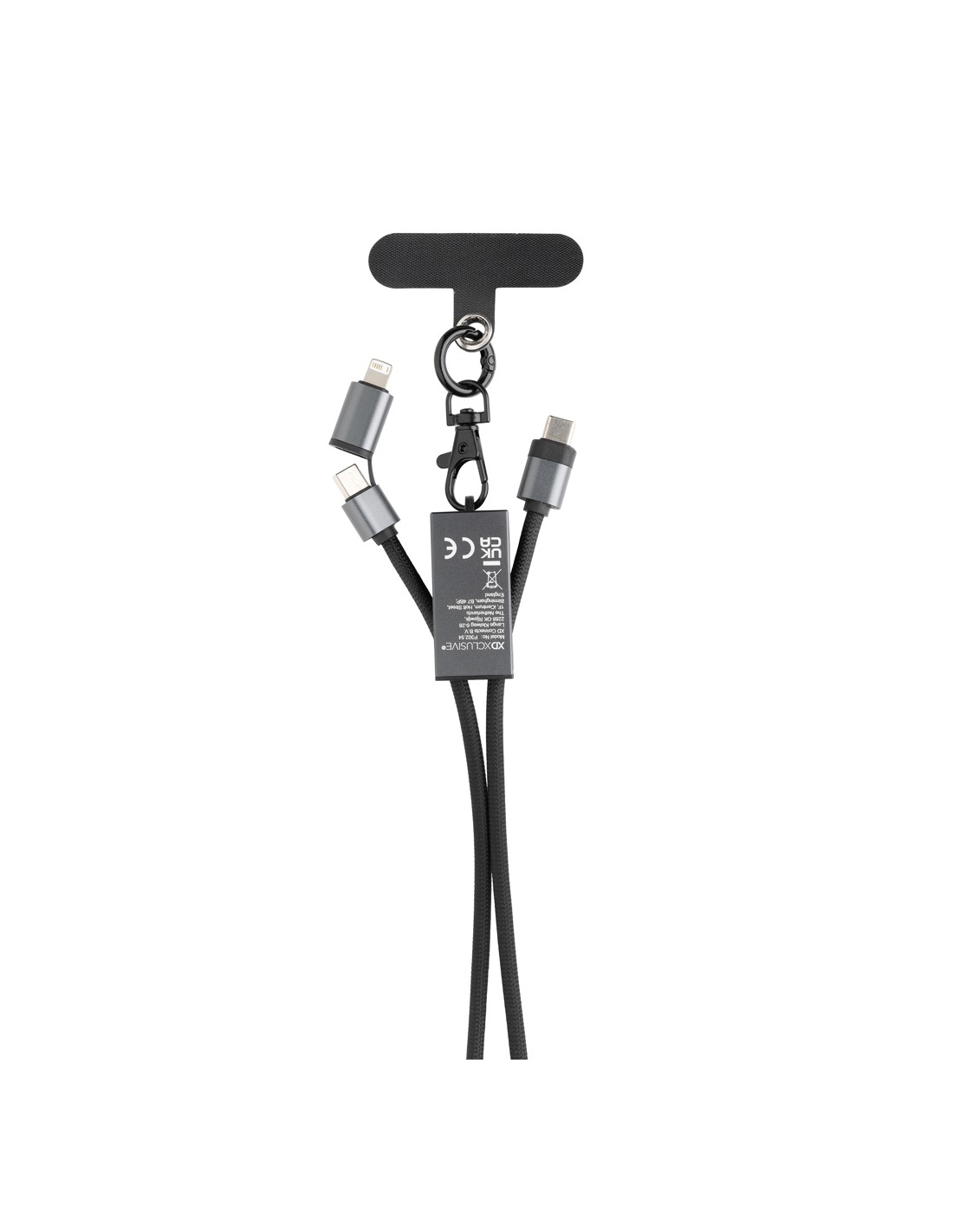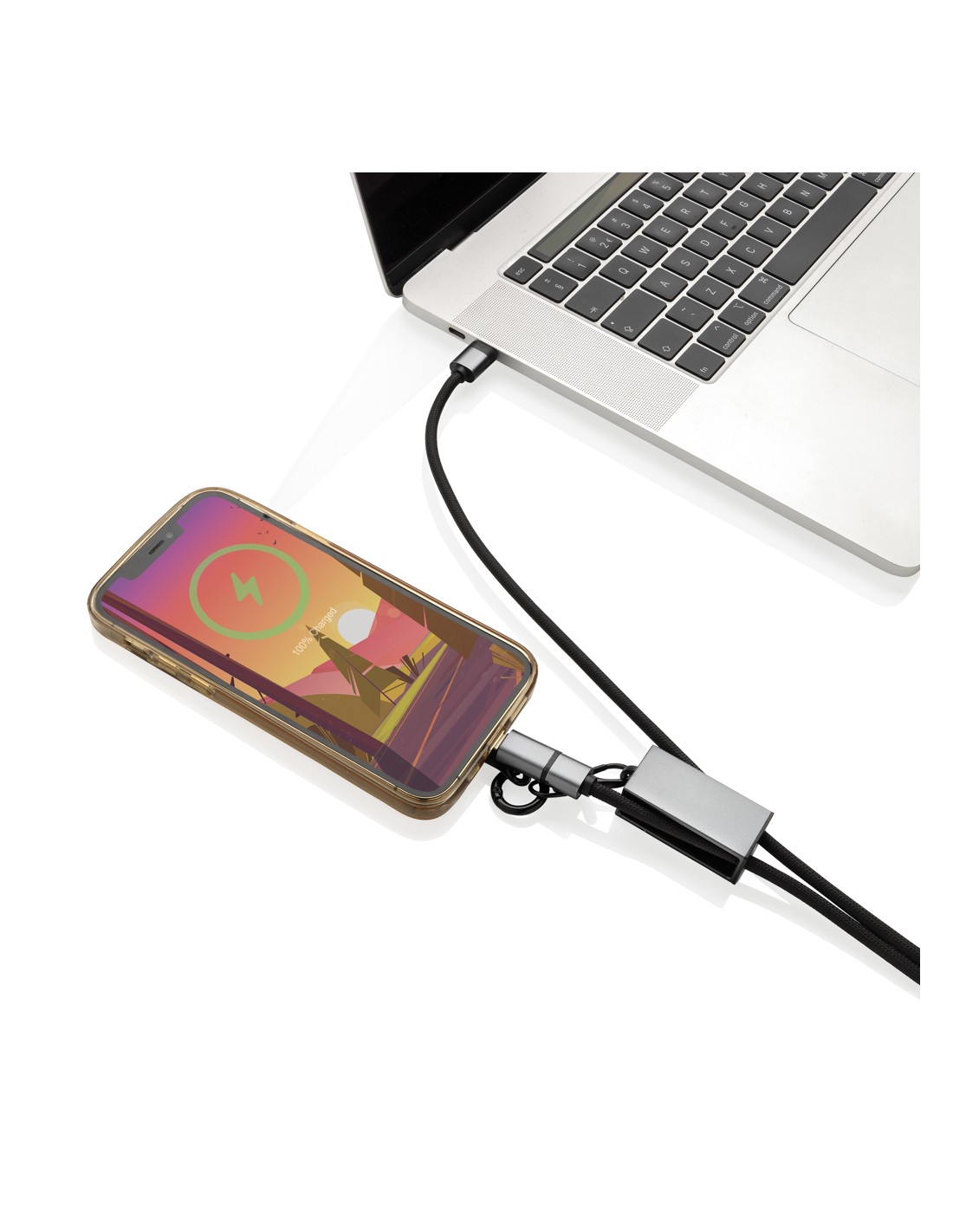 Cavo 3 in 1 da 20 W in legno con logo luminoso e 3 connettori (tipo C/micro USB/iPhone), e cavi realizzati in plastica PET riciclata. Il cavo può caricare fino a 3 dispositivi contemporaneamente. Brevetto EUIPO EUROPA.