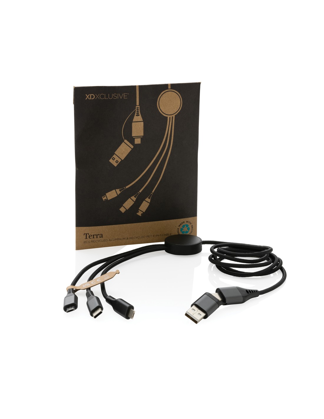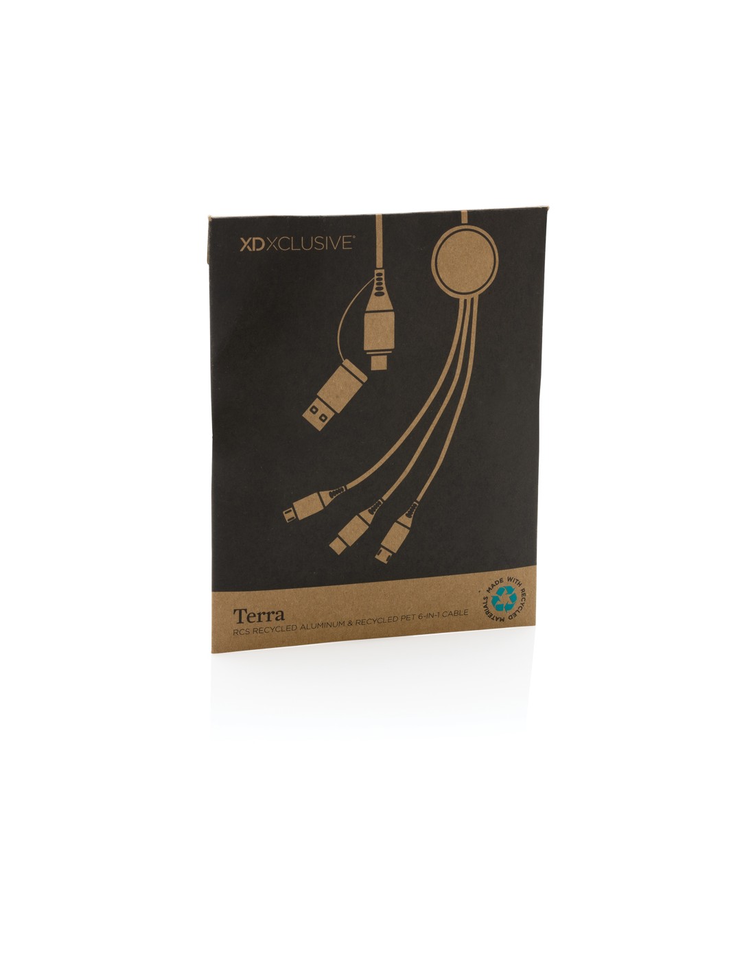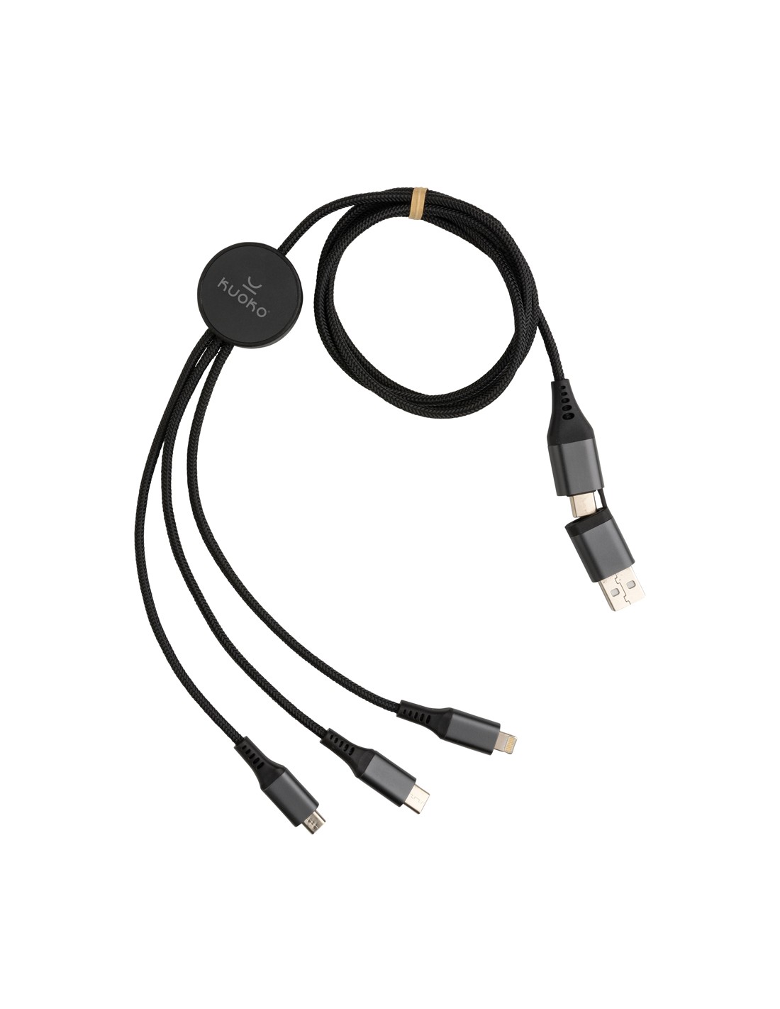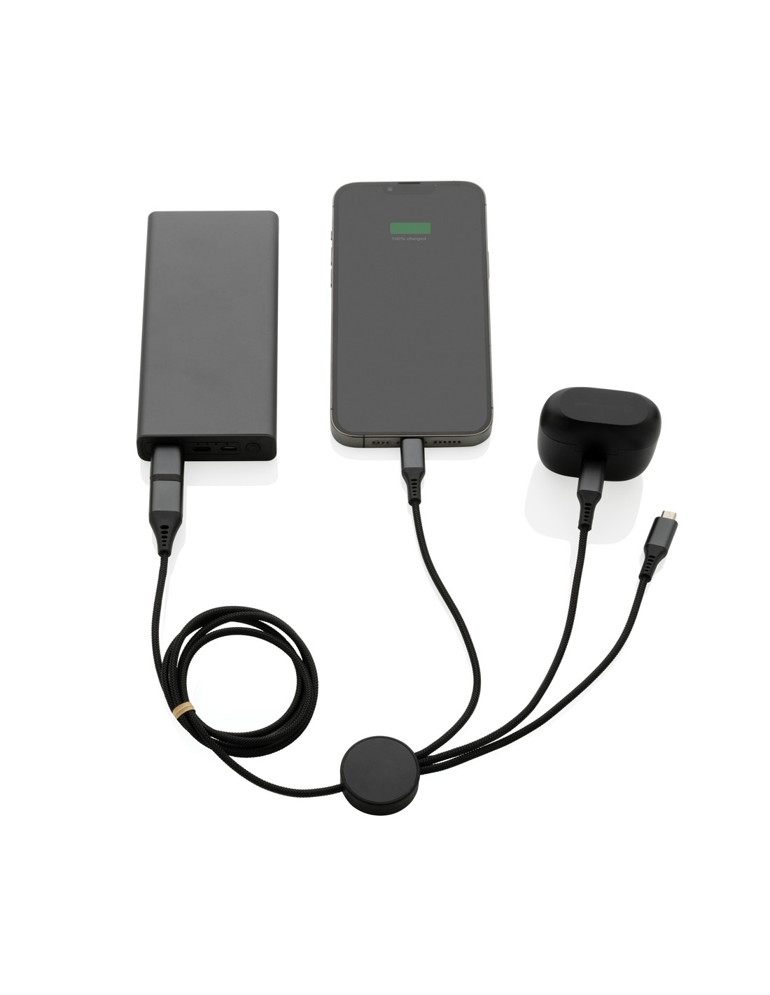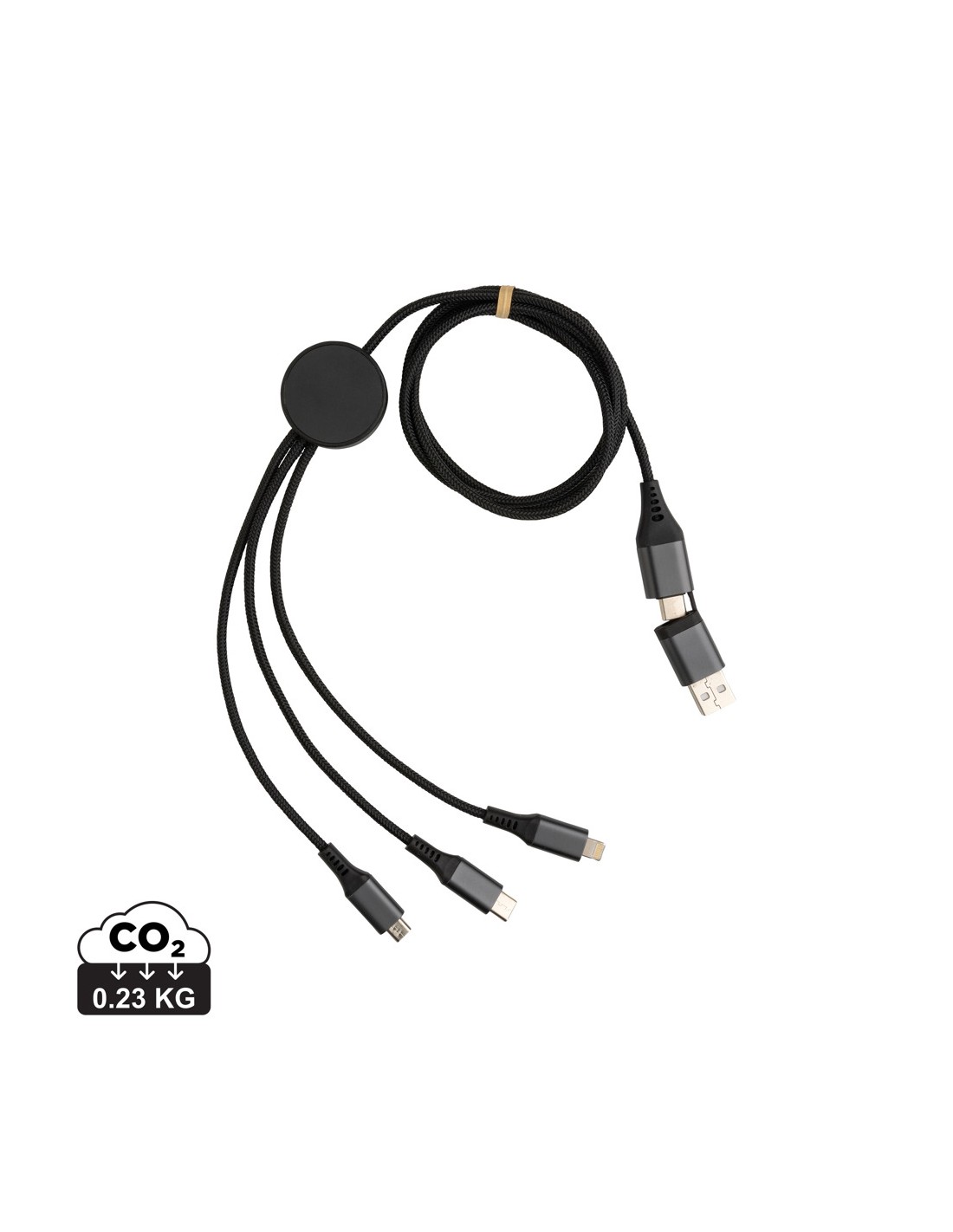 Cavo di ricarica 5 in 1 in PET riciclato con logo luminoso e stazione di ricarica in bambù da 10 W. Dispone di 3 connettori (tipo C, micro USB, iPhone) e di un connettore USB doppio per uso universale. Fornito in un astuccio in TPU, con un biglietto in carta kraft. Lunghezza del cavo: 1 metro....